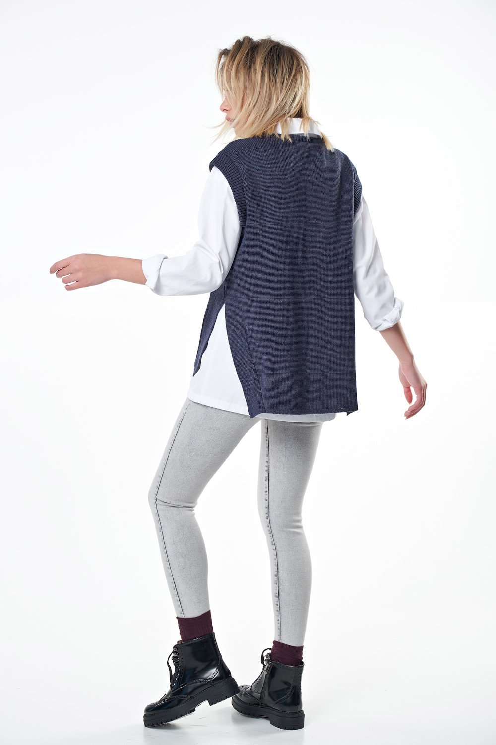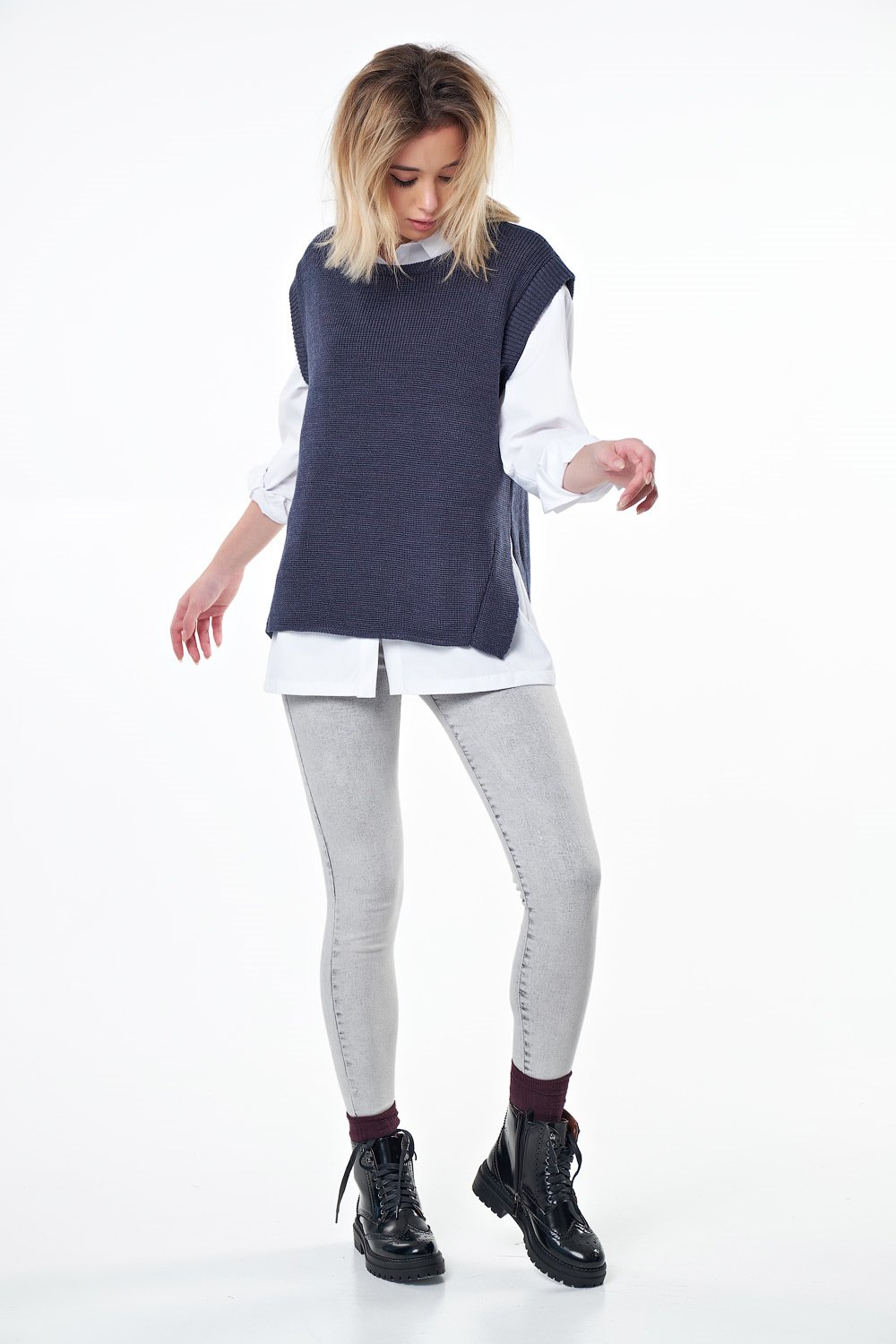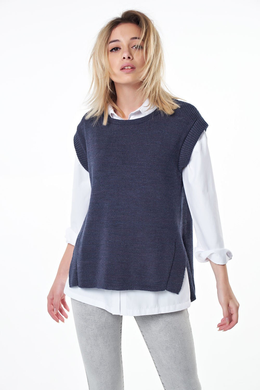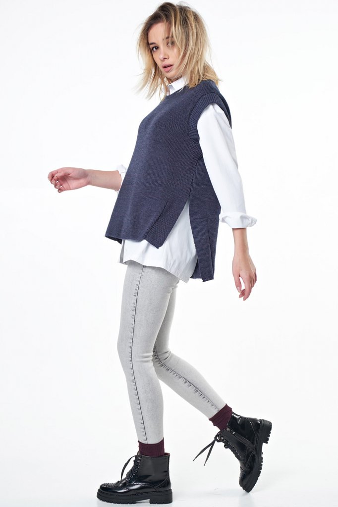 • Особенности: Вязаный жилет свободного силуэта из фактурной вязки с разрезами по бокам и ассиметричным низом.