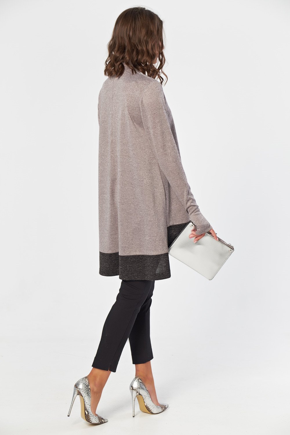 • Особенности: Туника свободного силуэта из трикотажа с люрексом. Детали: удлиненный зауженный рукав с отверстием для пальца, воротник-стойка, спинка удлинена относительно переда на 10 см, в боковых швах выполнены разрезы, по низу туники выполнена широкая полоса контрастного цвета. Застежка в среднем шве спинки на молнию.