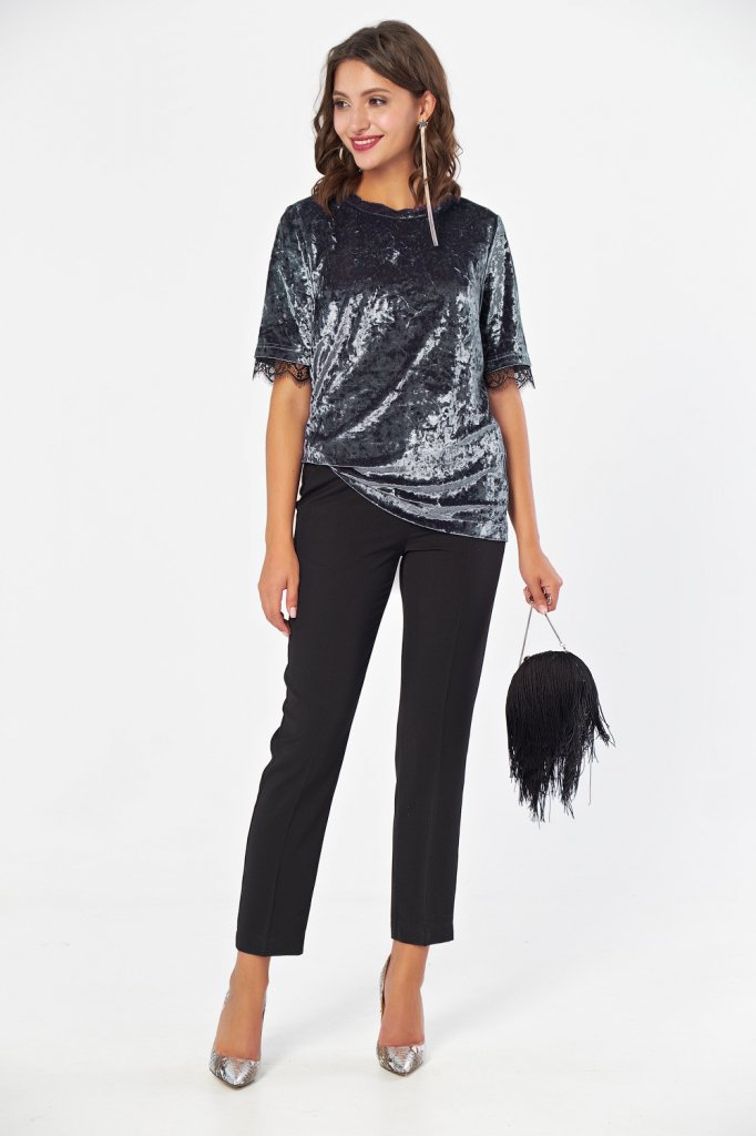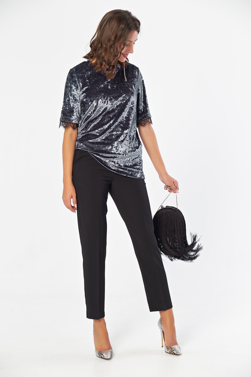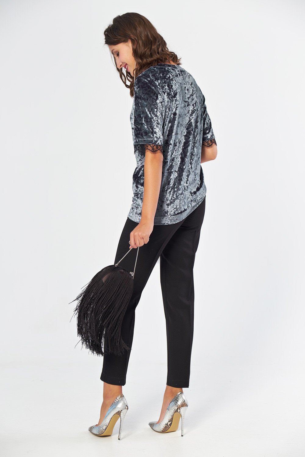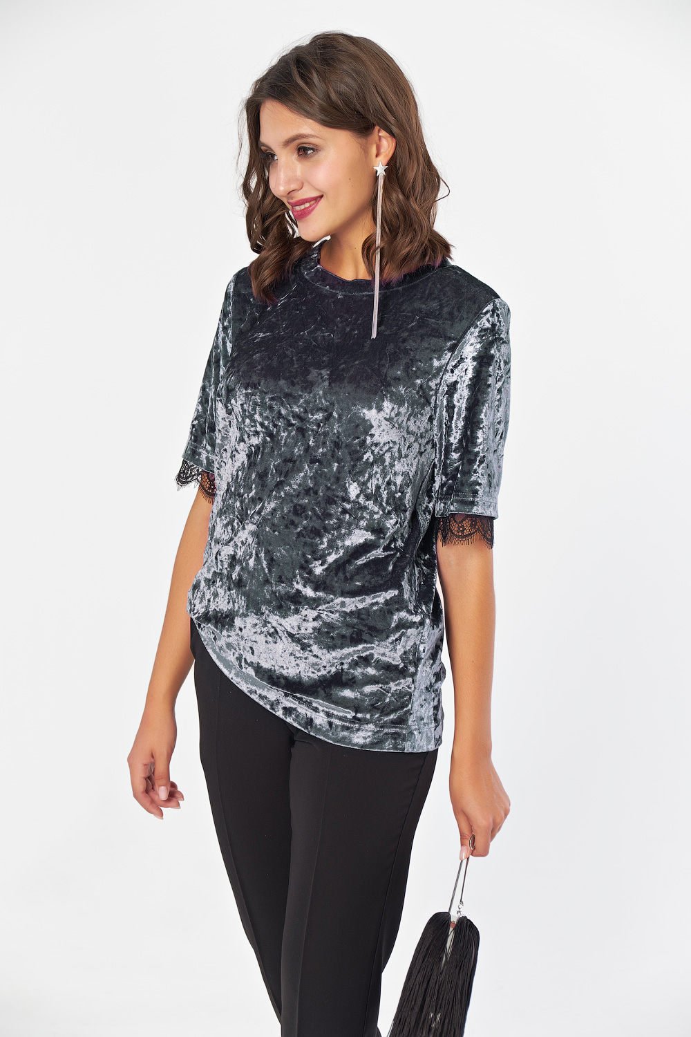• Особенности: Футболка прямого силуэта из бархата. Детали: горловина обработана бейкой, рукав втачной с отделкой кружевом по низу.