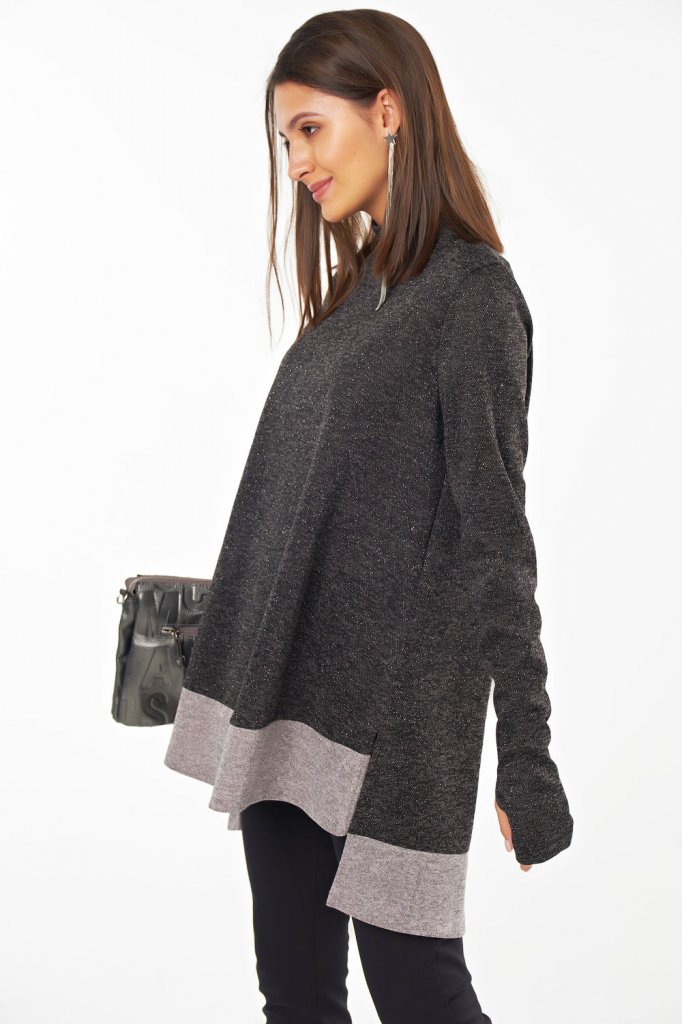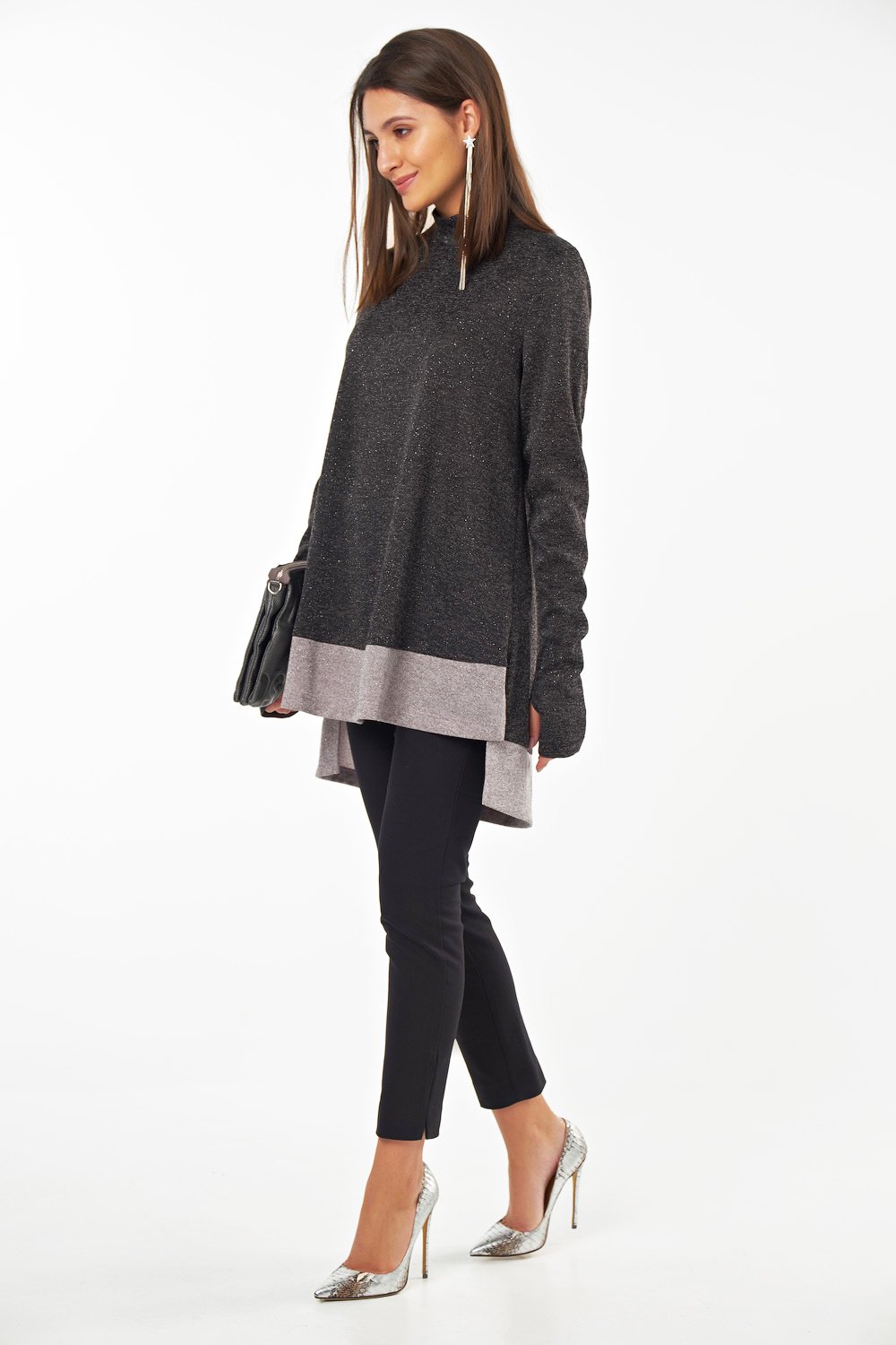 • Особенности: Туника свободного силуэта из трикотажа с люрексом. Детали: удлиненный зауженный рукав с отверстием для пальца, воротник-стойка, спинка удлинена относительно переда на 10 см, в боковых швах выполнены разрезы, по низу туники выполнена широкая полоса контрастного цвета. Застежка в среднем шве спинки на молнию.