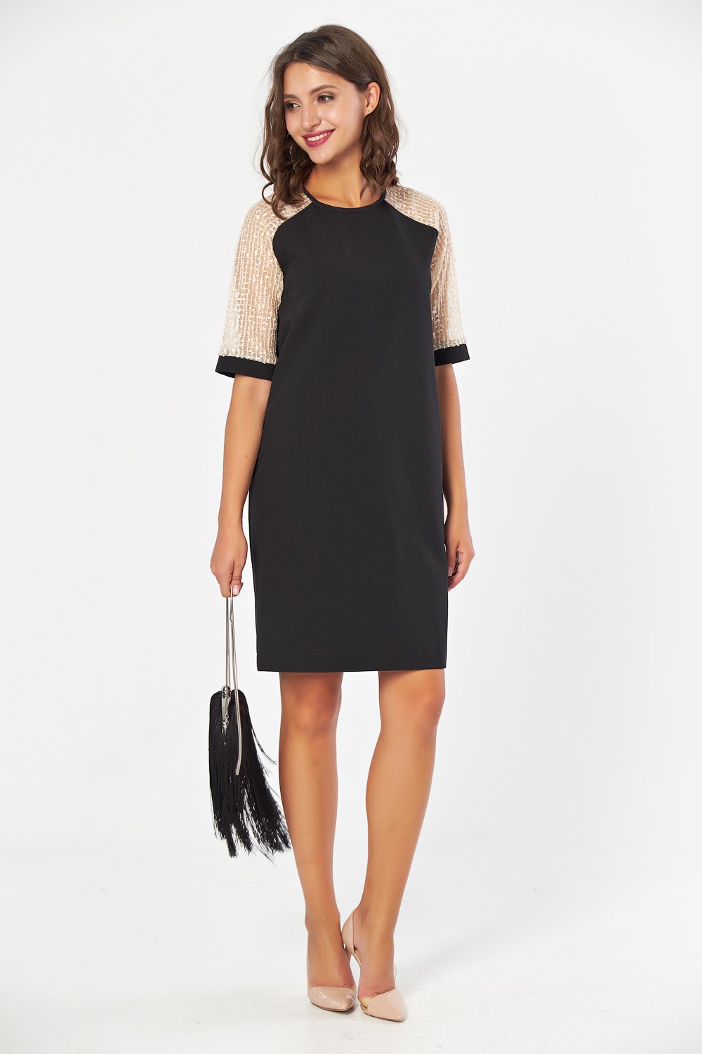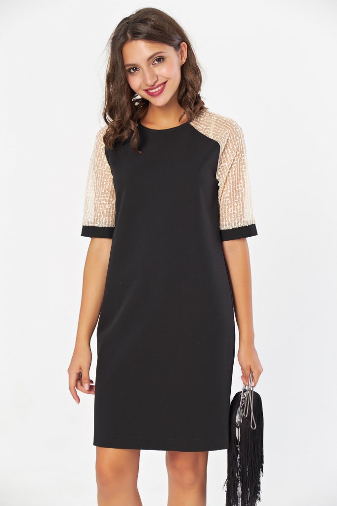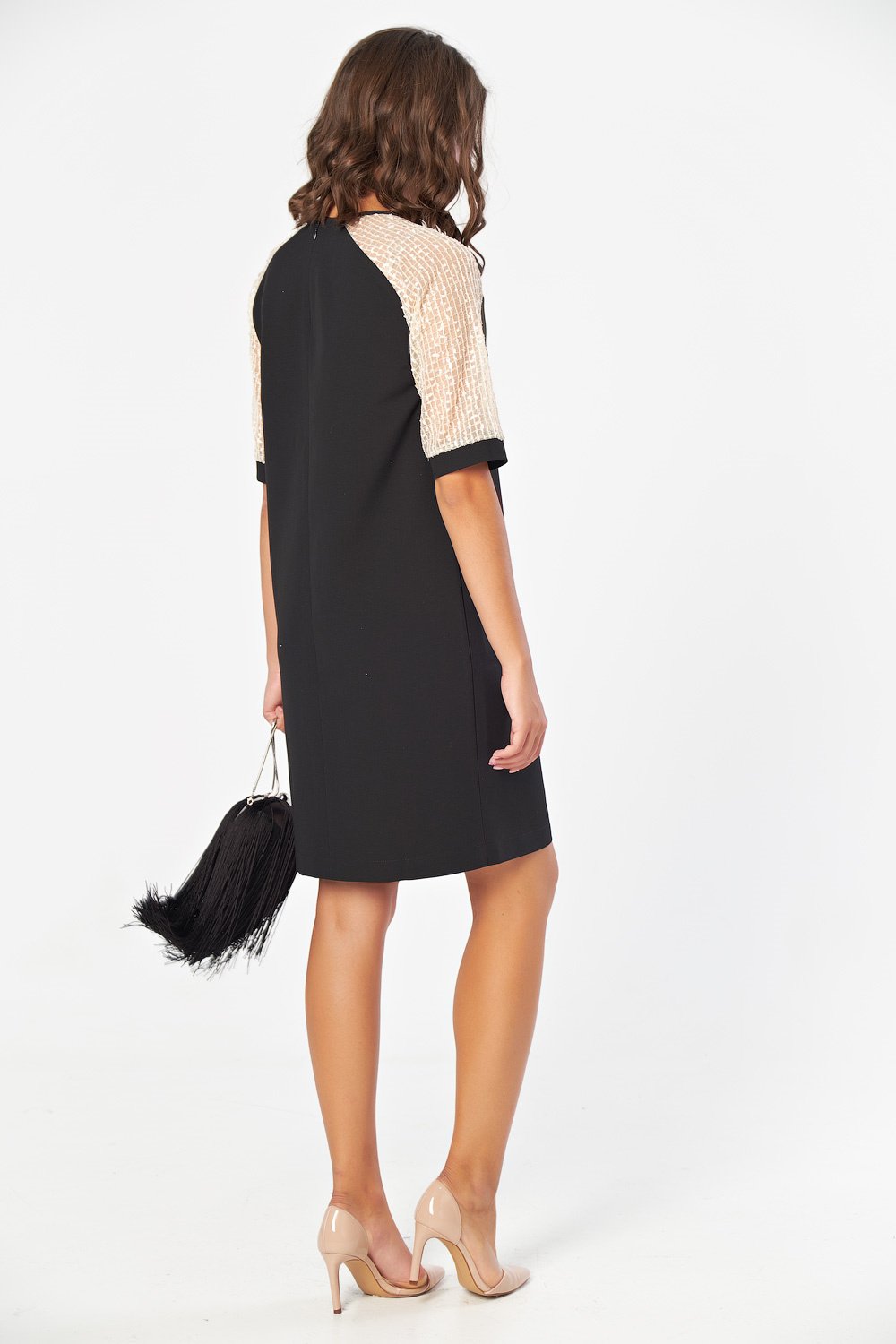 • Особенности: Платье прямого силуэта из костюмной ткани. Детали: рукав-реглан выполнен из кружева, притачные манжеты, горловина округлой формы, обработана бейкой.