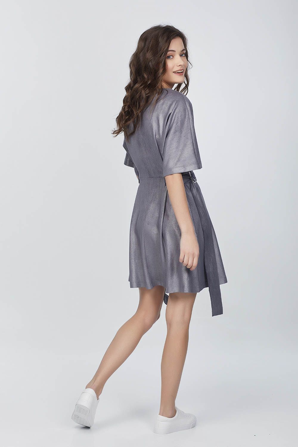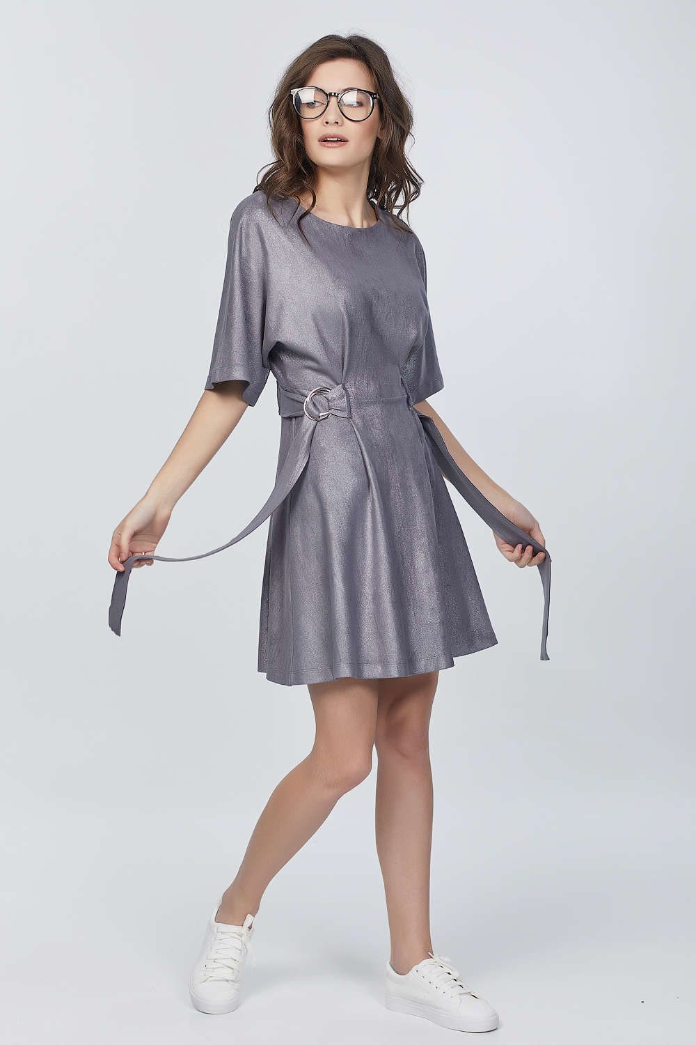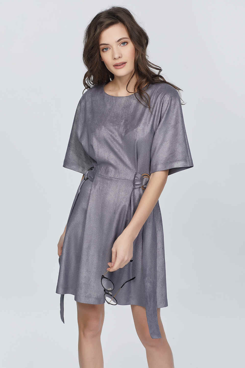 • Особенности: Платье свободного силуэта из трикотажной замши. Детали: цельнокроенный рукав длиной до локтя, два притачных полупояса по линии талии, декоративные кольца, горловина обработана обтачкой. Без застежки.