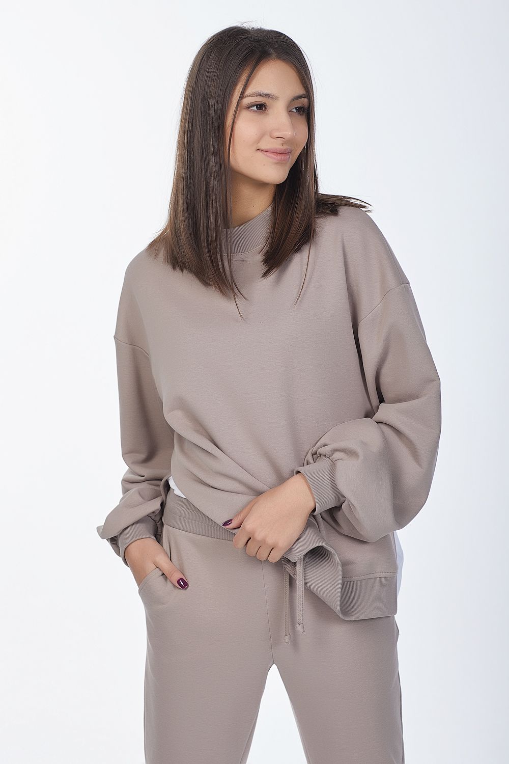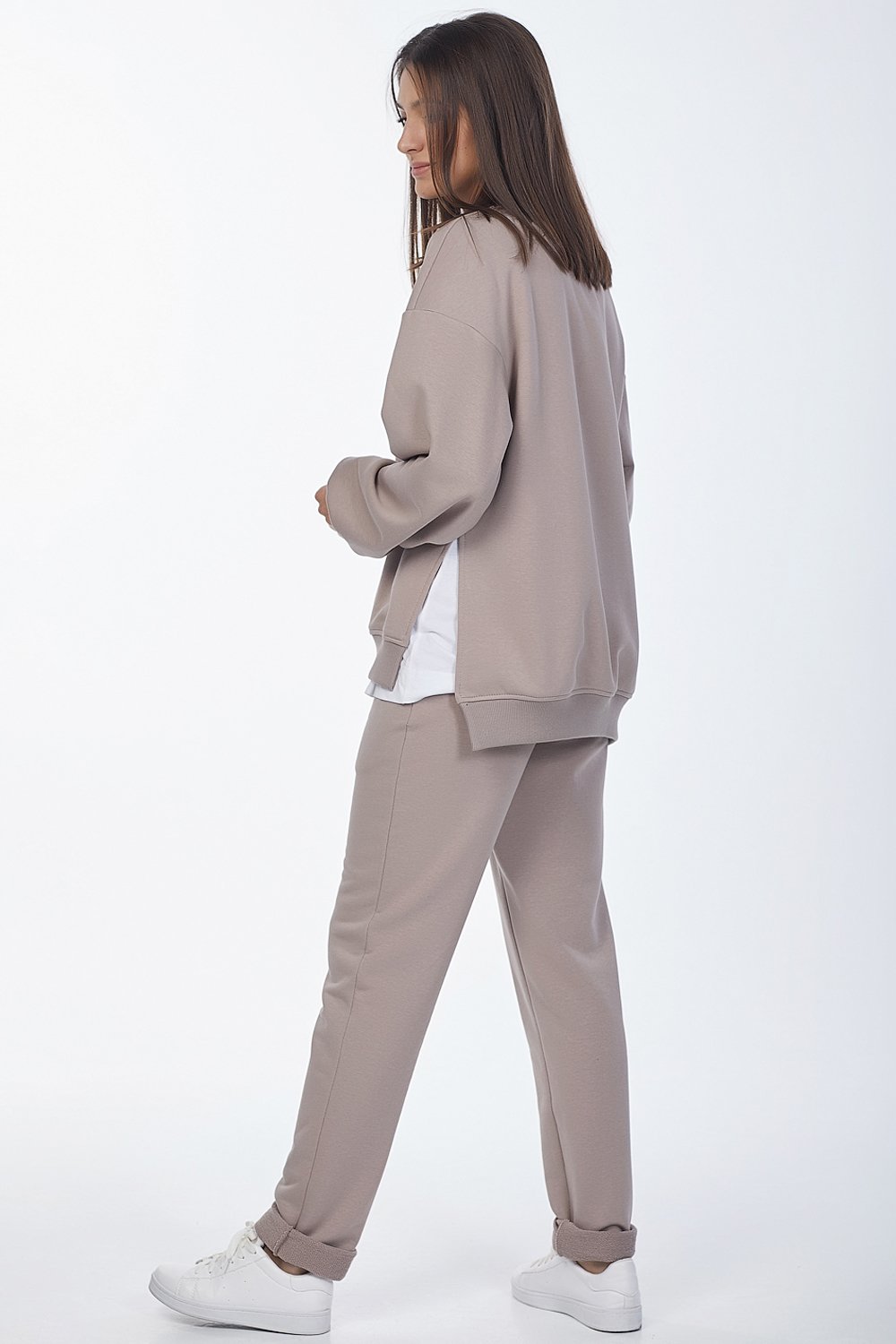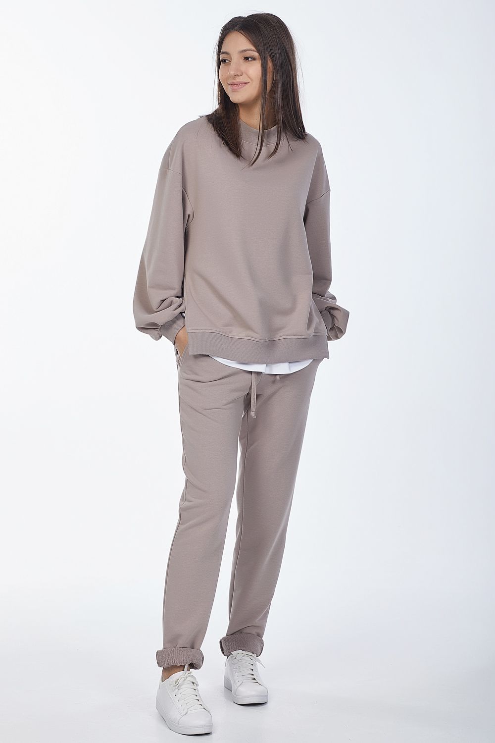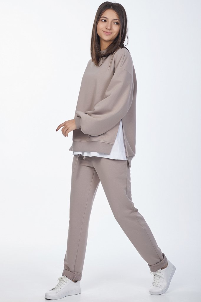 • Особенности: Костюм состоит из свитшота и брюк. Свитшот: свободного силуэта, объемный рукав на манжете, прилегающий воротник-стойка, разрезы в боковых швах. Брюки: полуприлегающего силуэта с брючными карманами и притачным поясом.