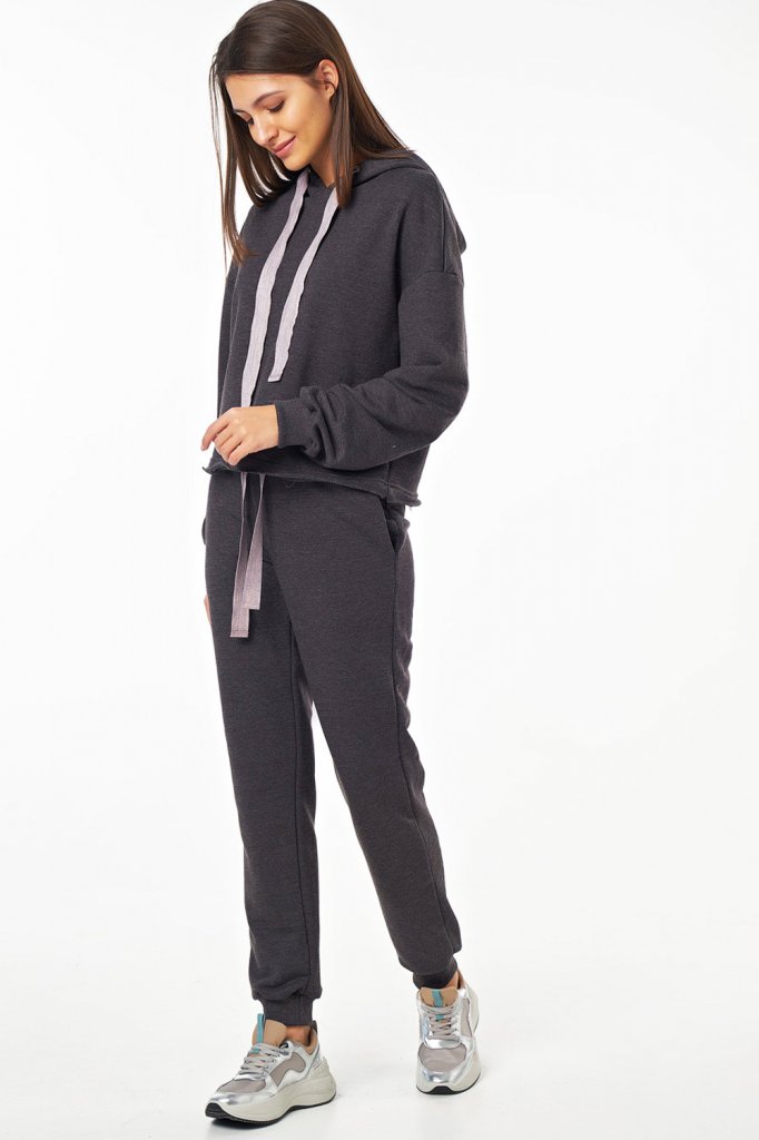 • Особенности: Костюм из футера с отделкой кашкорсе. Свитшот прямого силуэта, объемный. Детали: капюшон со шнурком, спущенная пройма, манжеты рукавов из кашкорсе, понизу открытый срез укрепленный отделочной строчкой и притачанной полоской из футера. Брюки свободные с высокой посадкой на талии. Детали: пояс и манжеты выполнены из кашкорсе, в пояс продет шнур, карманы в боковых швах.