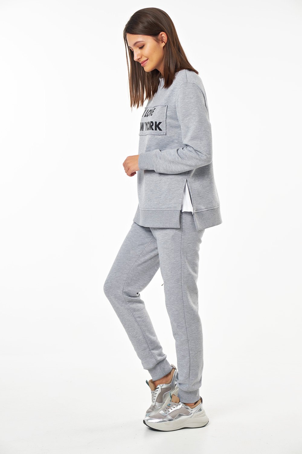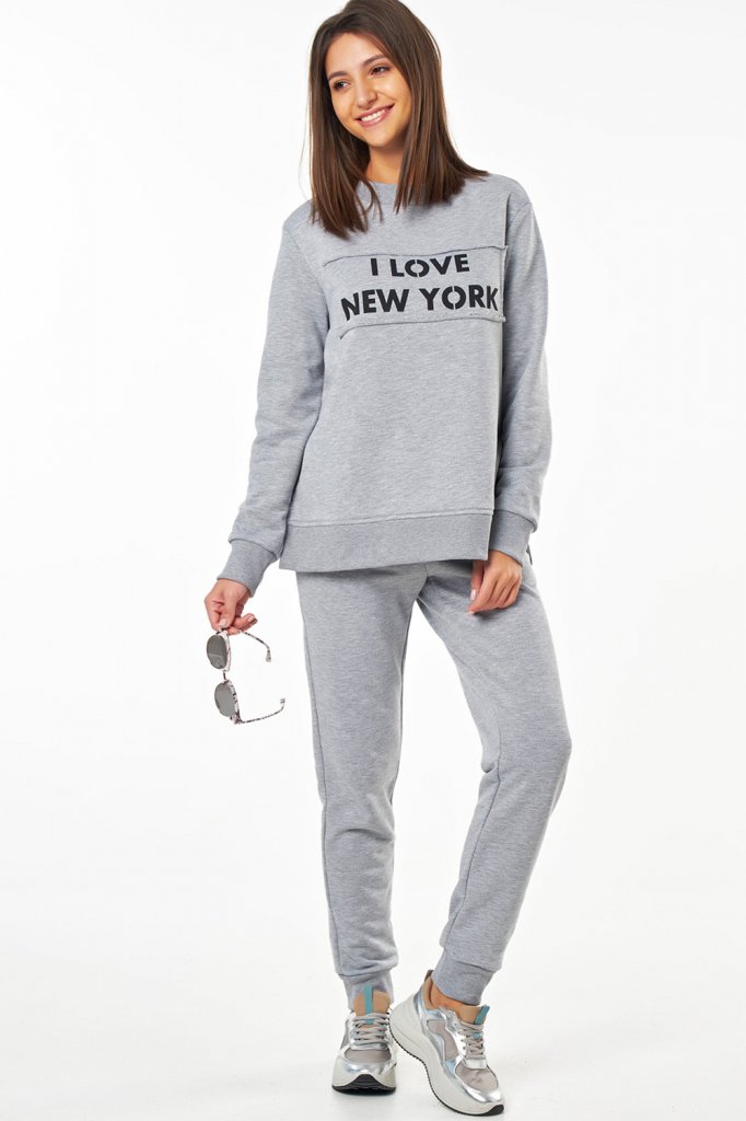 • Особенности: Костюм состоит из свитшота и брюк. Свитшот: свободного силуэта, втачным рукав на манжете, разрезы в боковых швах, по переду выполнен принт. Брюки: полуприлегающего силуэта с брючными карманами и притачным поясом.