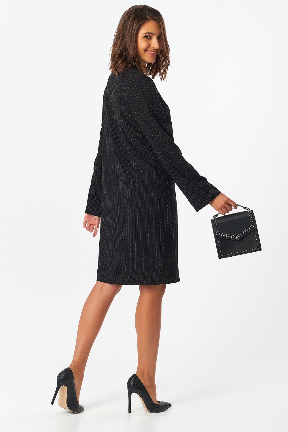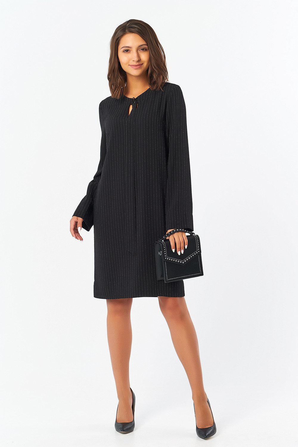 • Особенности: Платье прямого силуэта из креповой ткани в тонкую полоску. Детали: округлая форма горловины, по горловине отделка с двумя полукольцами и длинной завязкой, рукав втачной с широкой подгибкой слегка расклешенный, по низу изделия - широкая подгибка.