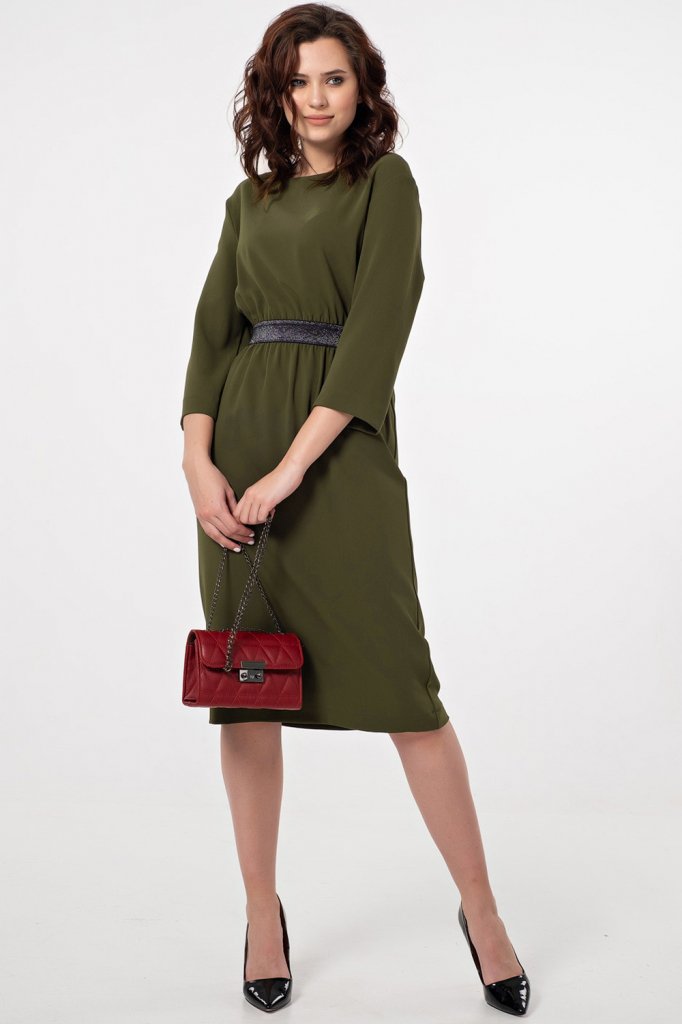 • Особенности: Платье полуприлегающего силуэта из плательной ткани с декоративным поясом-резинкой по талии. Детали: горловина округлой формы, спущенная пройма, рукав 3/4.