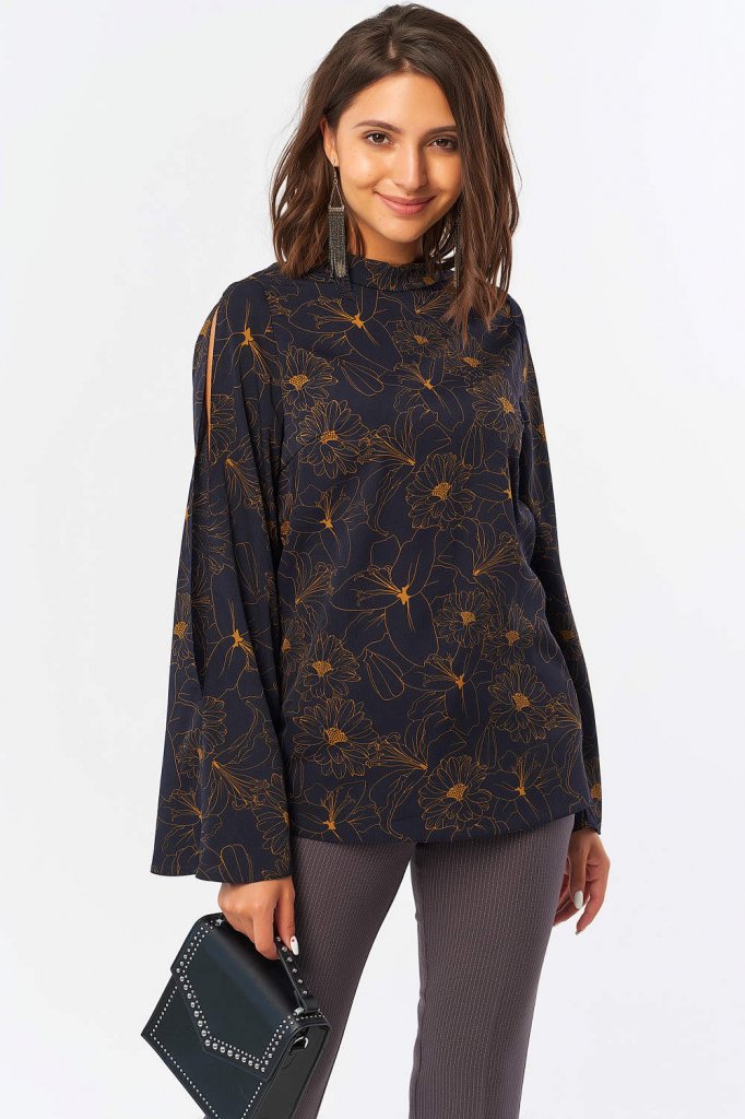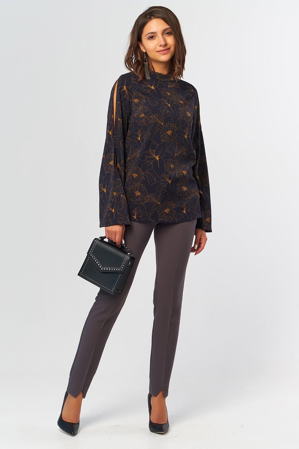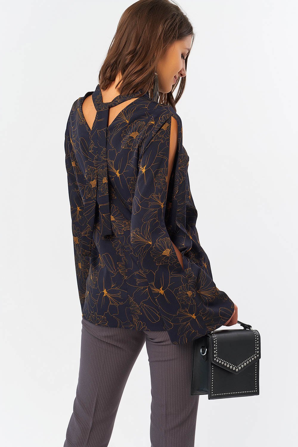 • Особенности: Блузка прямого силуэта из блузочной ткани. Детали: расклешеный рукав с щелью по среднему шву, V-образный вырез горловины по спинке, воротник-стойка переходящий в завязки. Без застежки.