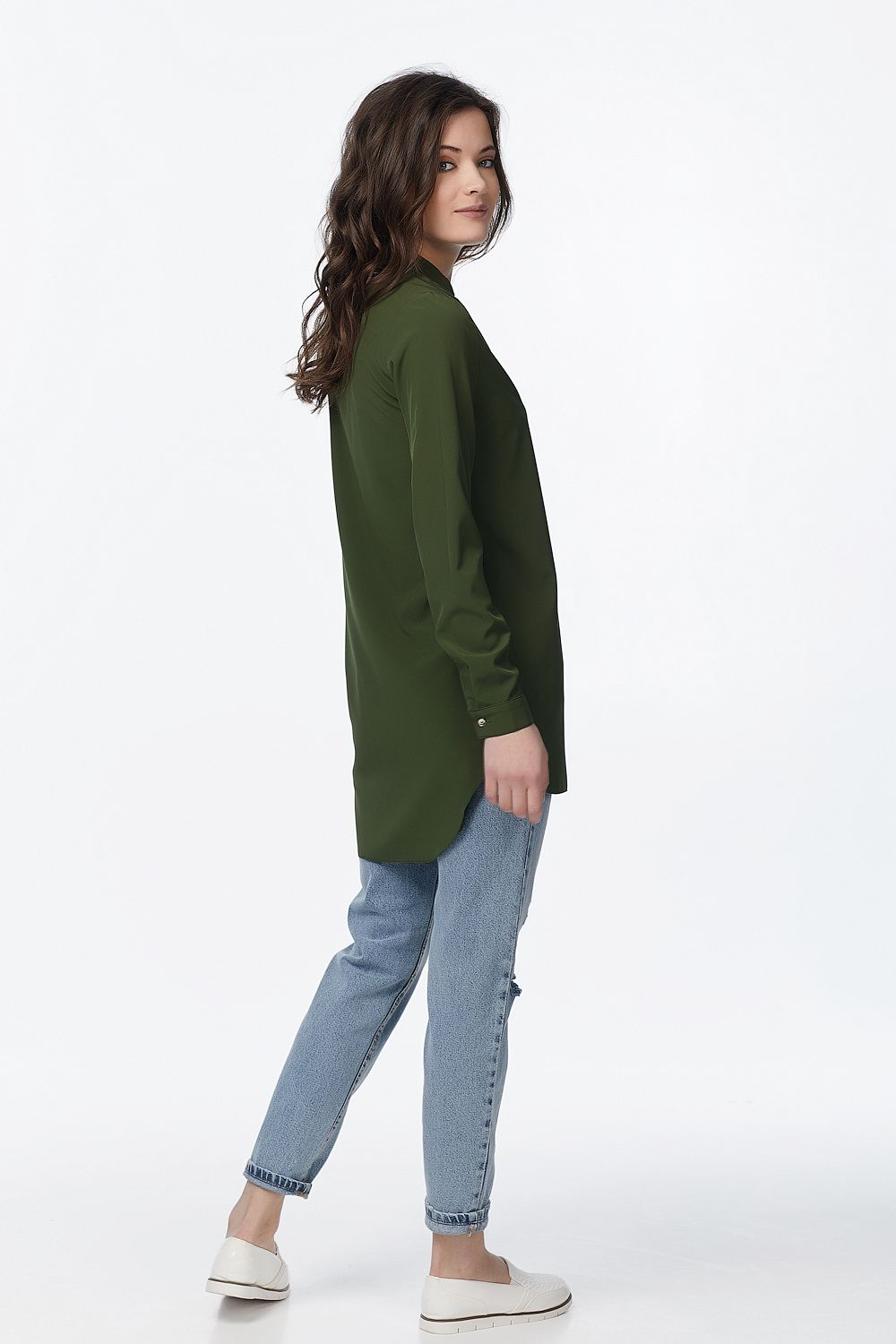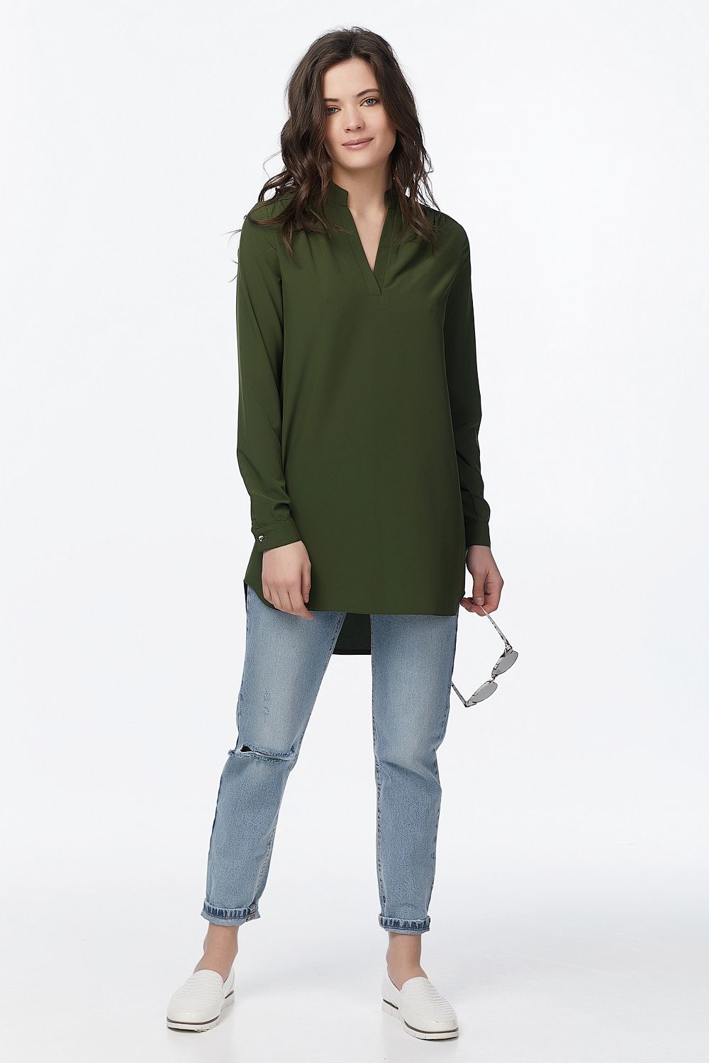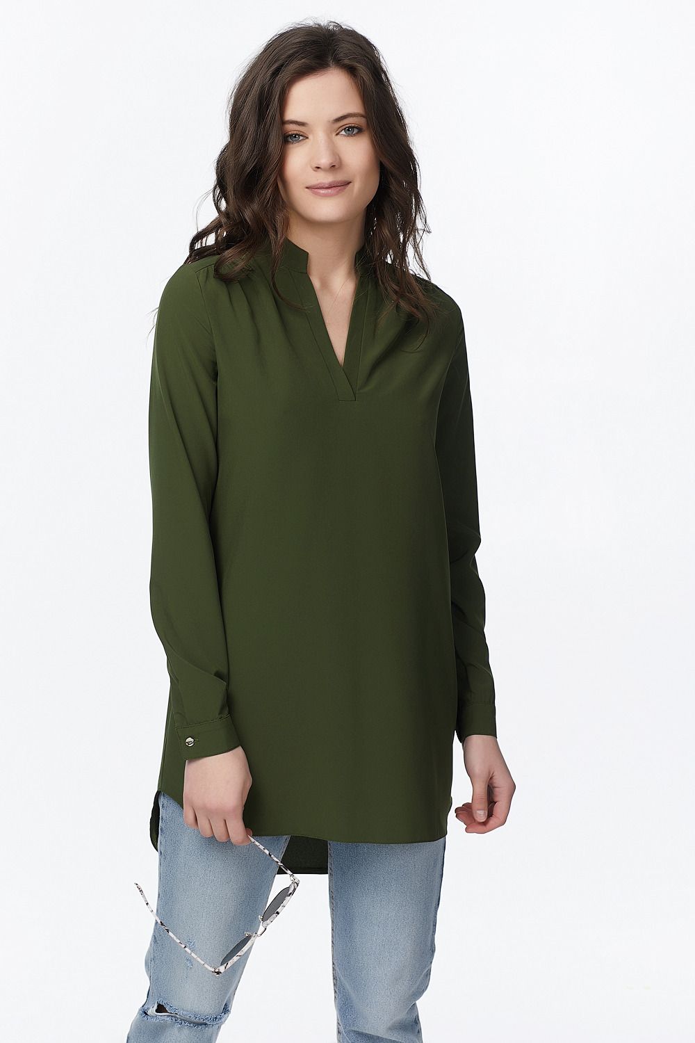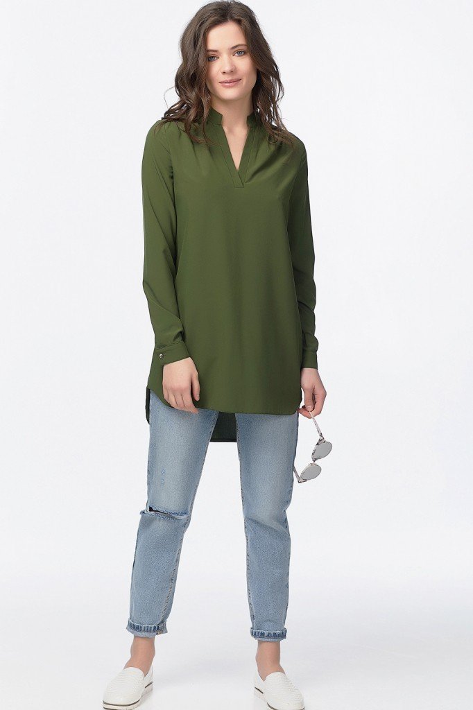 Удлиненная туника свободного силуэта. Вырез горловины оформлен планкой переходящей в воротник стойку. Удлиненный рукав выполнен на манжете и застегивается на пуговицу. Низ изделия имеет красивую фигурную линию. Длина изделия по спинке 82 см (44 р,50 р). Длина изделия по переду 75 см (44 р.,50 р).