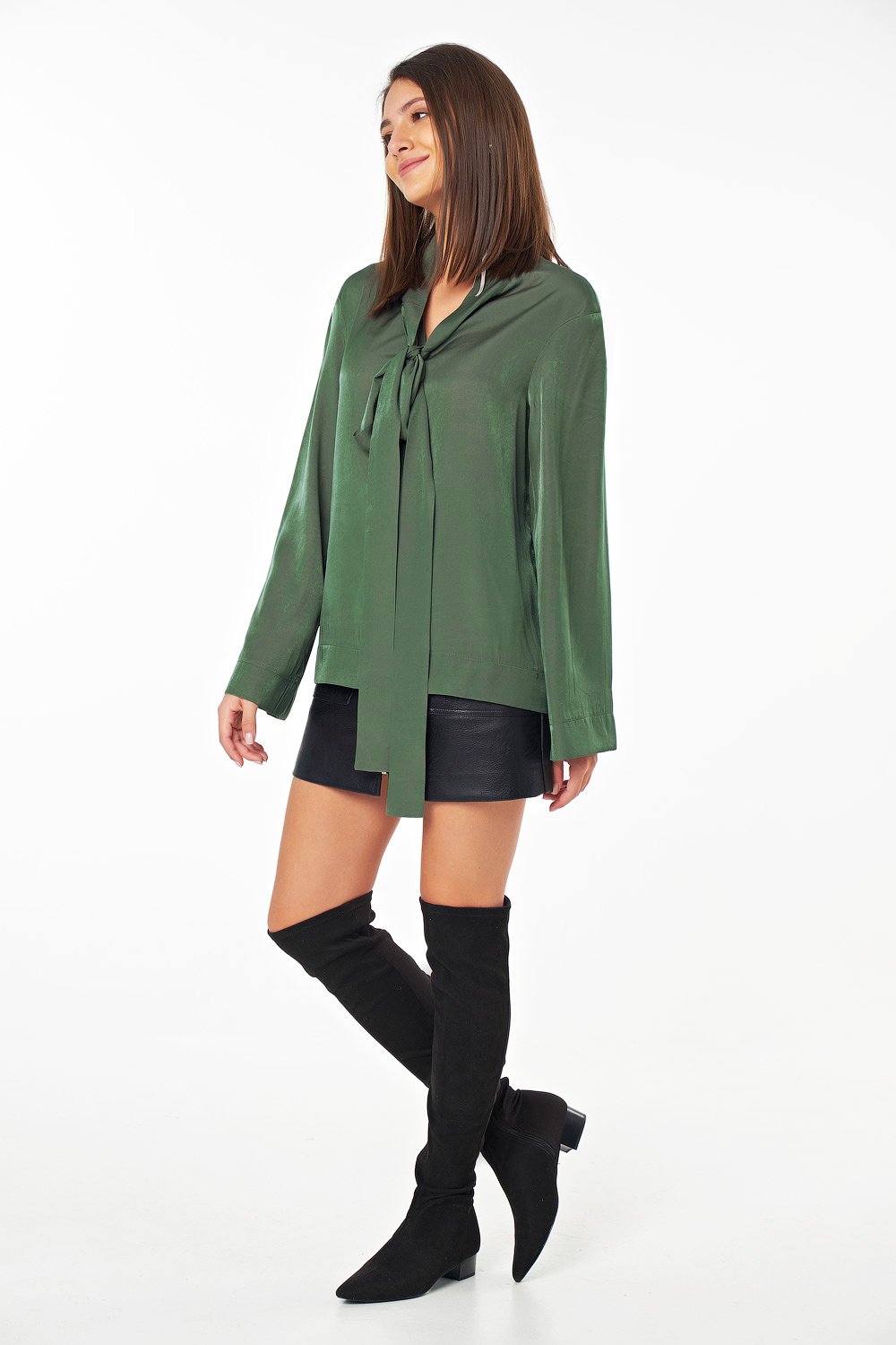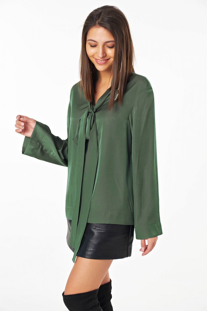 • Особенности: Блуза свободного силуэта с втачным широким рукавом, выполнена из шелковистой струящейся ткани. Шалевый воротник переходищий в длинные завязки.