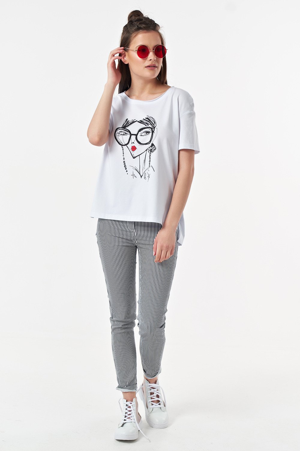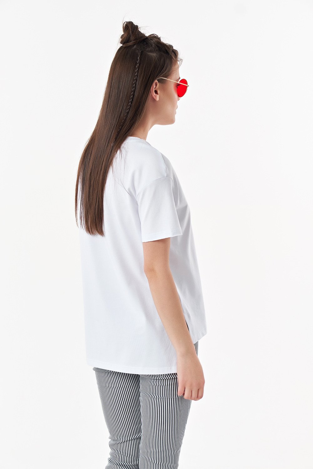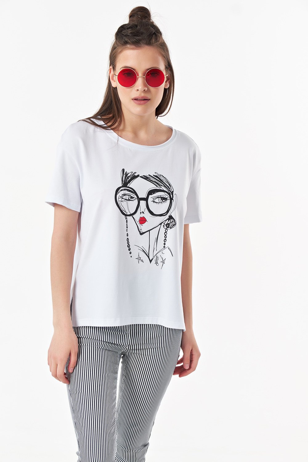 • Особенности: Футболка прямого силуэта из трикотажа. Детали: горловина обработана бейкой с обрезным краем, низ рукава обработан притачной полоской с обрезным необработанным краем, в боковых швах выполнены разрезы, перед короче спинки. По переду нанесен принт.