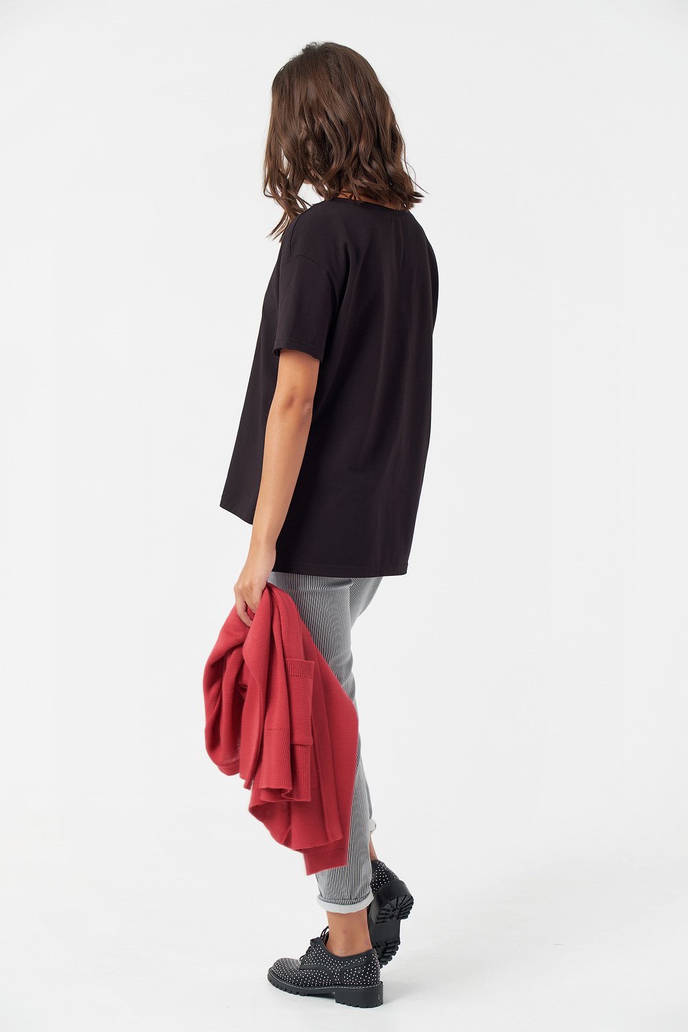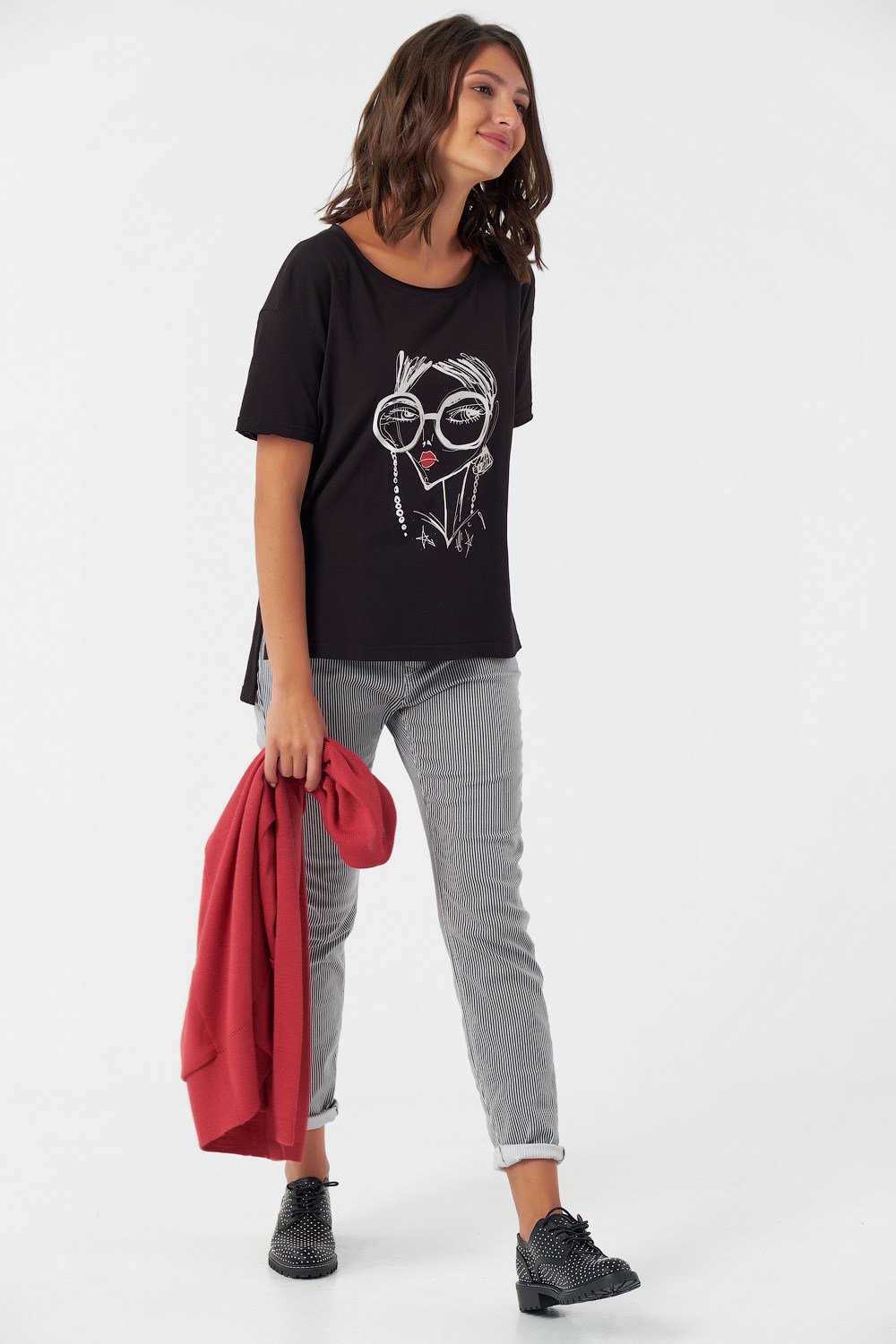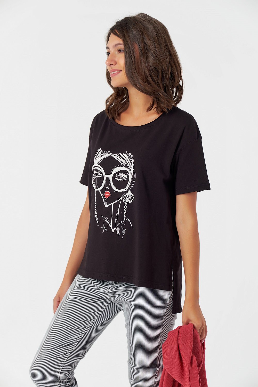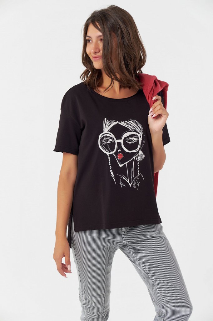 • Особенности: Футболка прямого силуэта из трикотажа. Детали: горловина обработана бейкой с обрезным краем, низ рукава обработан притачной полоской с обрезным необработанным краем, в боковых швах выполнены разрезы, перед короче спинки. По переду нанесен принт.