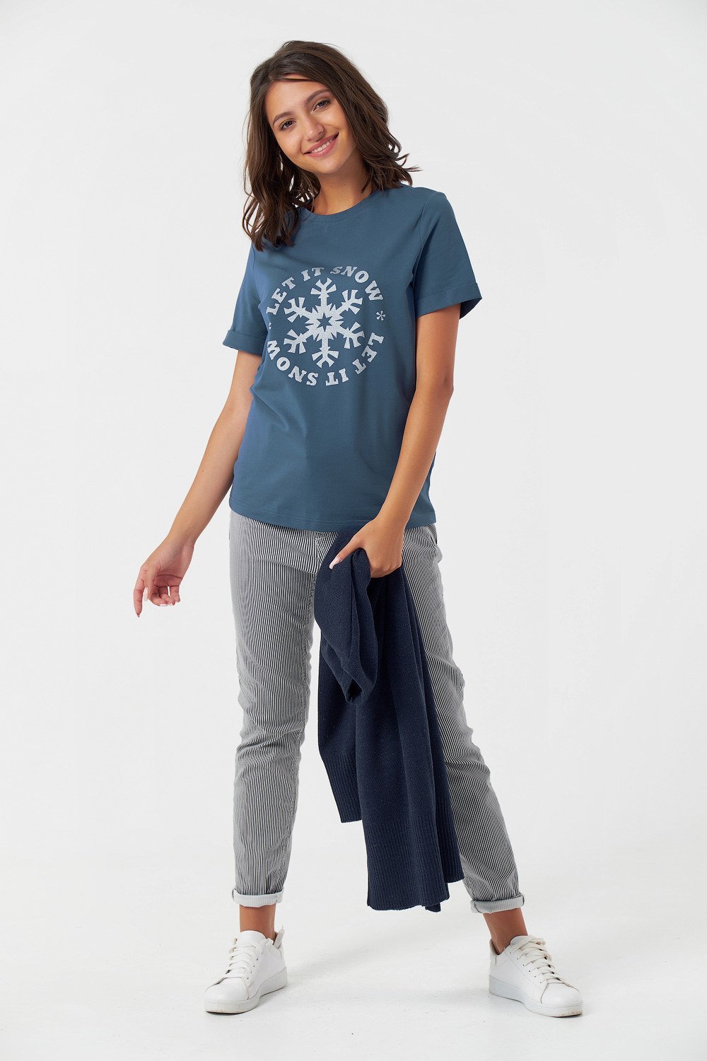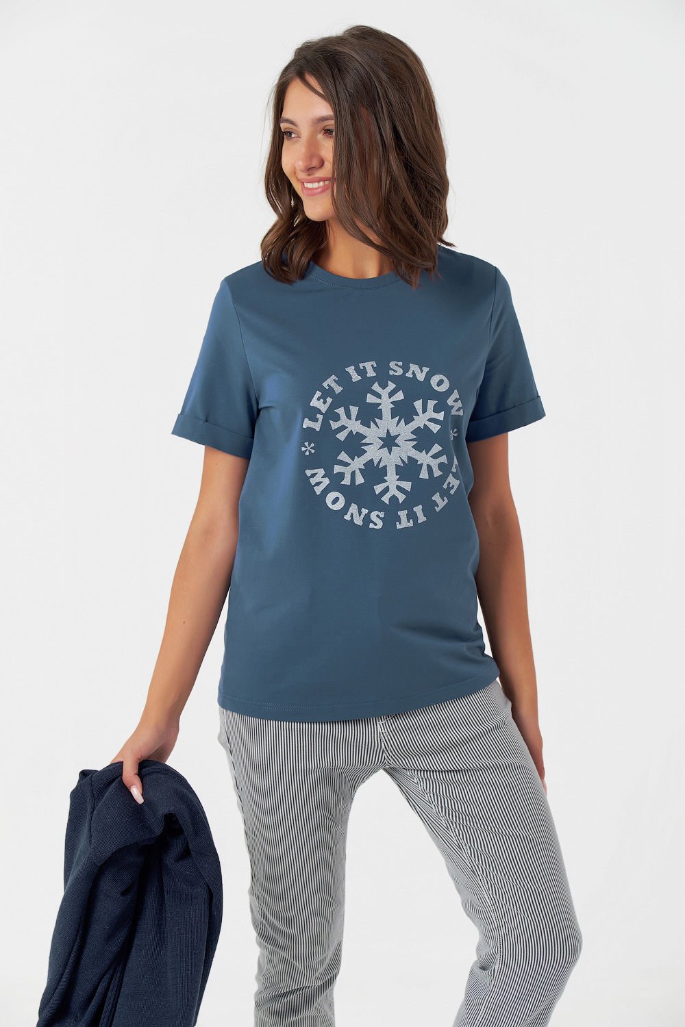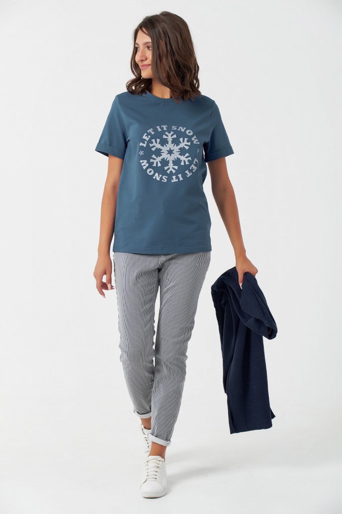 • Особенности: Футболка прямого силуэта, имеет свободную посадку без прилегания. Выполнена из плотного хлопкового трикотажа. Детали: горловина обработана бейкой, по переду нанесен принт.