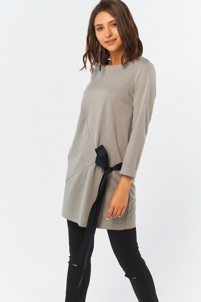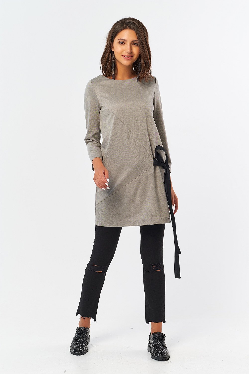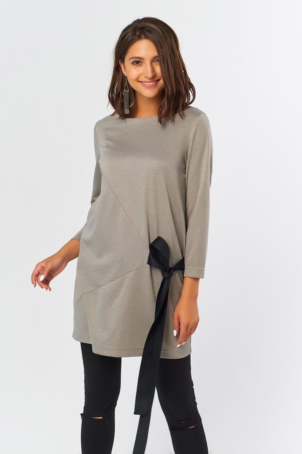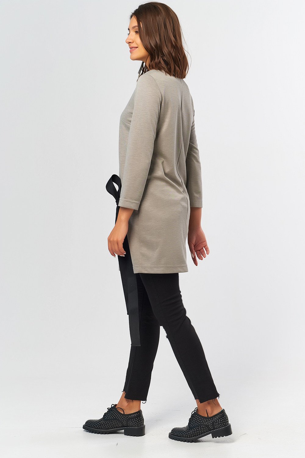• Особенности: Туника прямого силуэта из трикотажа. Детали: горловина округлой формы, фигурные членения по переду, контрастные длинные завязки, втачной рукав 3/4.