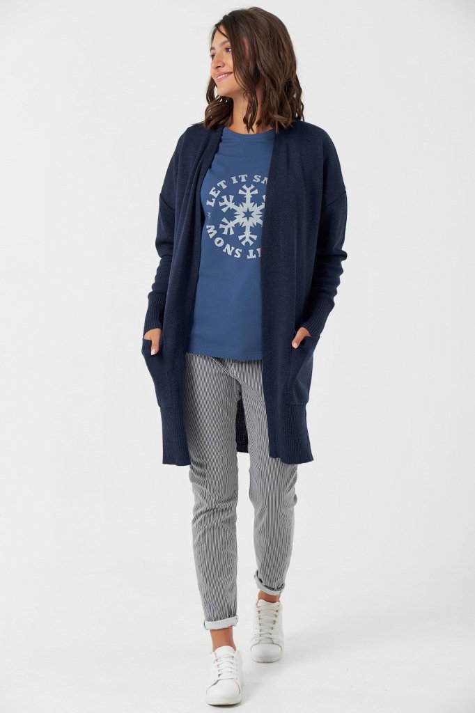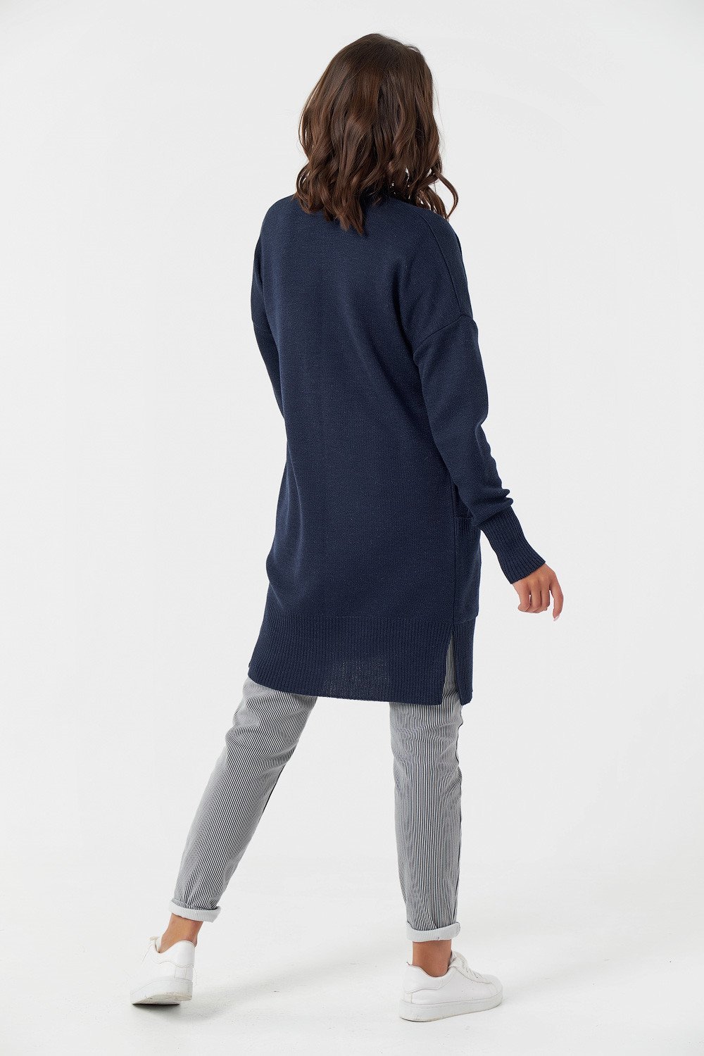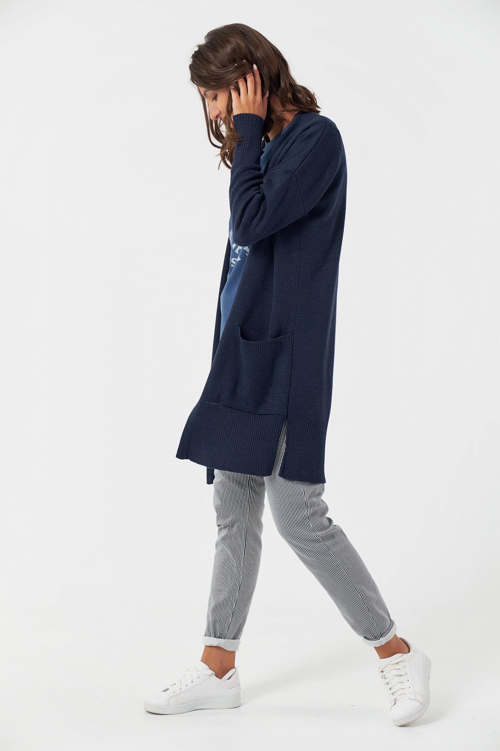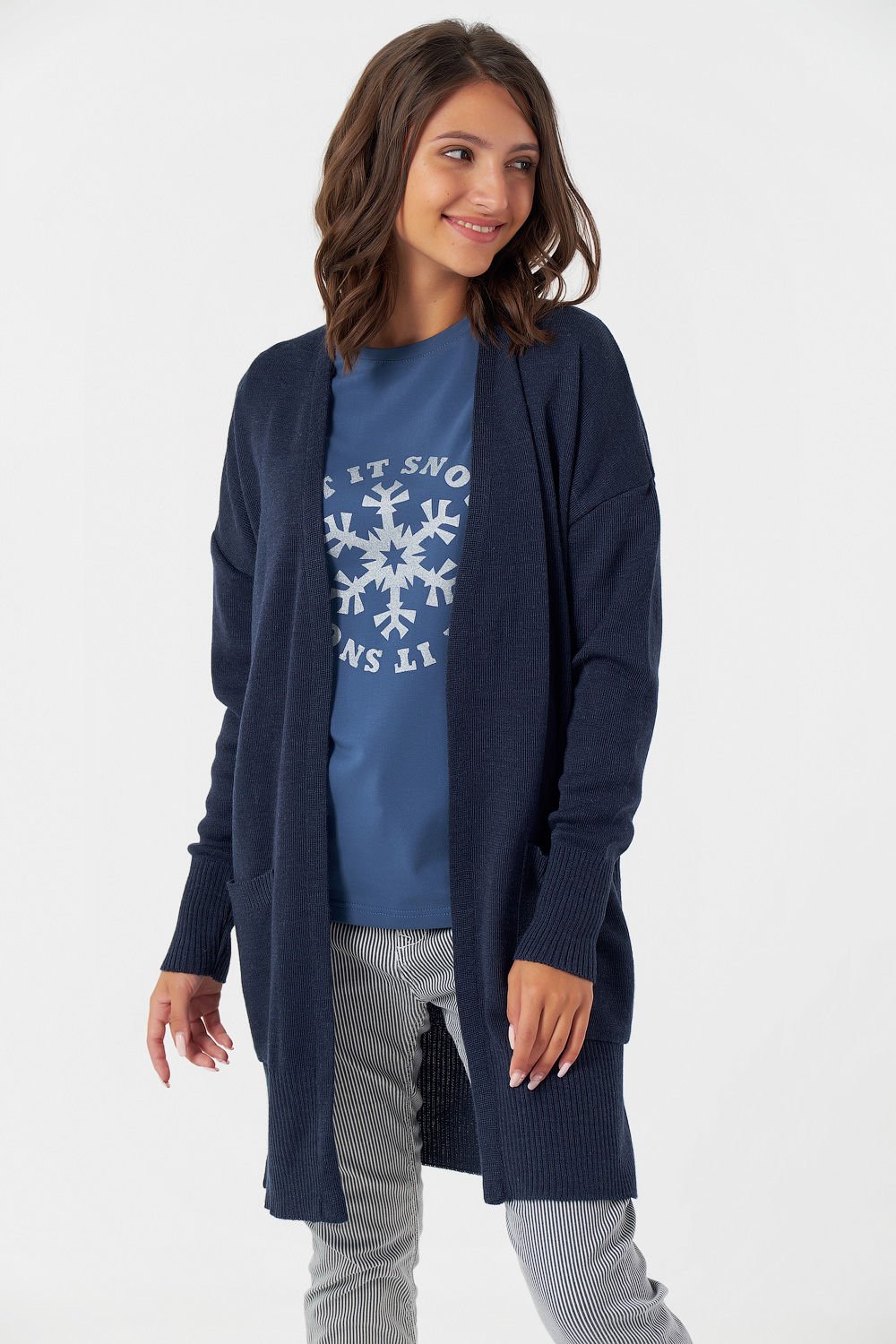 Особенности: Удлиненный кардиган свободного силуэта без застежки. Полочки кардигана обработаны узкой бейкой и оформлены крупными накладными карманами. Рукава и низ изделия украшает широкая резинка в рубчик. По бокам выполнены удлиненные разрезы.