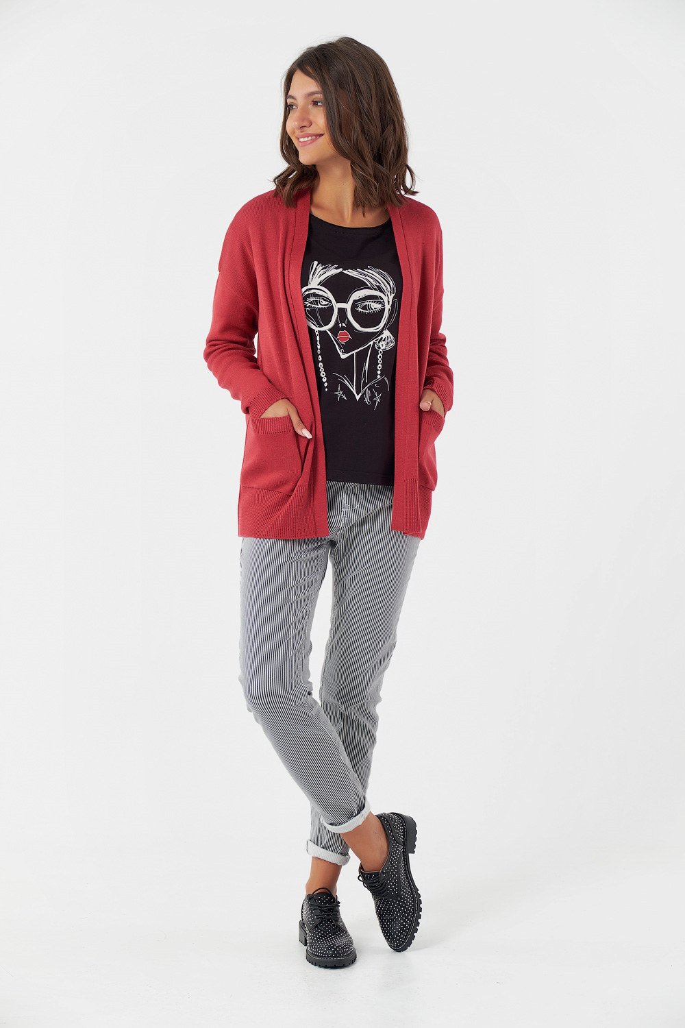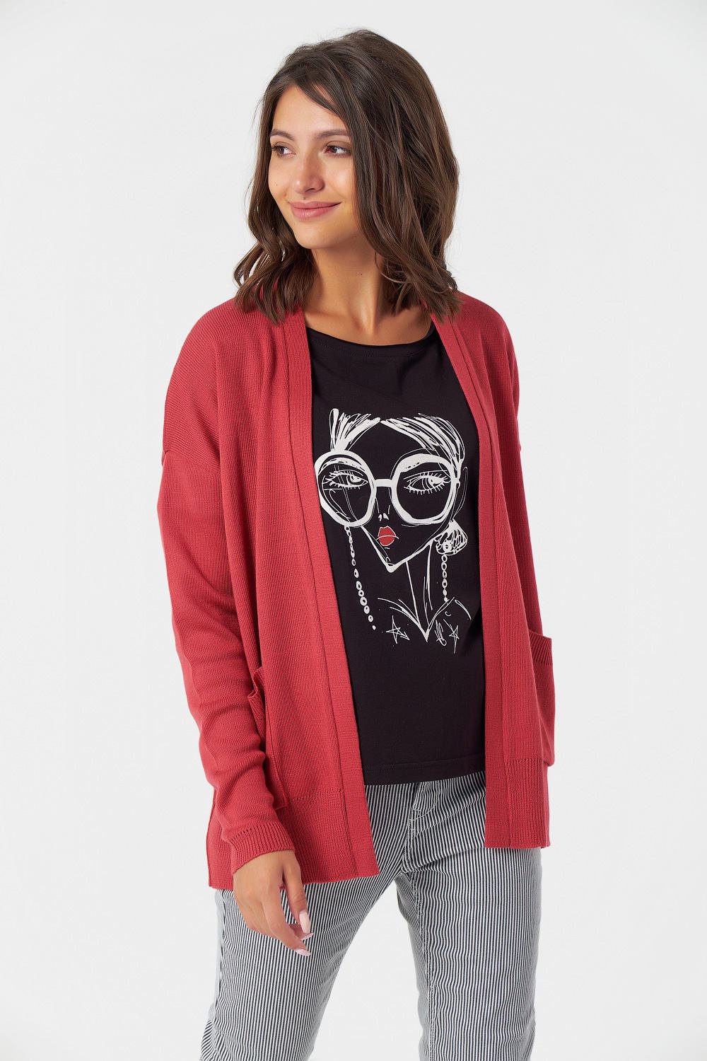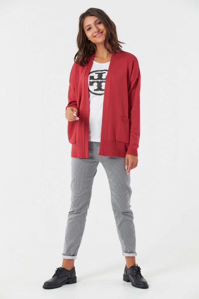 Особенности: Вязаный тонкий кардиган из полушерстяной пряжи. Низ рукавов и изделия оформлены резинкой в рубчик.