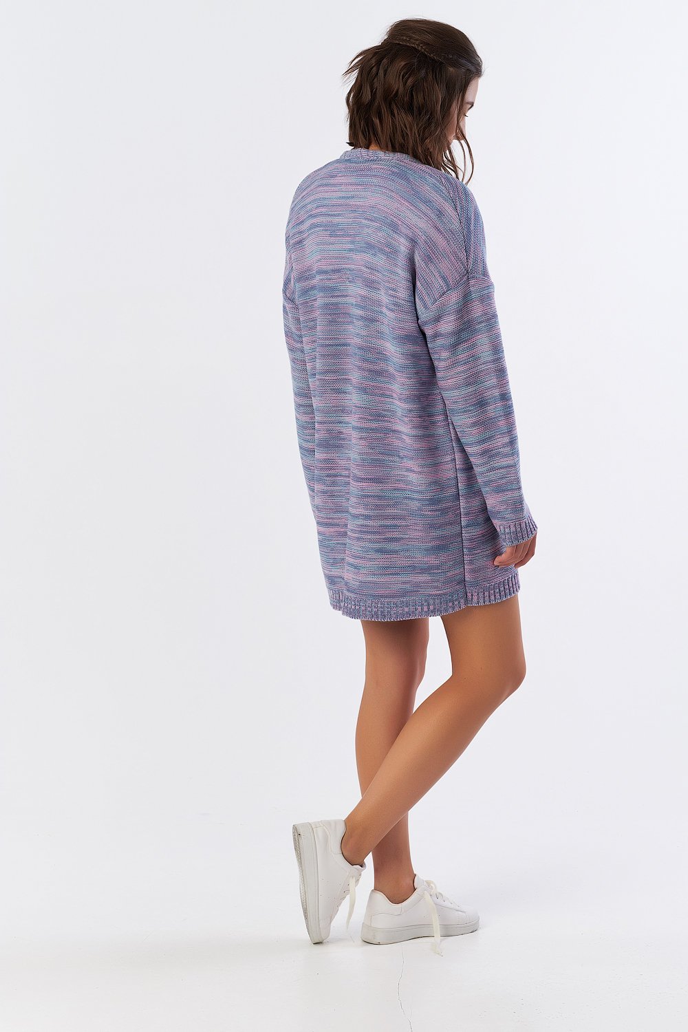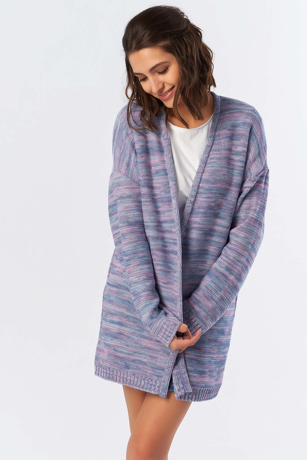 Особенности: Вязаный джемпер из фактурной меланжевой пряжи. Перед кардигана оформлен узкой бейкой.