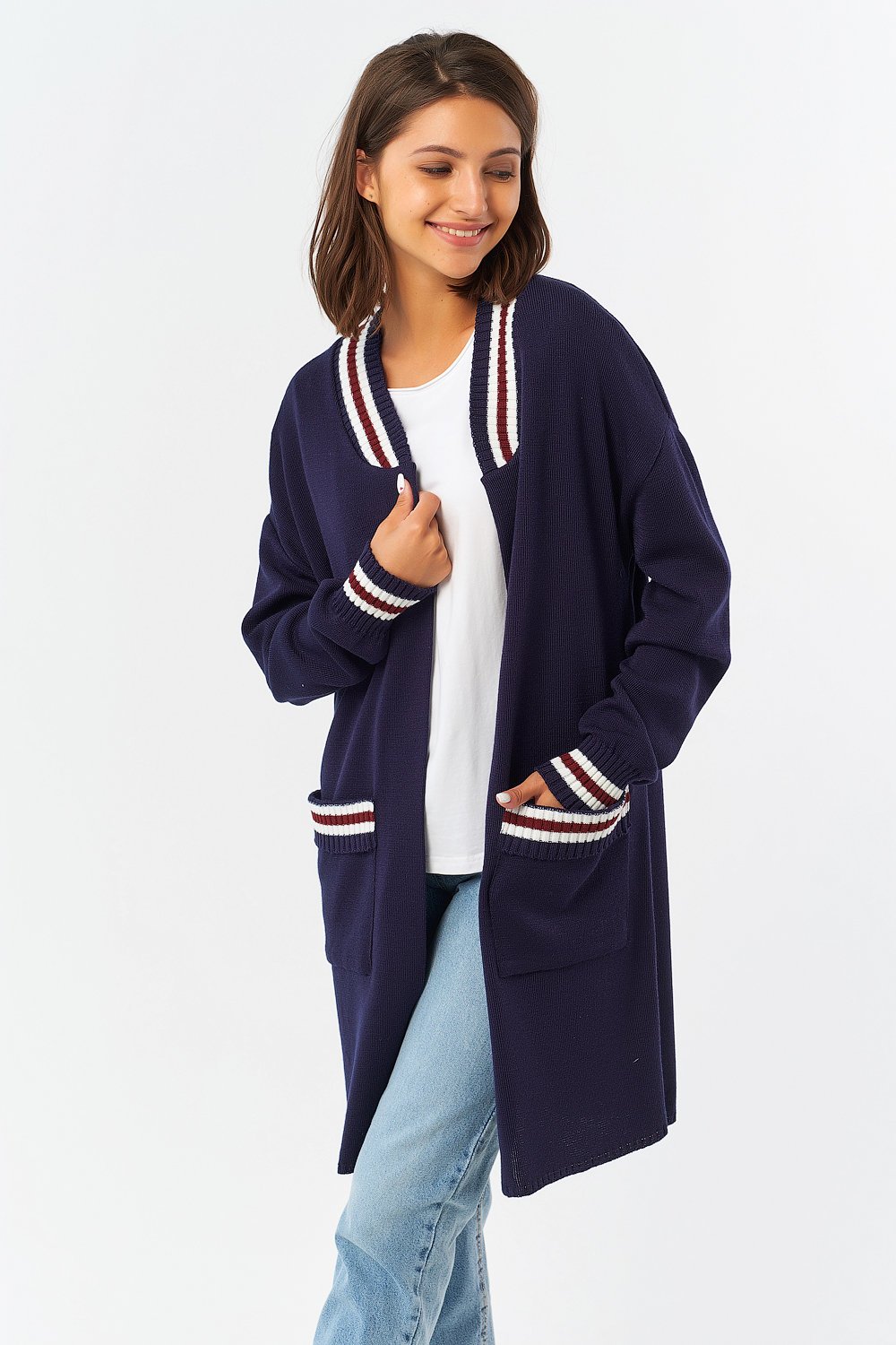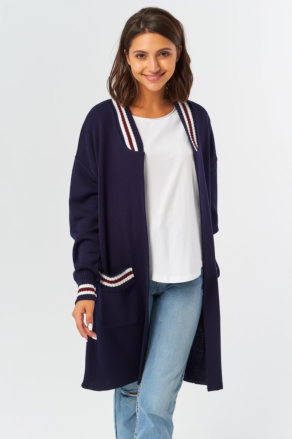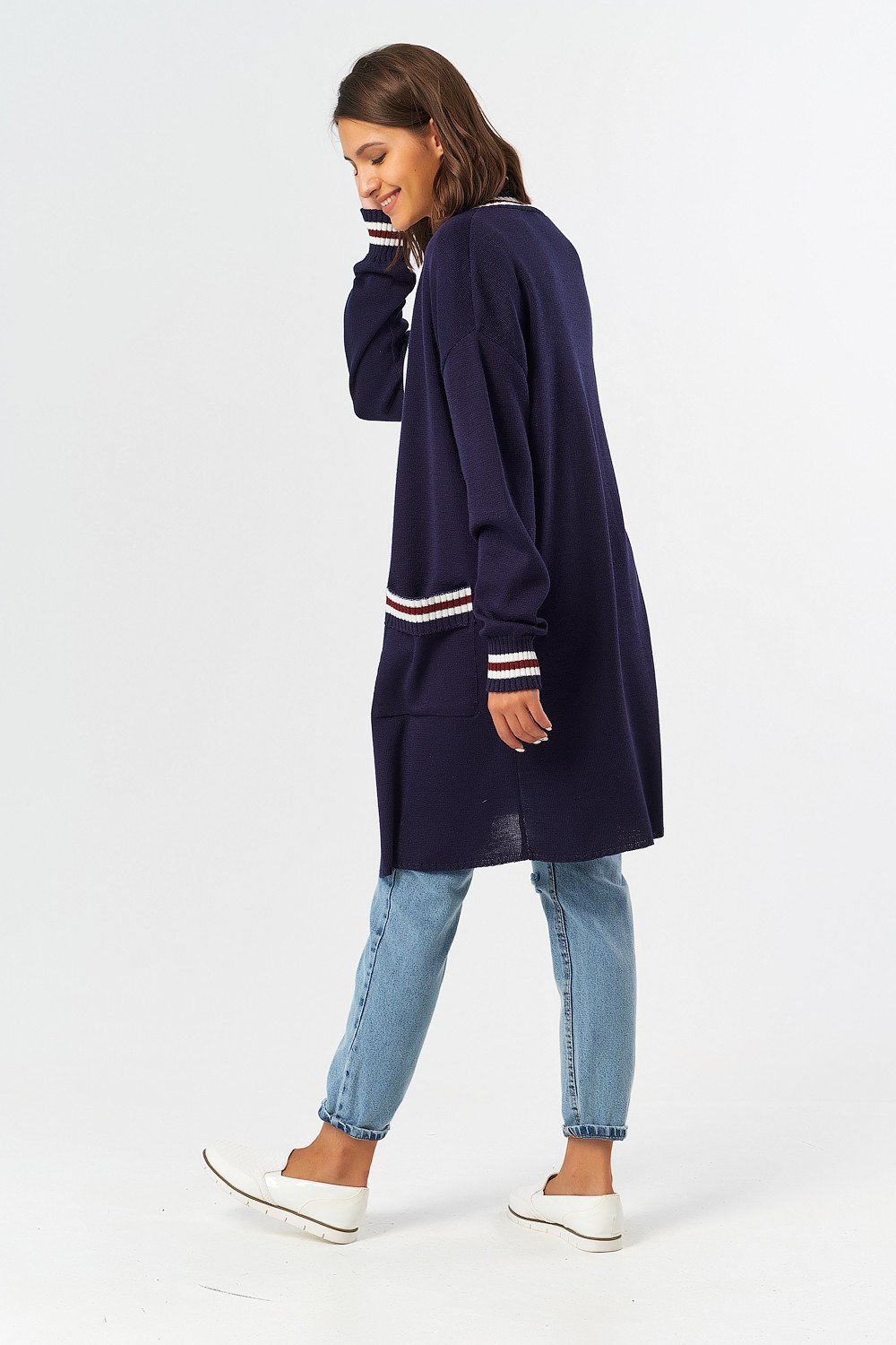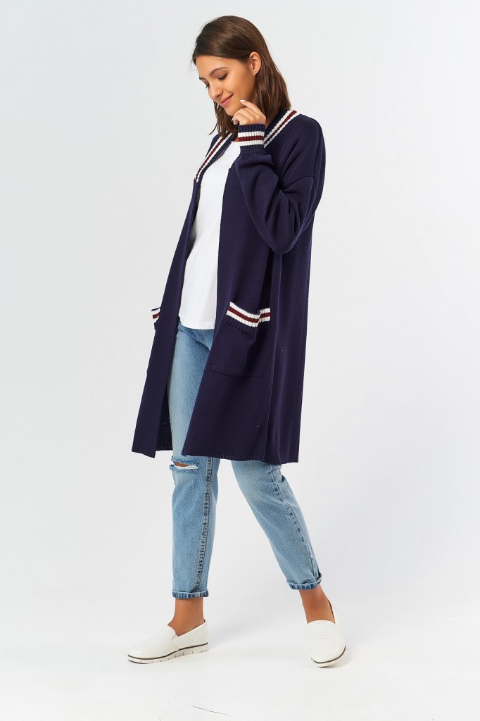 Особенности: Мягкий тонкий кардиган с контрастной отделкой по рукавам, горловине и на карманах.