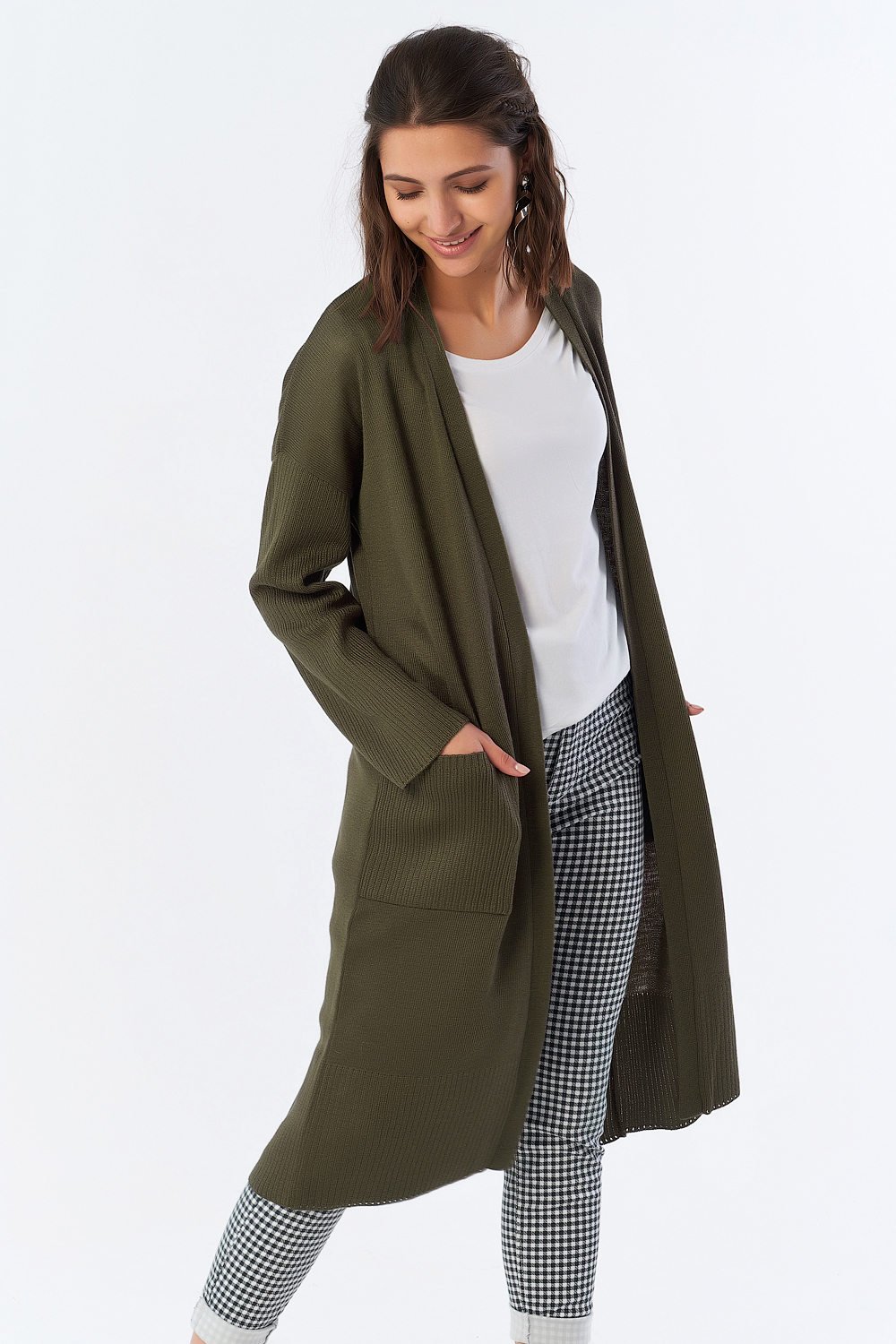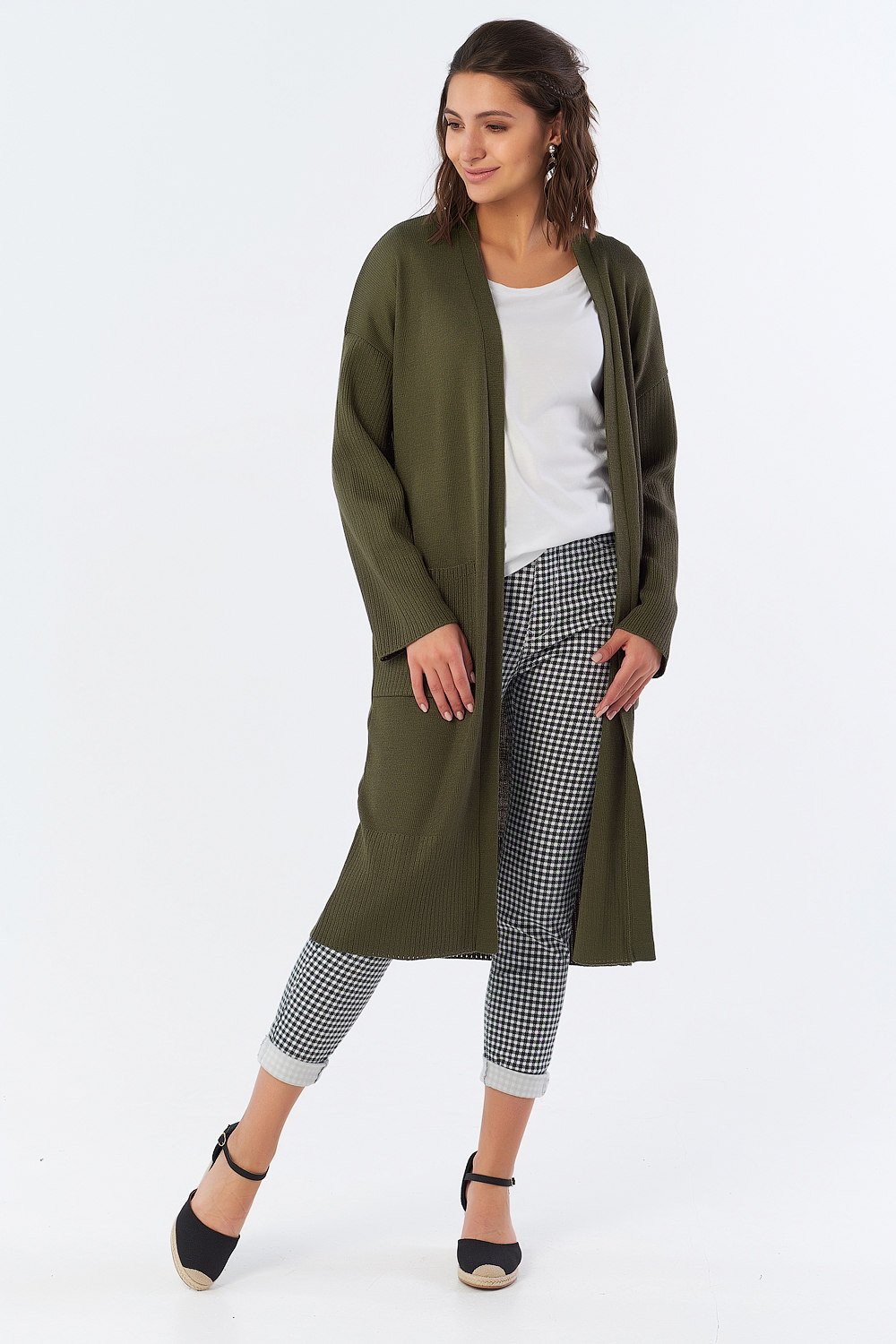 Вязаный кардиган свободного силуэта выполнен комбинированной вязкой из полушерстяной пряжи. Спереди изделия имеются 2 накладных кармана. Рукав свободный, длинный, выполнен фактурной вязкой, линия плеча спущена. Низ изделия оформлен широкой резинкой в рубчик. Длина изделия по спинке около 105 см (44 р), около 107 см (48 р).