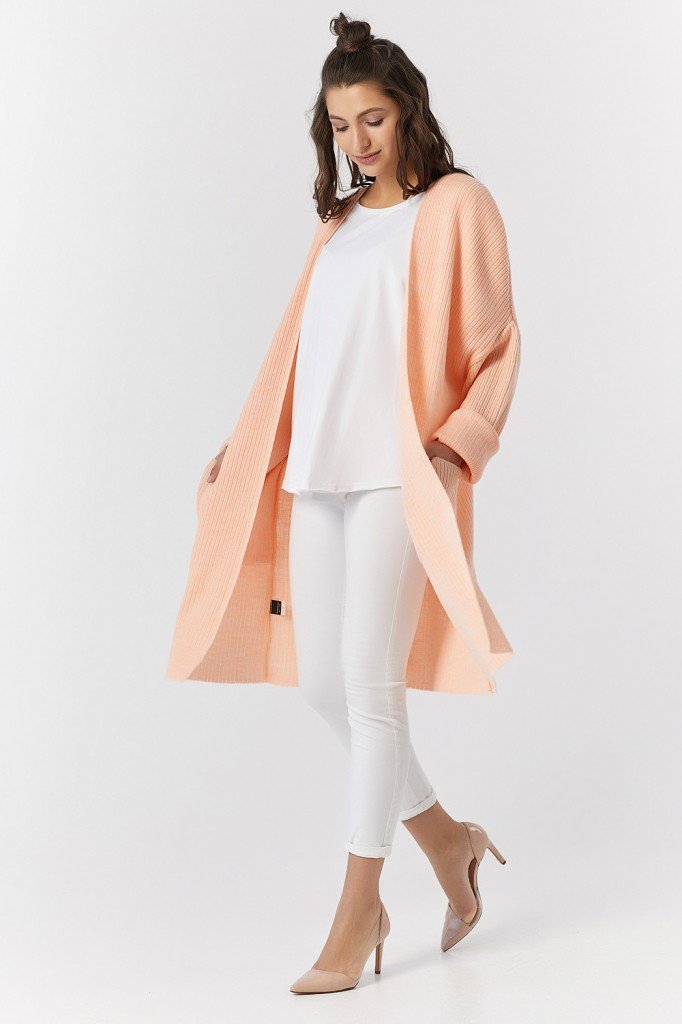 Особенности: Объемный, вязаный кардиган, выполнен фактурной вязкой из полушерстяной пряжи.