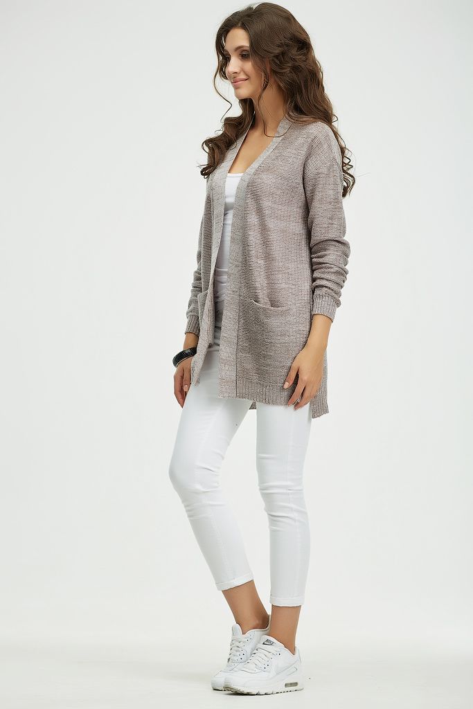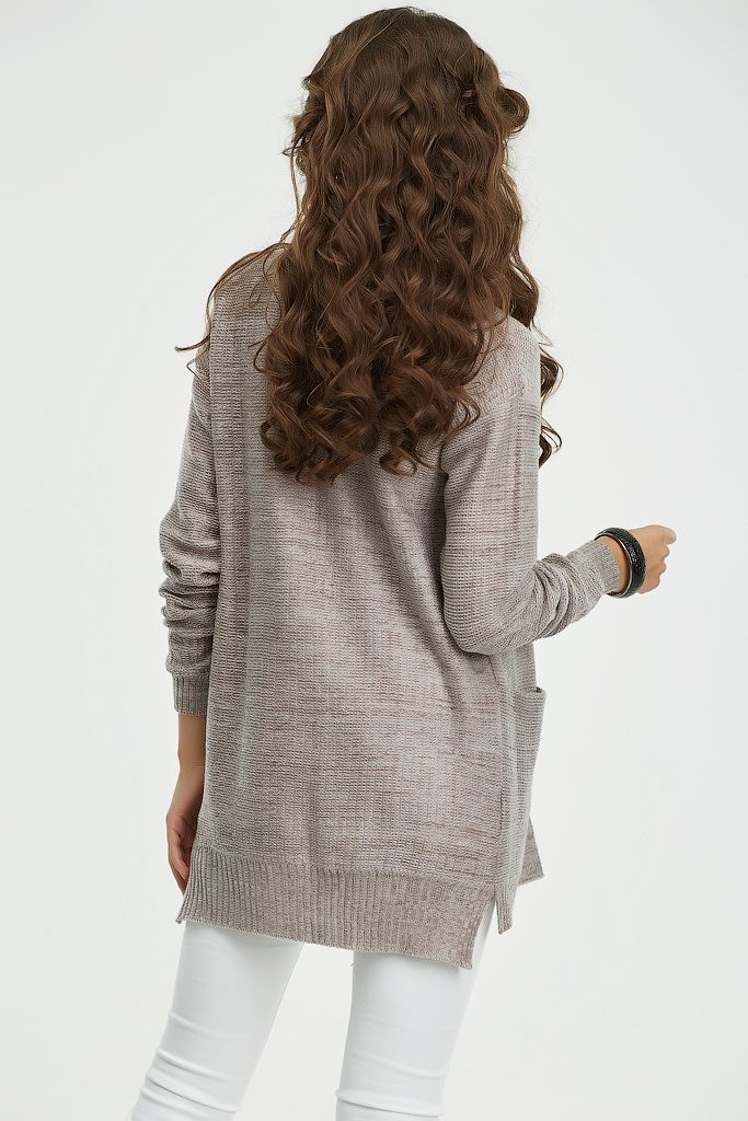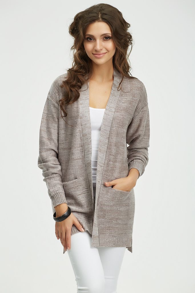Особенности: Кардиган связан из меланжированной пряжи фактурным способом. Перед кардигана оформлены широкой бейкой.