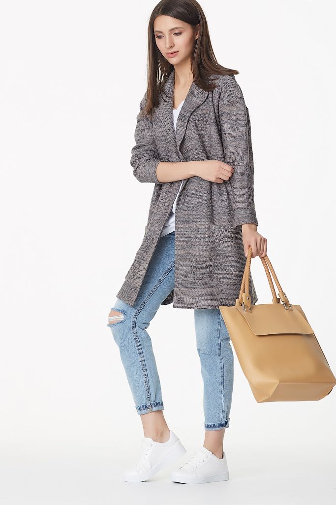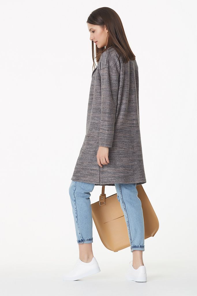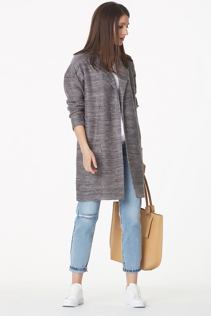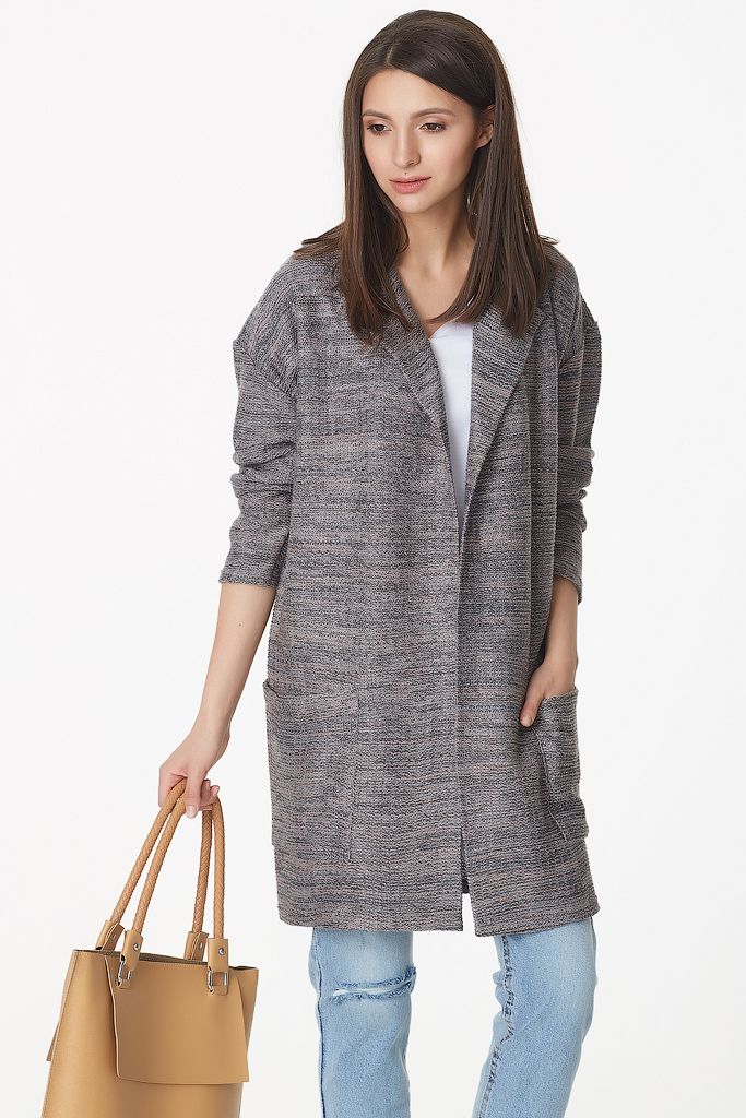 Мягкий вязанный кардиган из фактурной меланжированной пряжи. Воротник отложной в форме лацкана. По бокам изделия выполнены накладные карманы. Длина изделия по спинке около 90 см (44, 50 р).