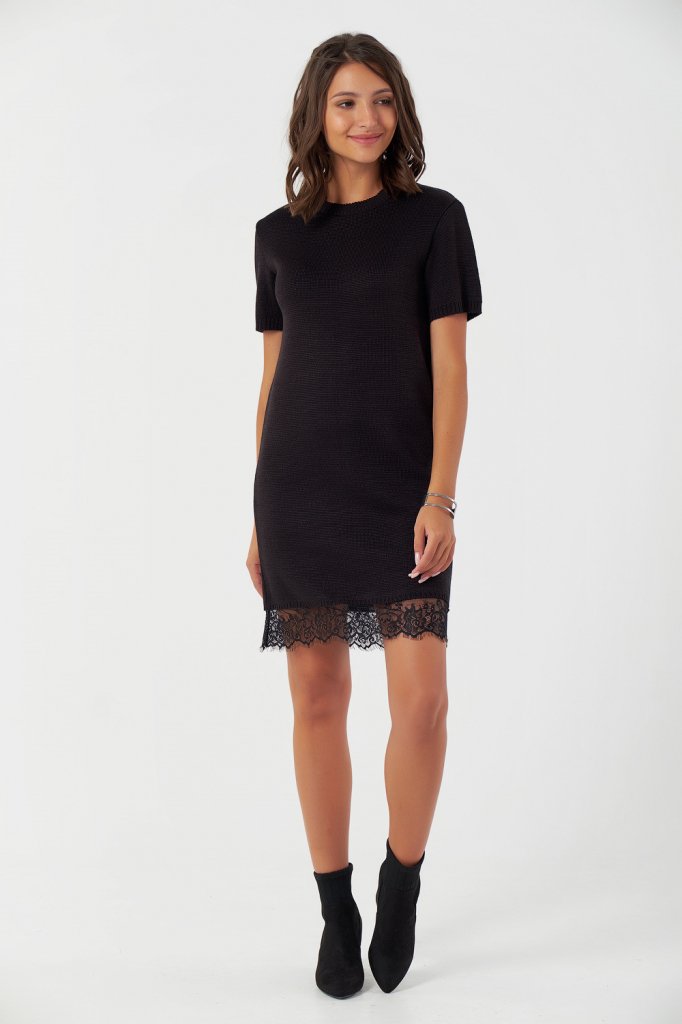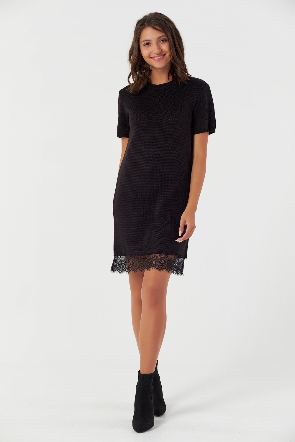 Особенности: Вязаное платье выполнено из смесовой пряжи с содержанием шерсти и хлопка. Рукава и горловина оформлены узкой резинкой в рубчик. Низ изделия дополнен кружевом.