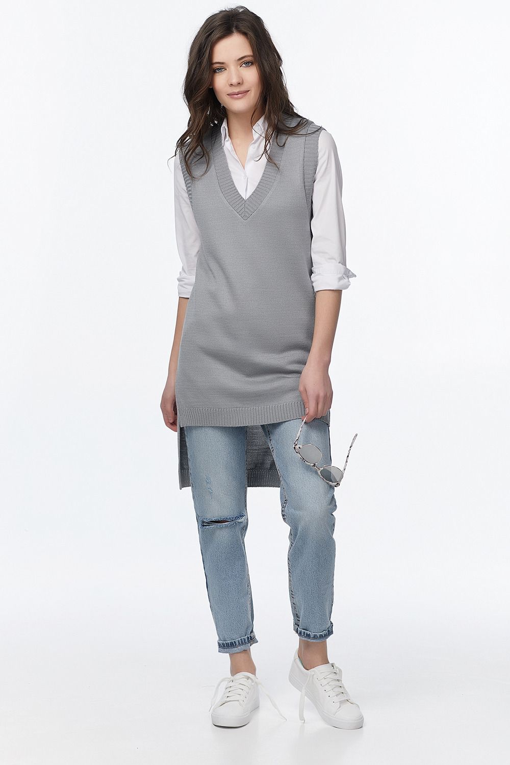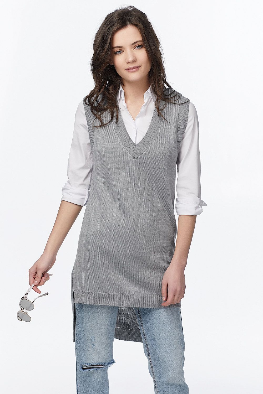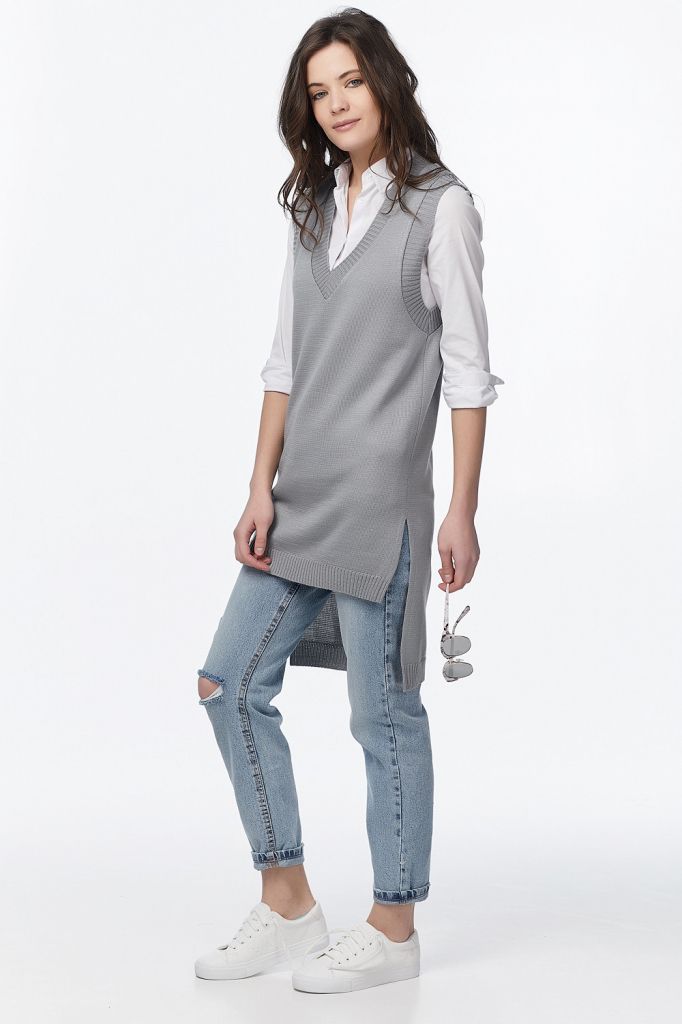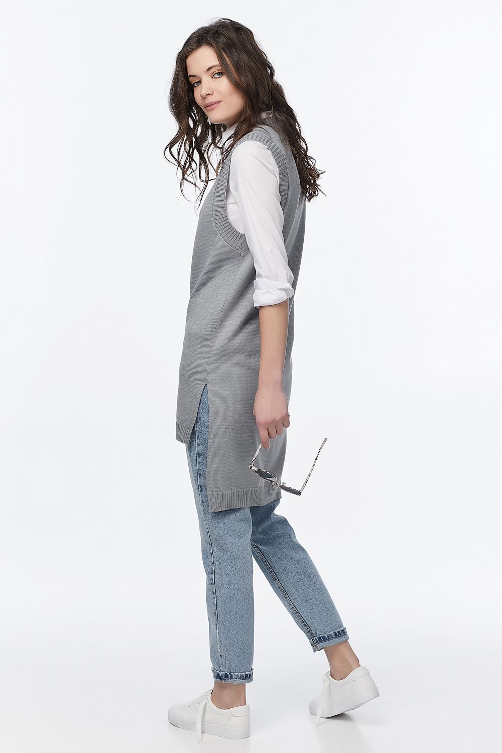 Вязаный удлиненный жилет свободного силуэта. Вырез горловины V-образный. Горловина жилета и пройма оформлены резинкой. Особенностью данной модели являются разрезы по бокам изделия. Длина изделия по спинке около 97 см (44 р.), 98 см (48 р.). Спинка длиннее переда на 15 см.