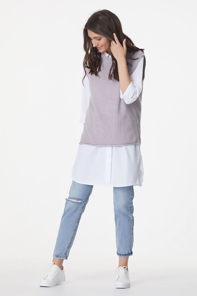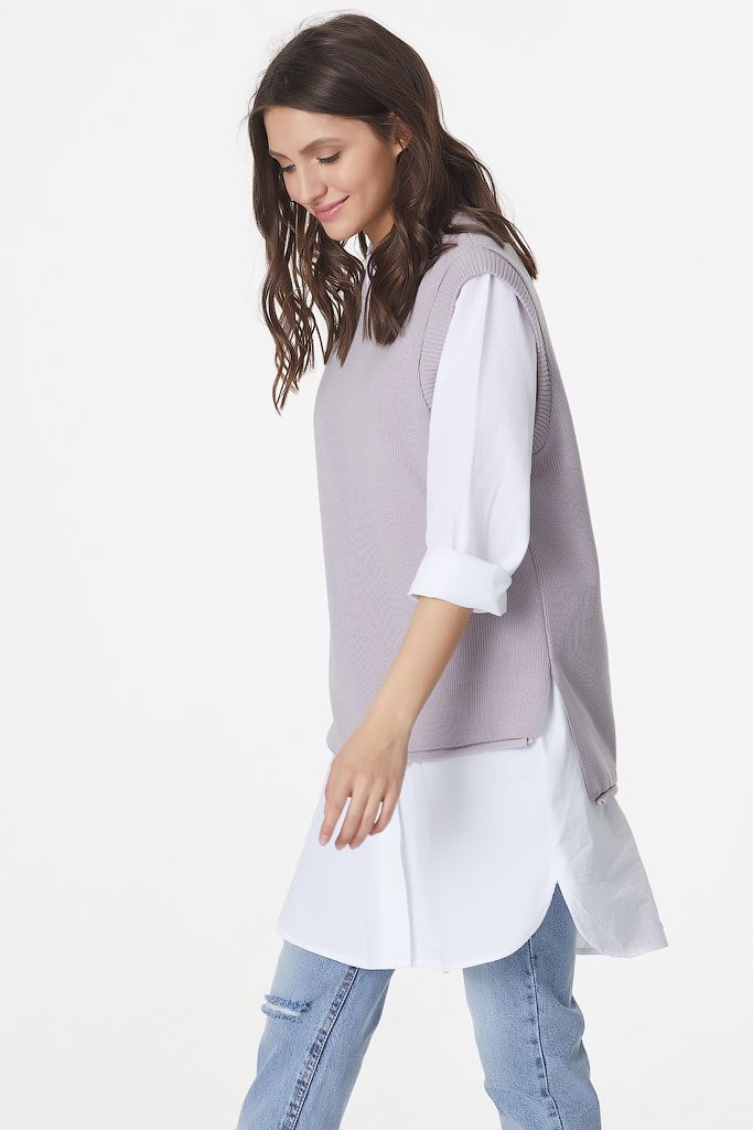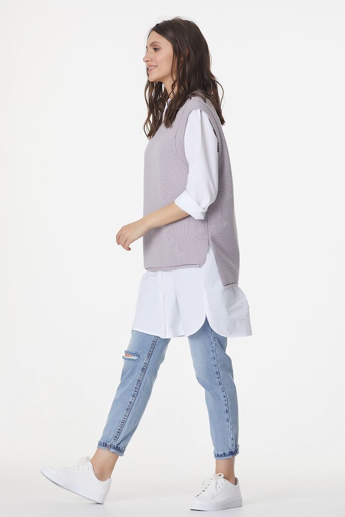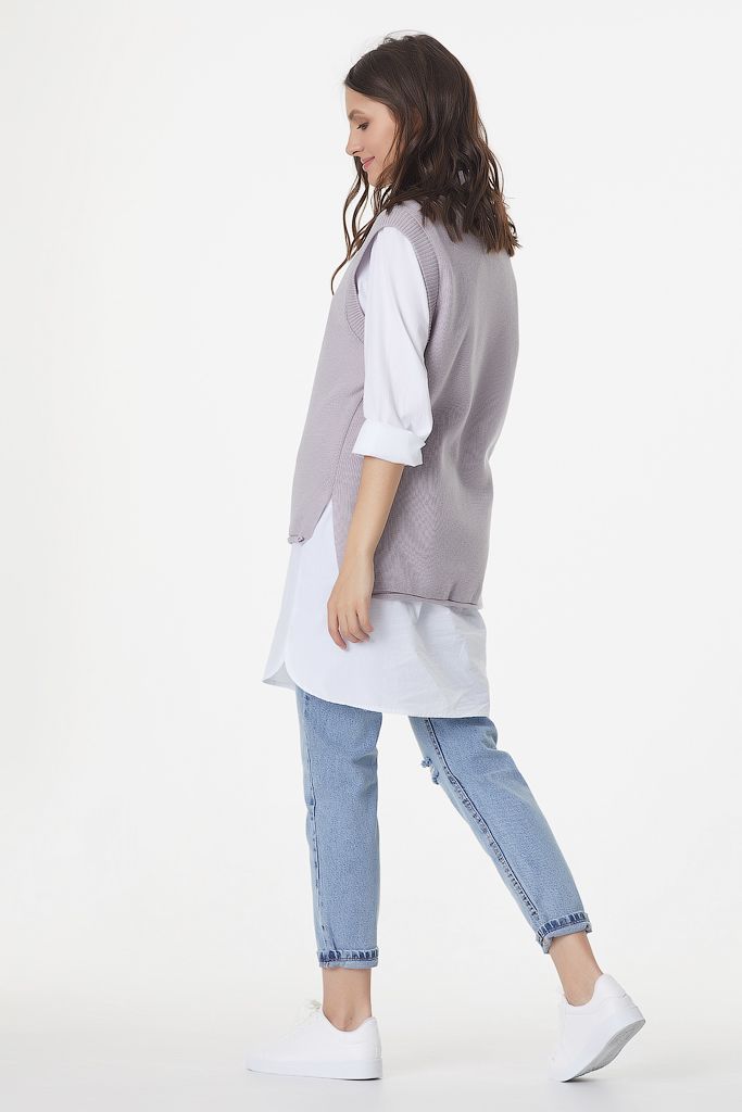 Особенности: Вязаный жилет свободного силуэта с ассиметричным низом. Низ изделия оформлен закруткой, по бокам выполнены разрезы.