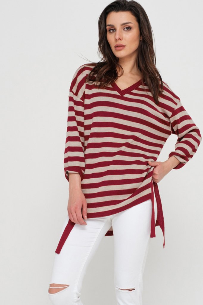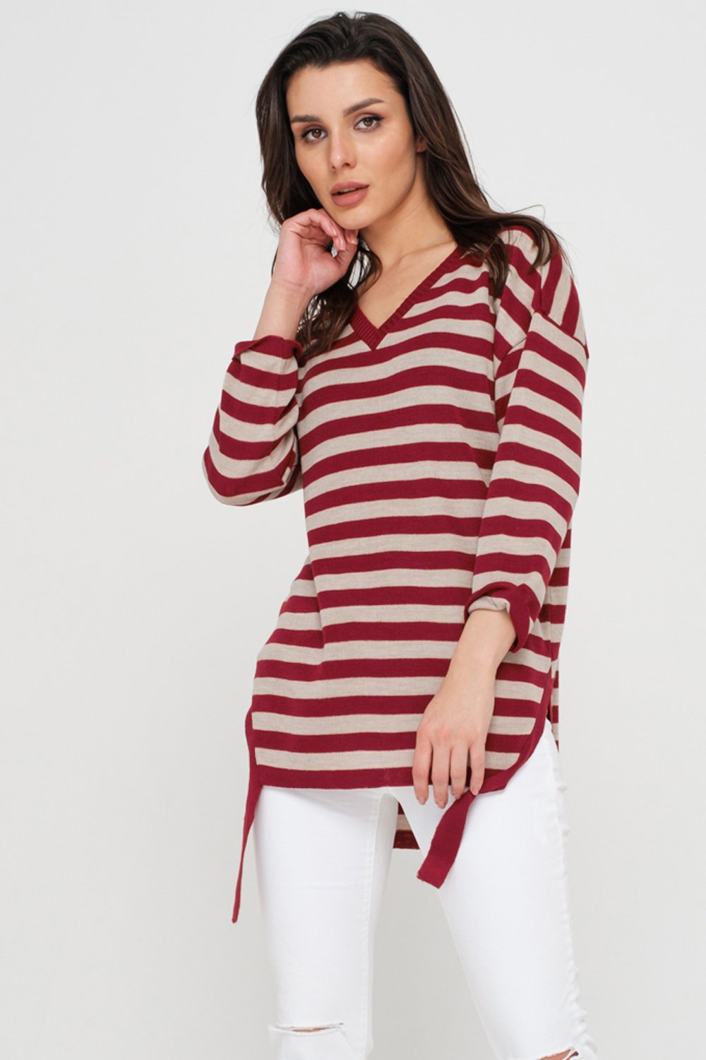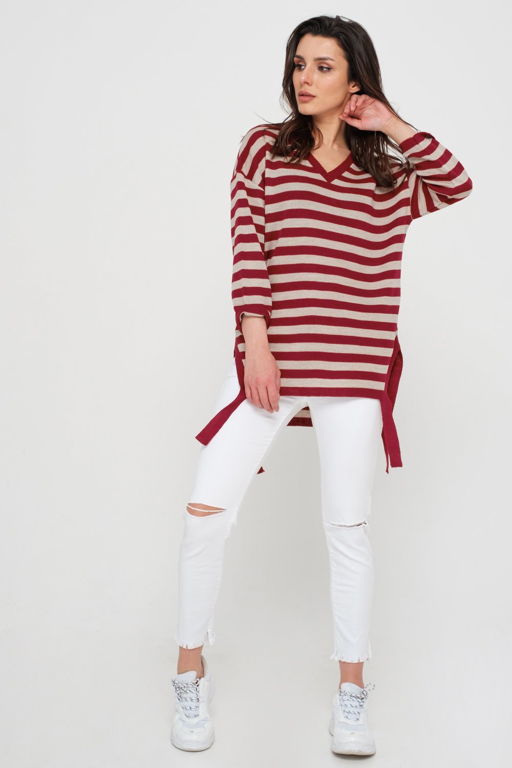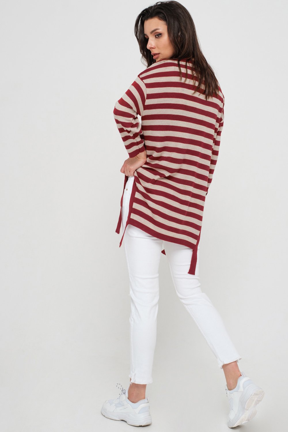 Особенности: Вязаная двухцветная туника прямого силуэта из полушерстяной пряжи. Разрезы туники оформлены контрастной обтачкой по переду, низ асимметричный.