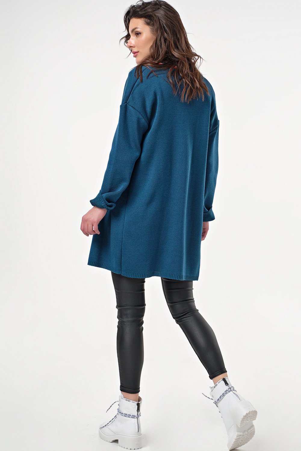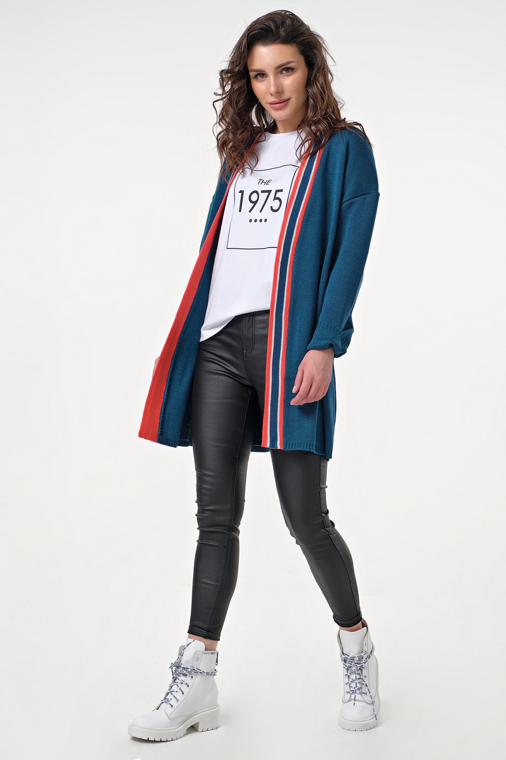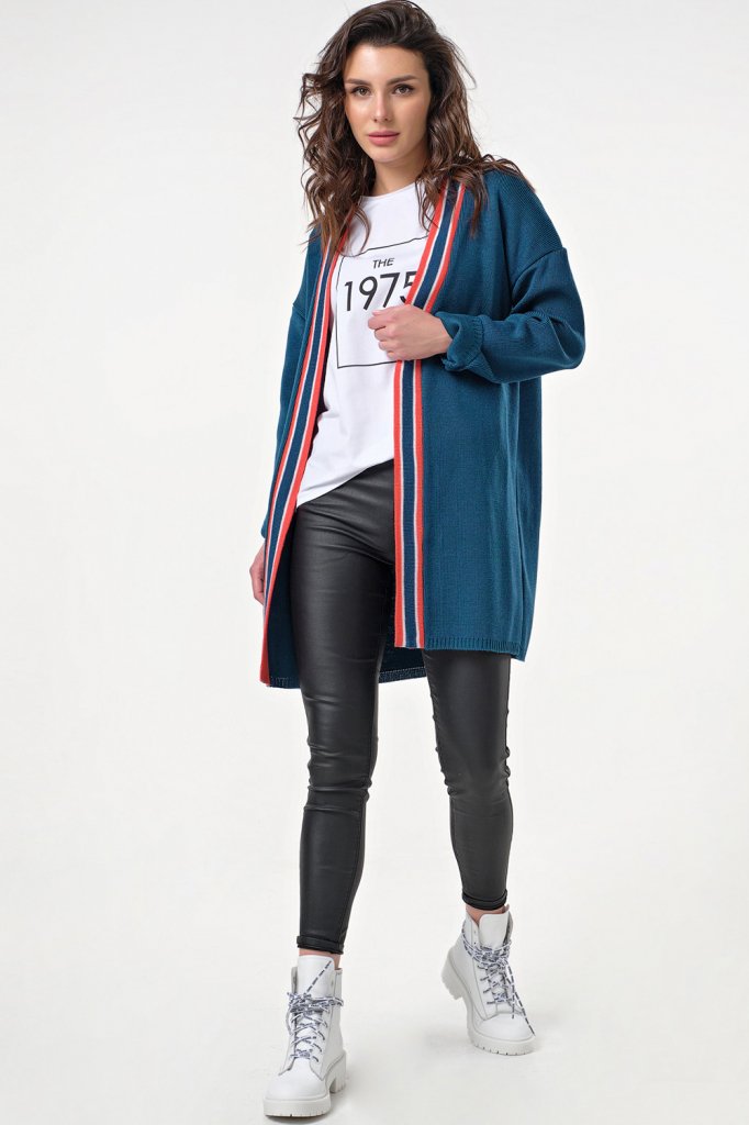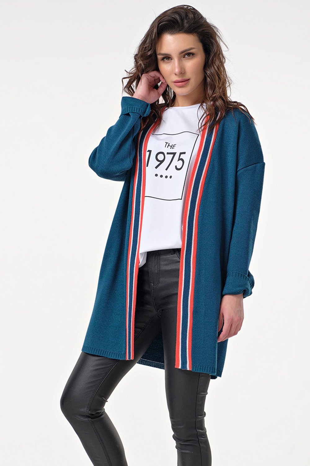 Особенности: Кардиган выполнен из полушерстяной пряжи свободного силуэта без застежки. Перед кардигана оформлен двойной резинкой с контрастными полосками.