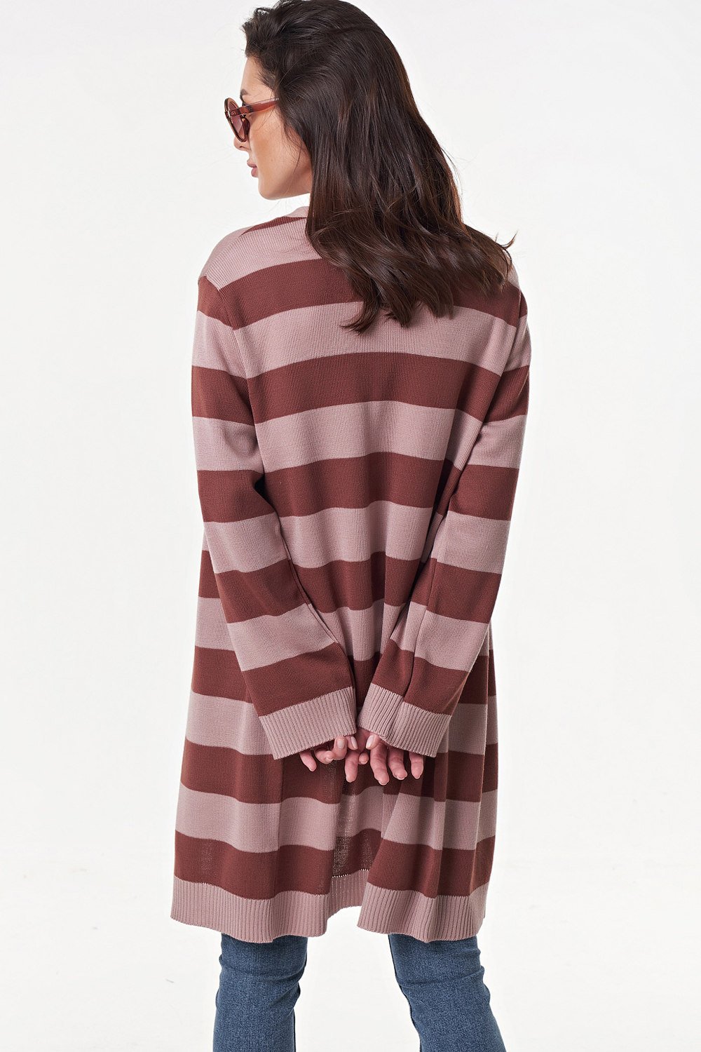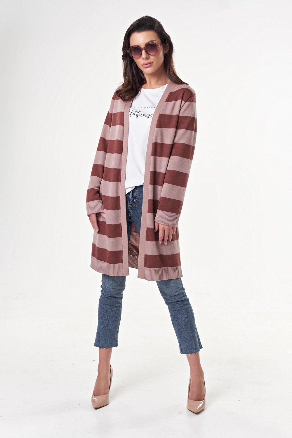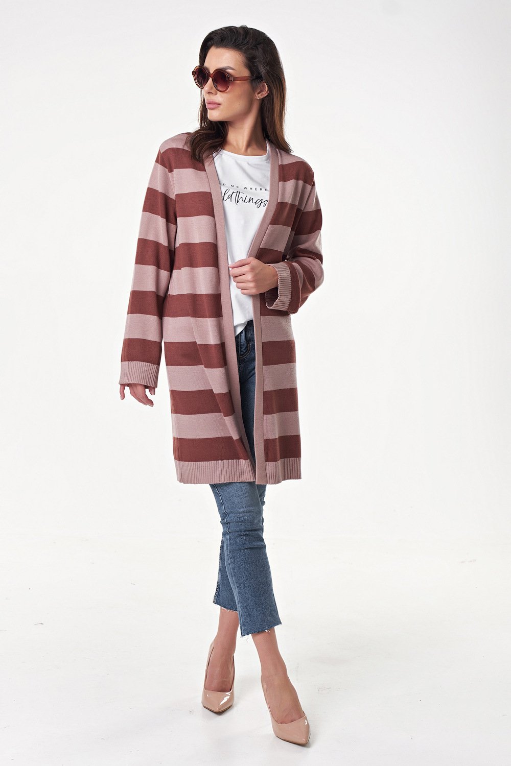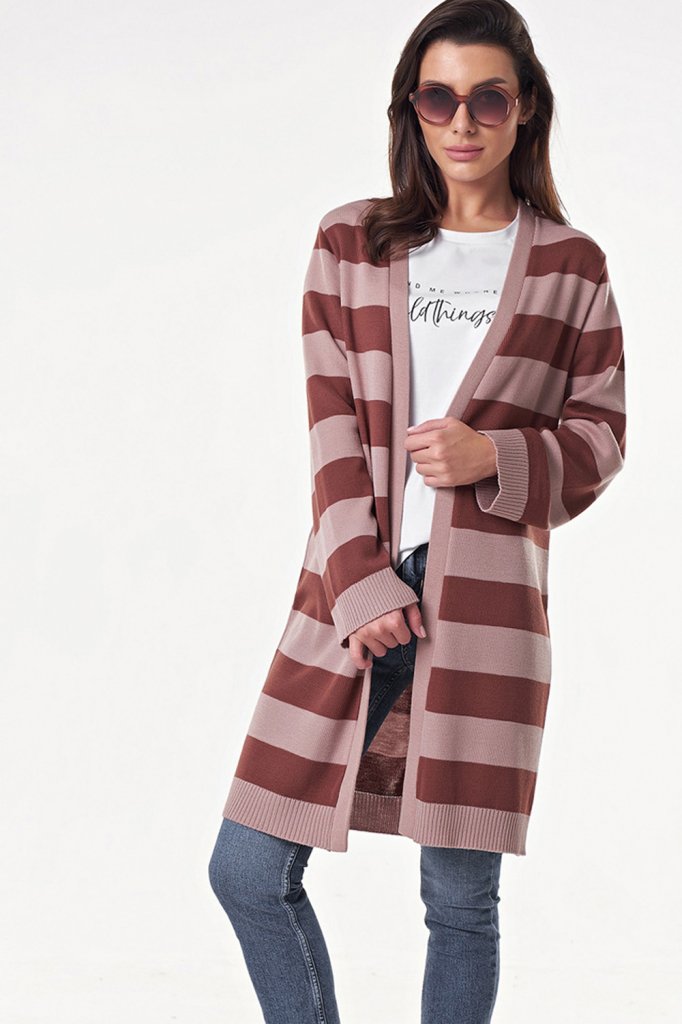 Особенности: Вязаный двухцветный кардиган прямого силуэта выполнен из полушерстяной пряжи. Кардиган оформлен контрастной обтачкой по переду. Рукава широкие оформлены резинкой