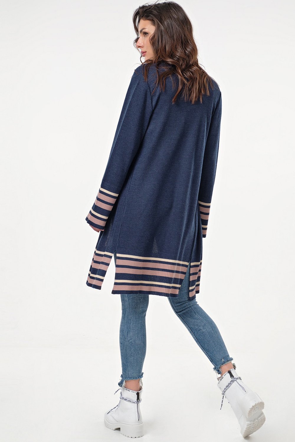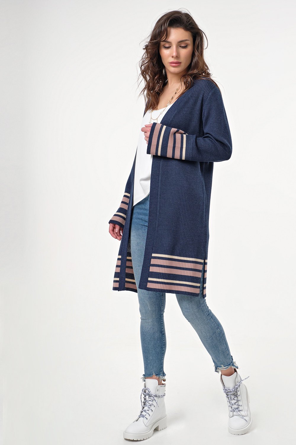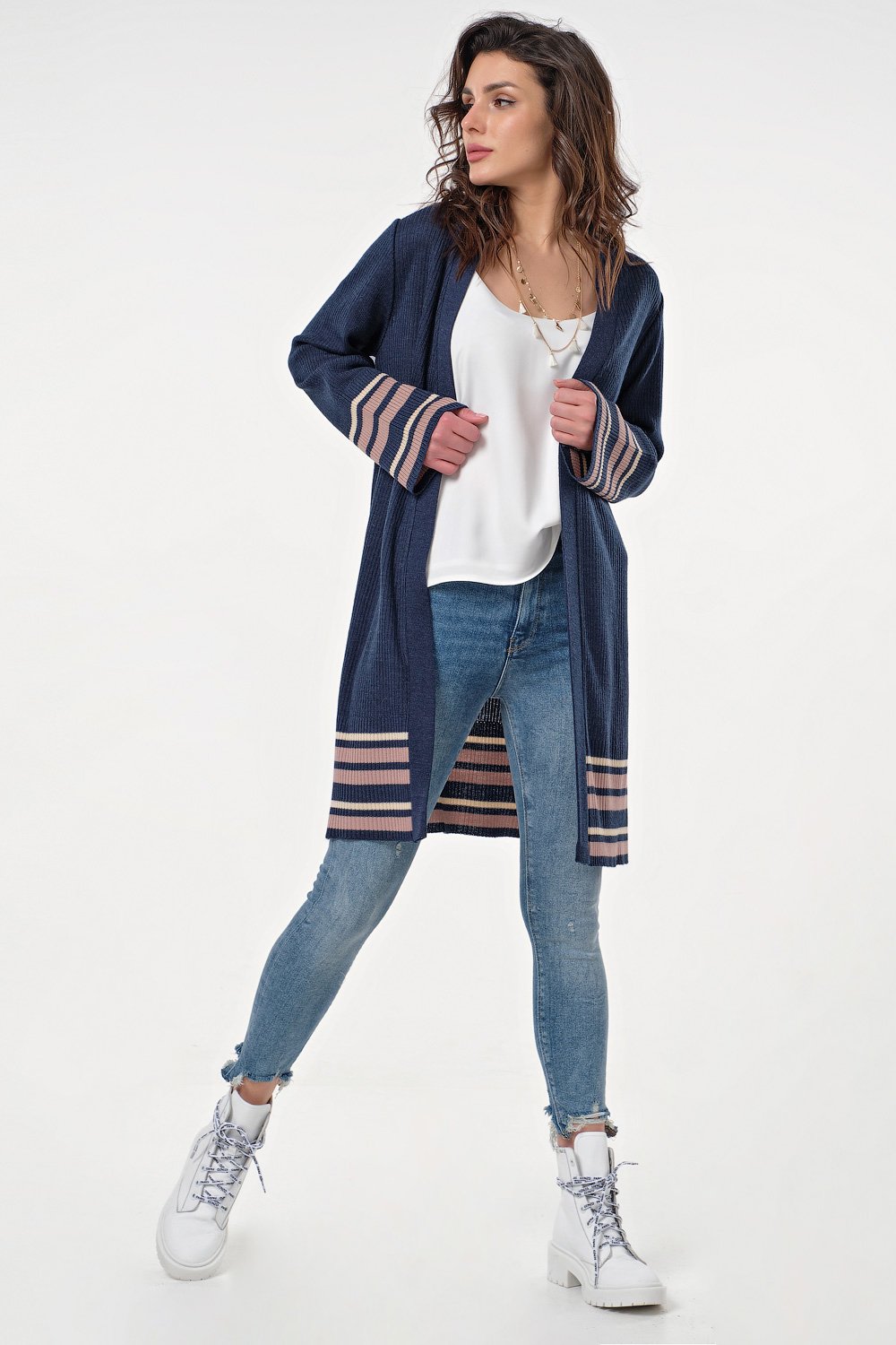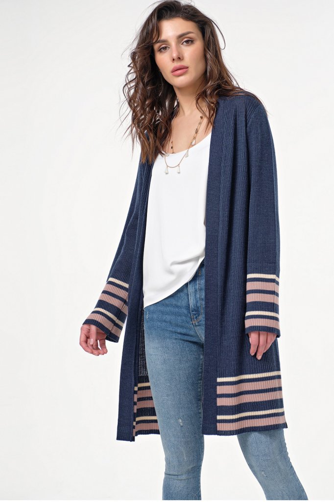 Особенности: Вязаный кардиган прямого силуэта выполнен из полушерстяной пряжи с широкой декоративной резинкой. Кардиган оформлен обтачкой по переду плавно переходящий на спинку. Рукава трубы оформлены декоративной резинкой.