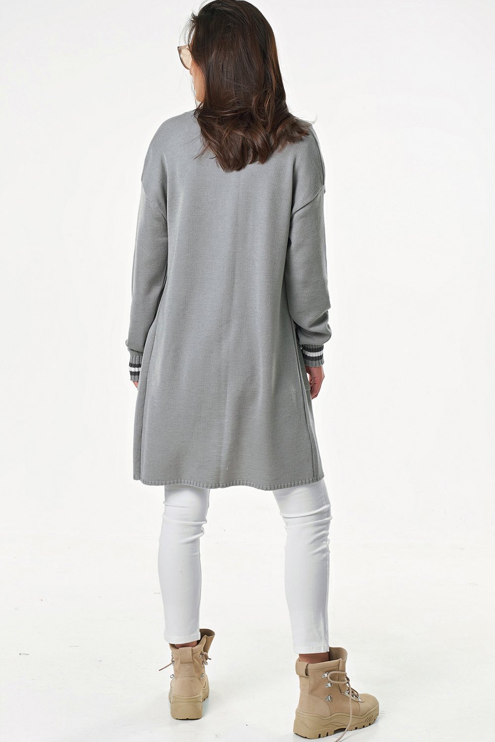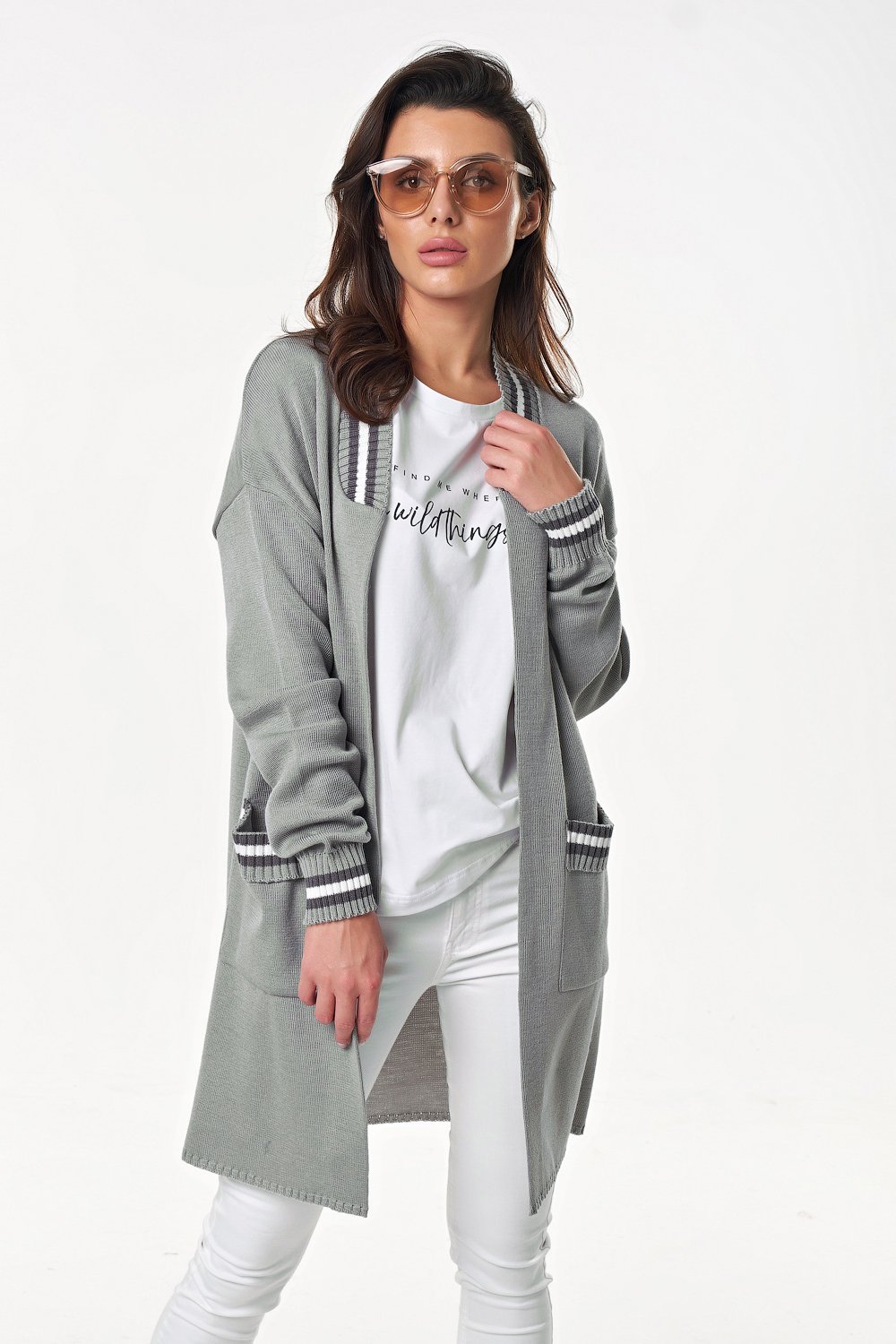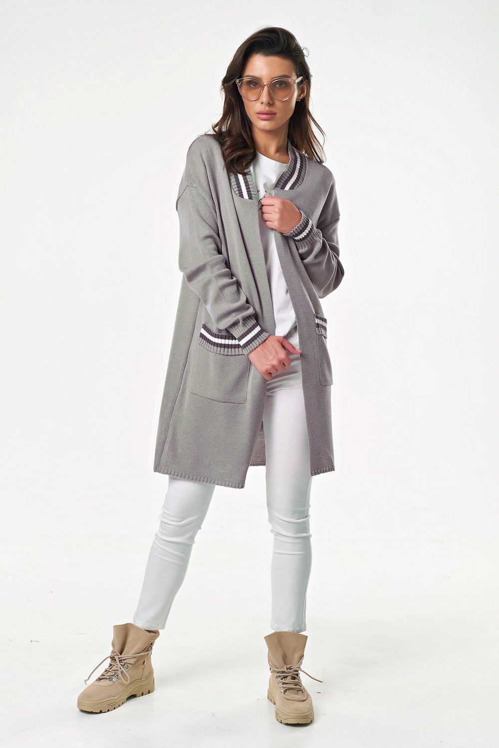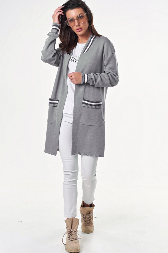 Особенности: Мягкий тонкий кардиган с контрастной отделкой по рукавам, горловине и на карманах.