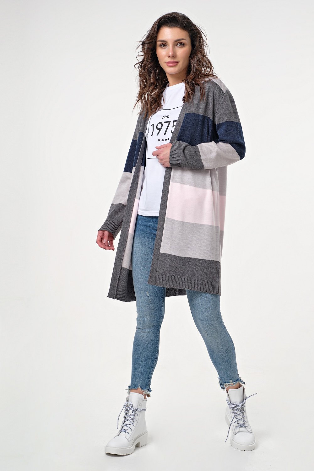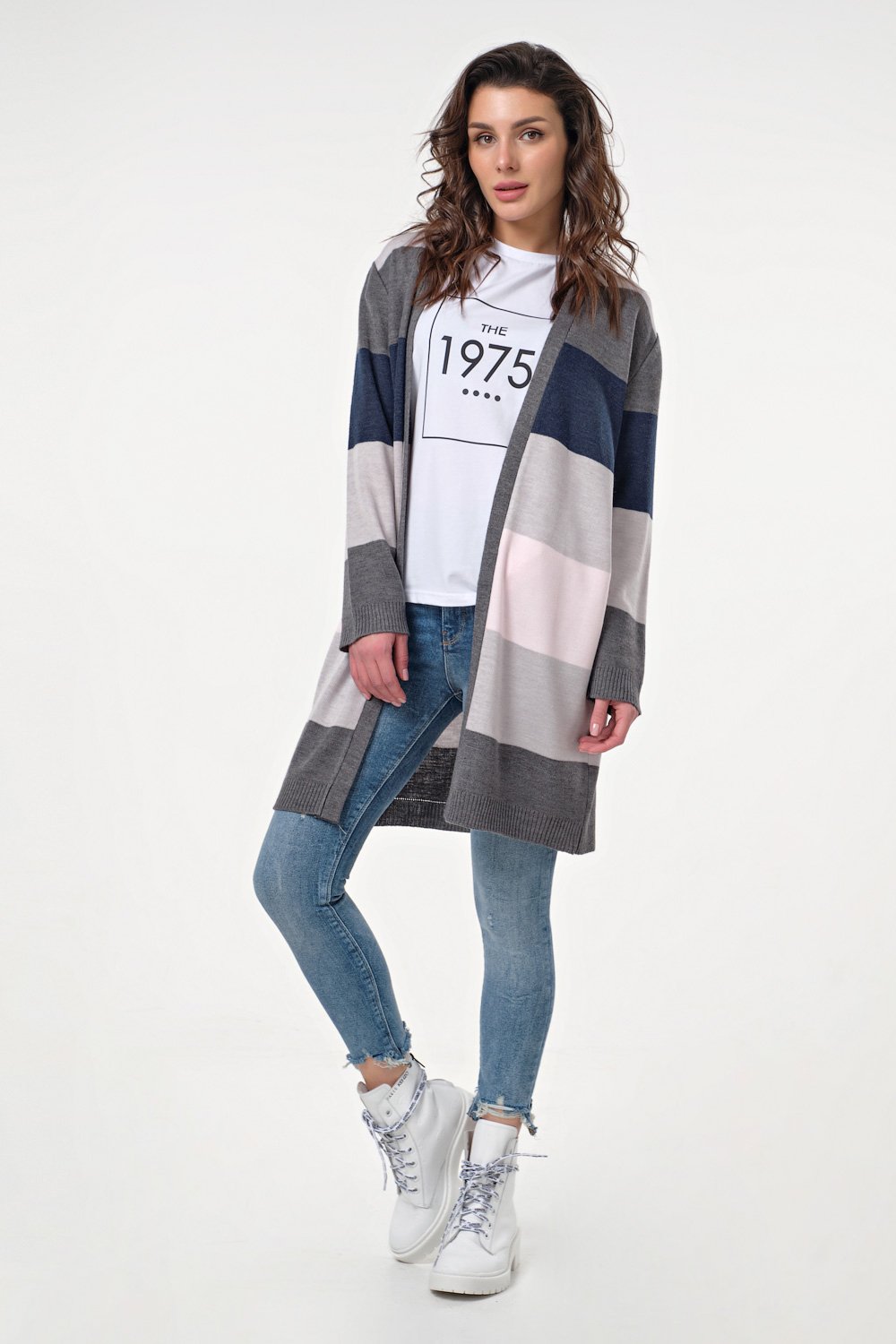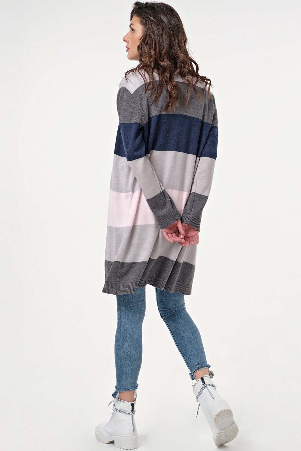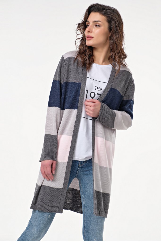 Особенности: Вязаный кардиган в широкие контрастные полоски прямого силуэта выполнен из полушерстяной пряжи. Кардиган оформлен широкой контрастной обтачкой по переду. Низ изделия и рукавов оформлены резинкой.