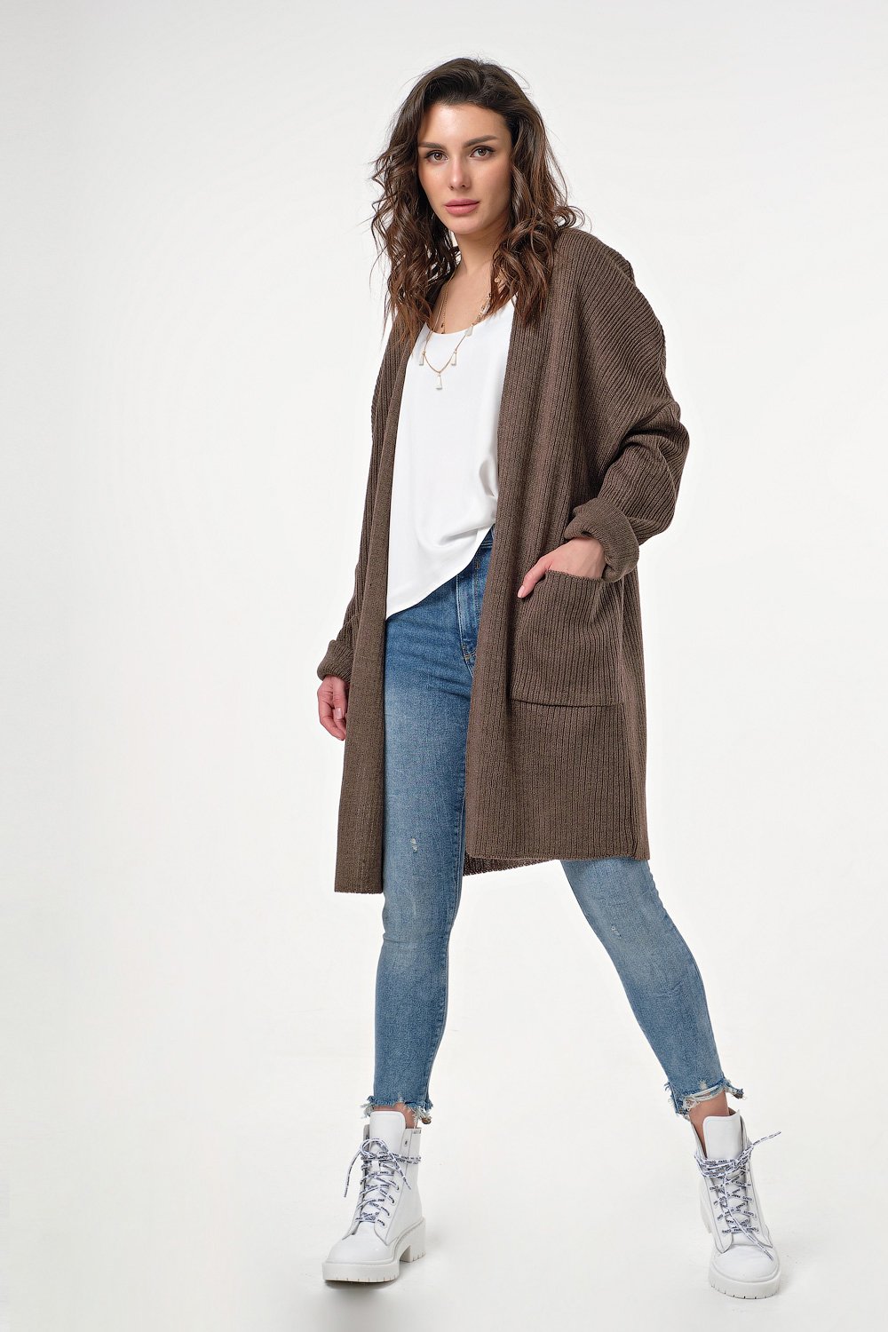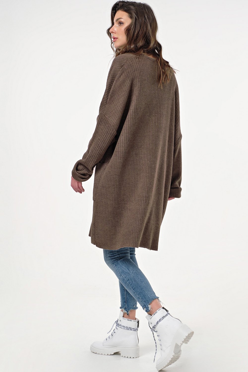 Особенности: Объемный, вязаный кардиган, выполнен фактурной вязкой из полушерстяной пряжи.