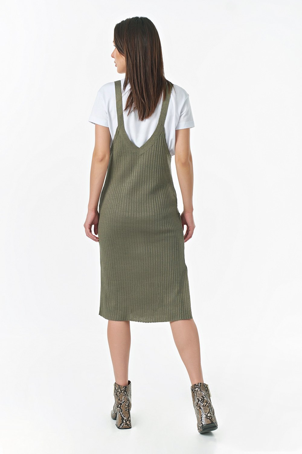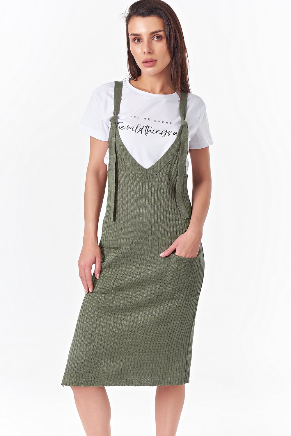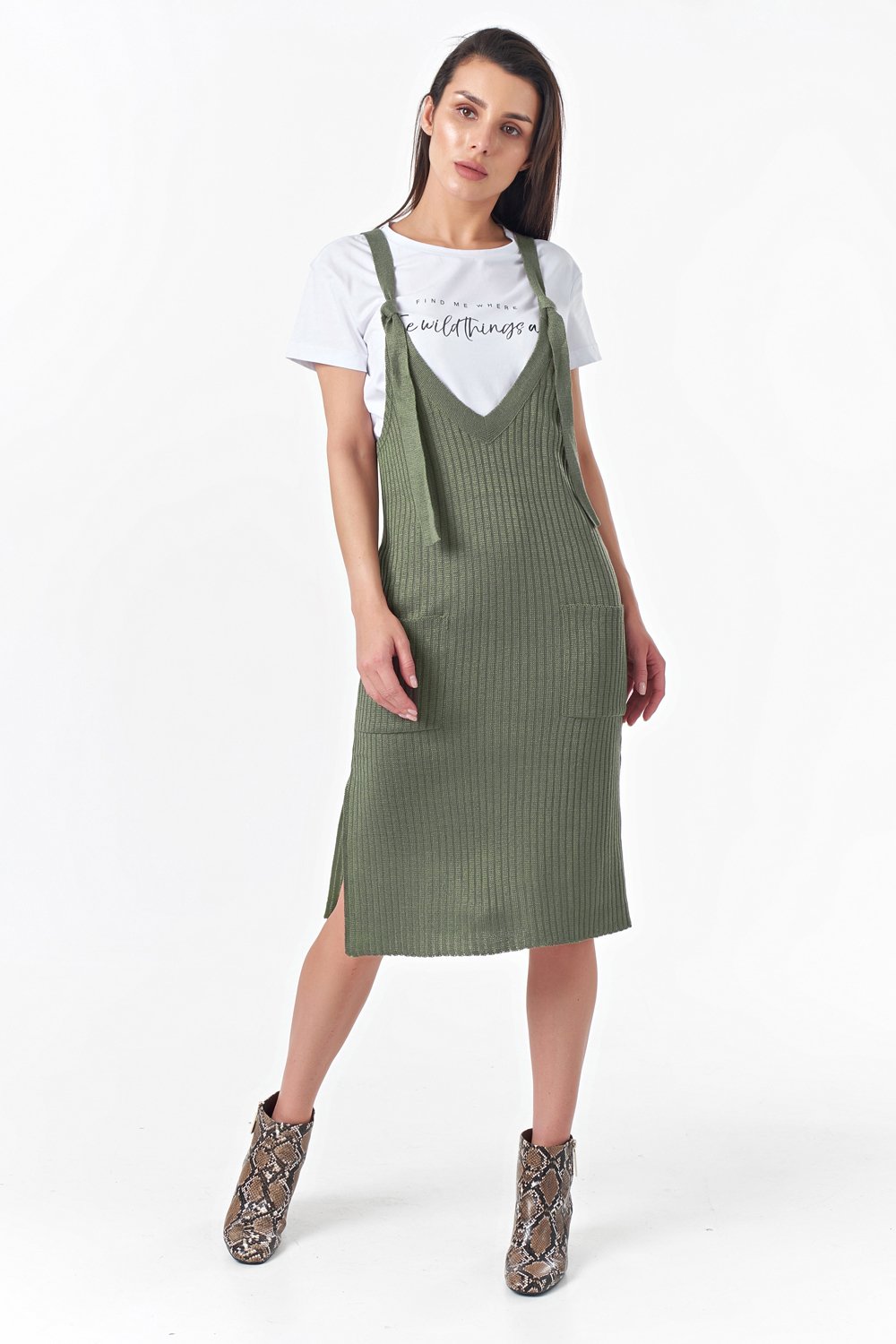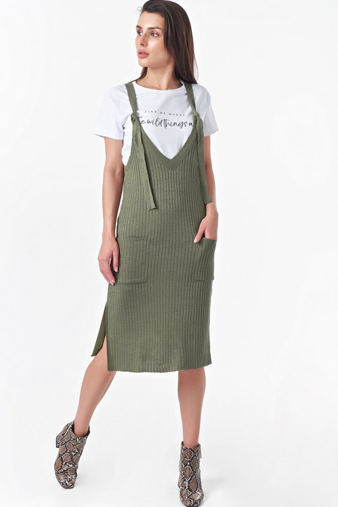 Удлиненный вязаный сарафан выполнен фактурной вязкой из смесовой пряжи с содержанием шерсти и хлопка. Сарафан имеет V- образные вырезы по спинке и полочке и один боковой разрез (справа). На полочке изделия имеются 2 накладных кармана. Бретели сарафана регулируются узлом. Длина изделия по спинке 88 см (44, 48 р), длина бретелей 12-17 см.