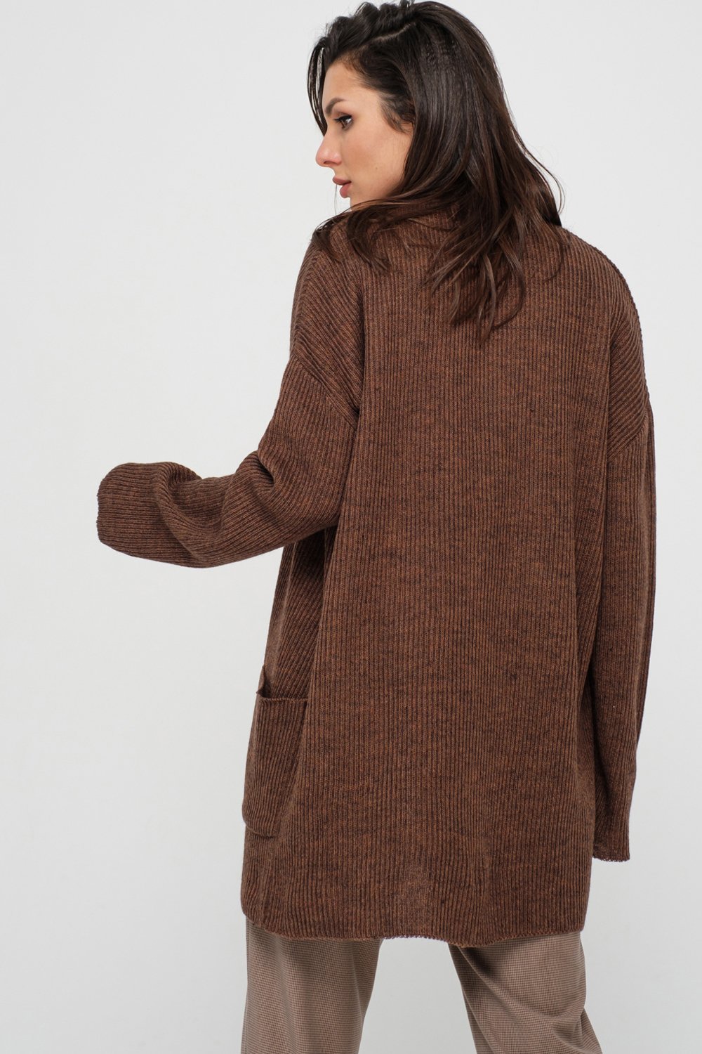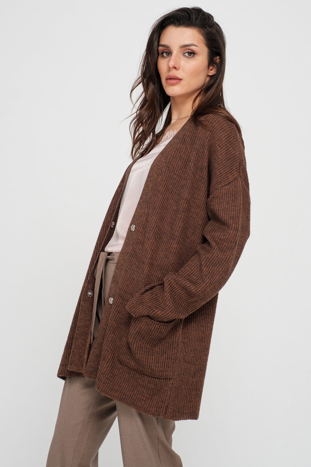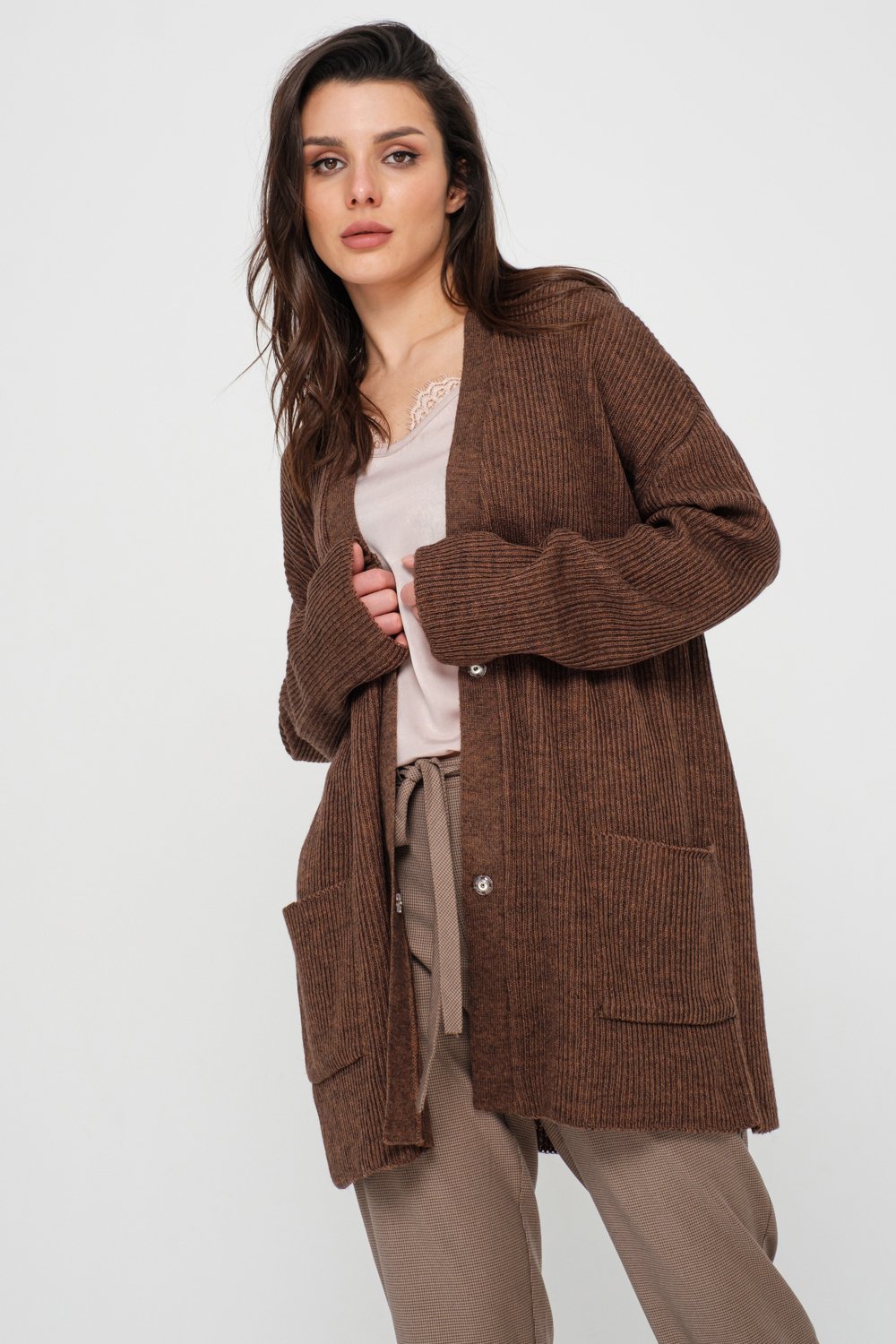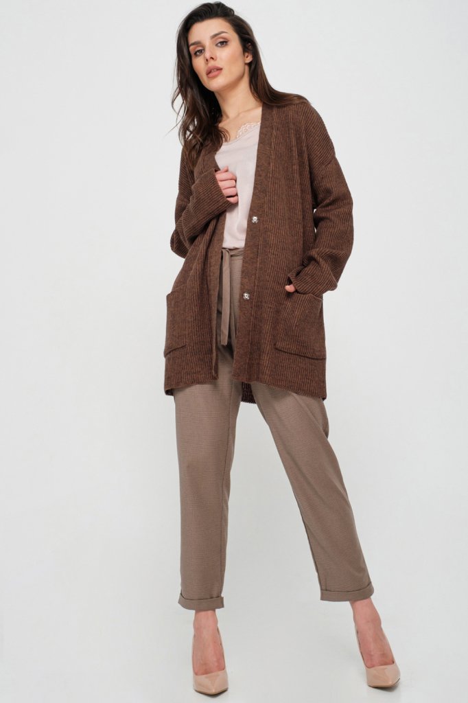 Особенности: Кардиган выполнен из смесовой пряжи фактурной вязкой. Перед кардигана обработан широкой бейкой. Рукава, низ изделия без резинки.