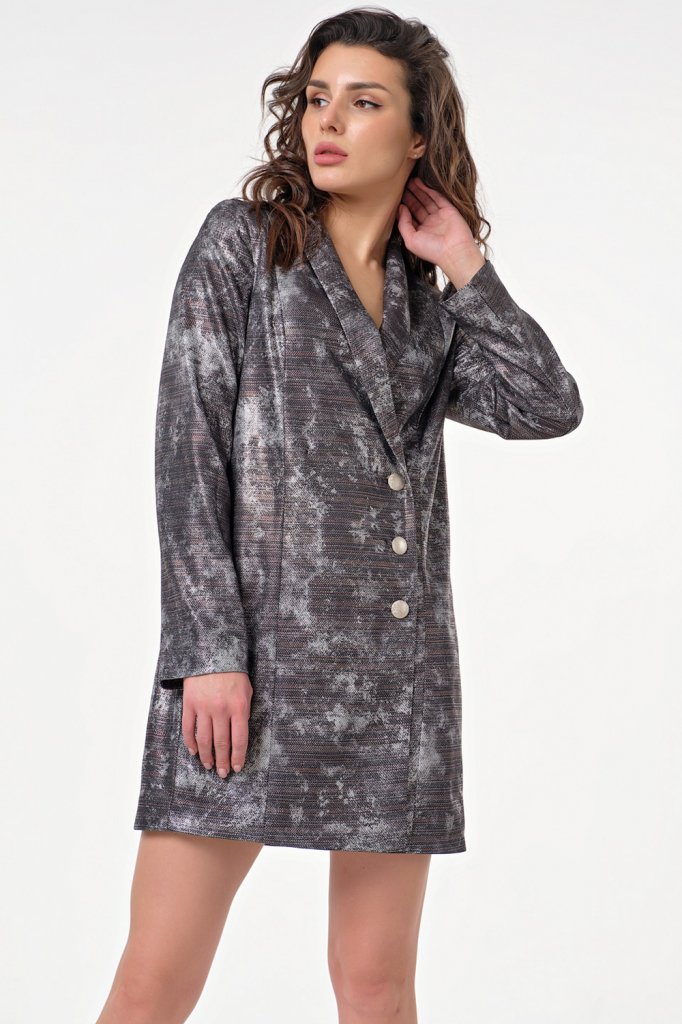 • Особенности: Платье-жакет прямого силуэта из фактурной ткани с напылением на подкладке. Детали: смещенная застежка, шалевый воротник, длинный втачной рукав.