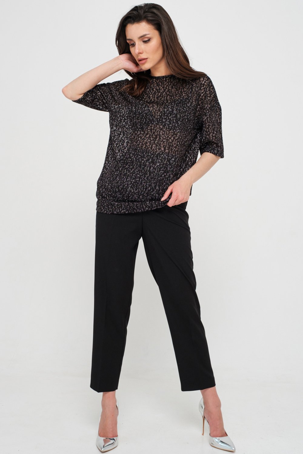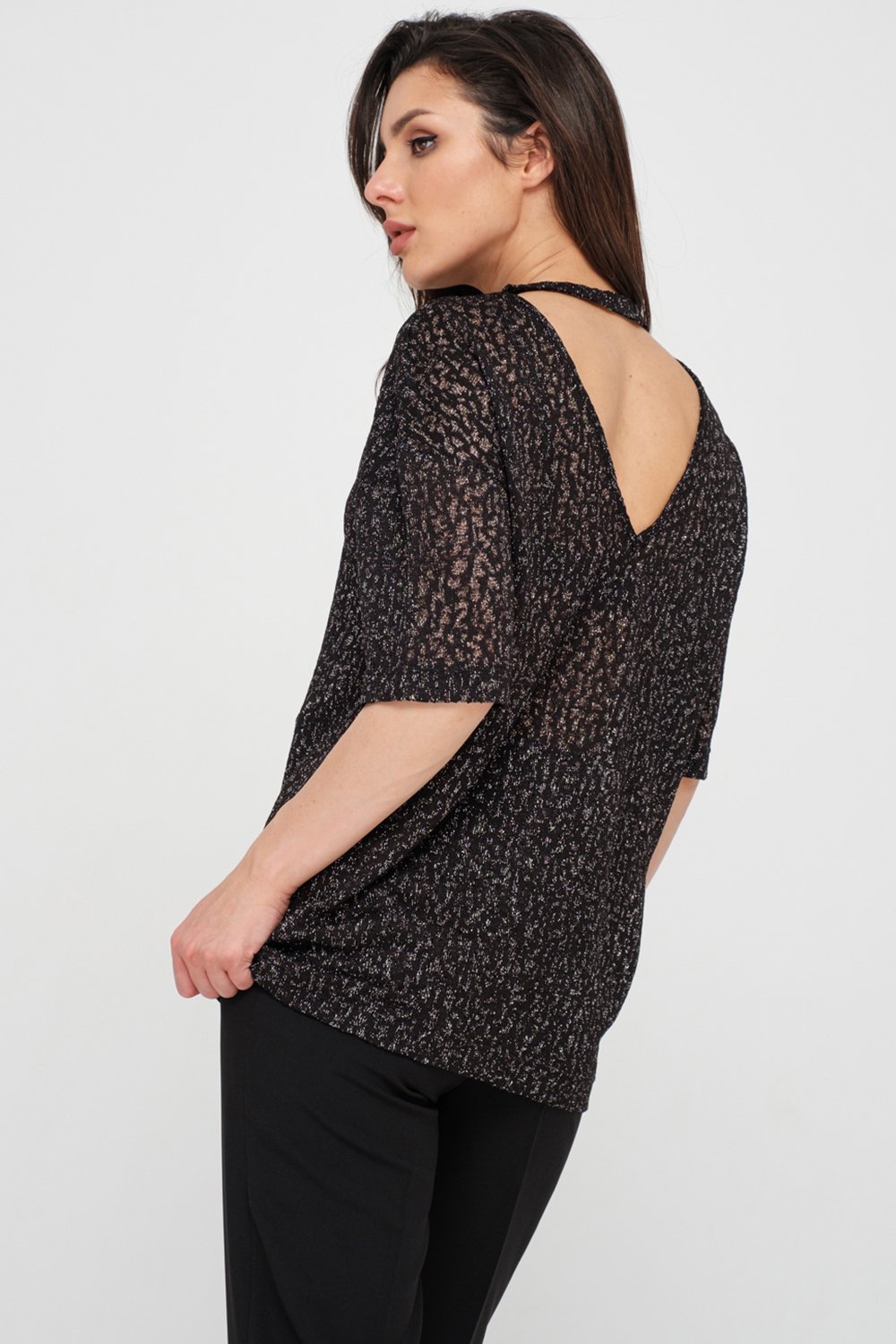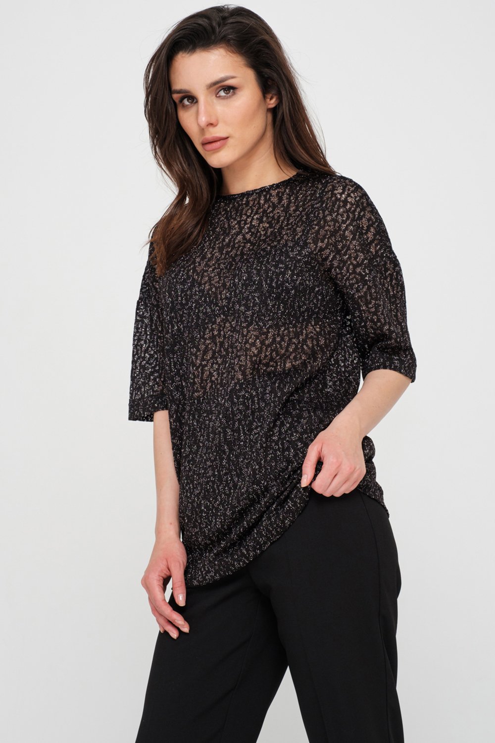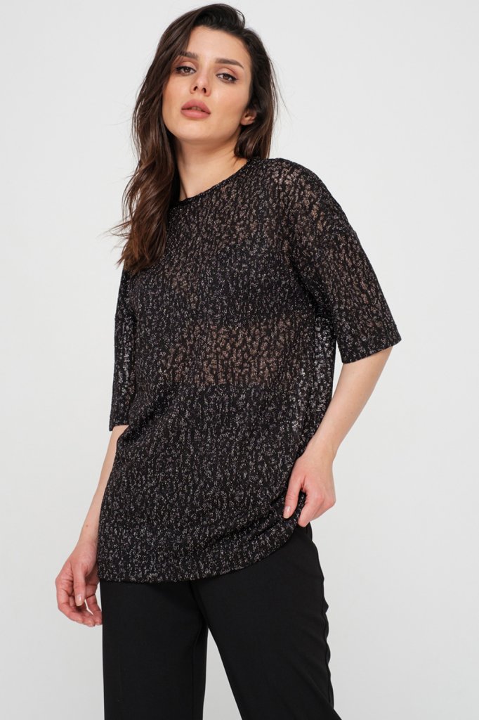 • Особенности: Туника из фактурного ажурного трикотажа с люрексом. Детали: горловина обработана окантовкой, рукав до локтя, по спинке - V-образный вырез и бейка.