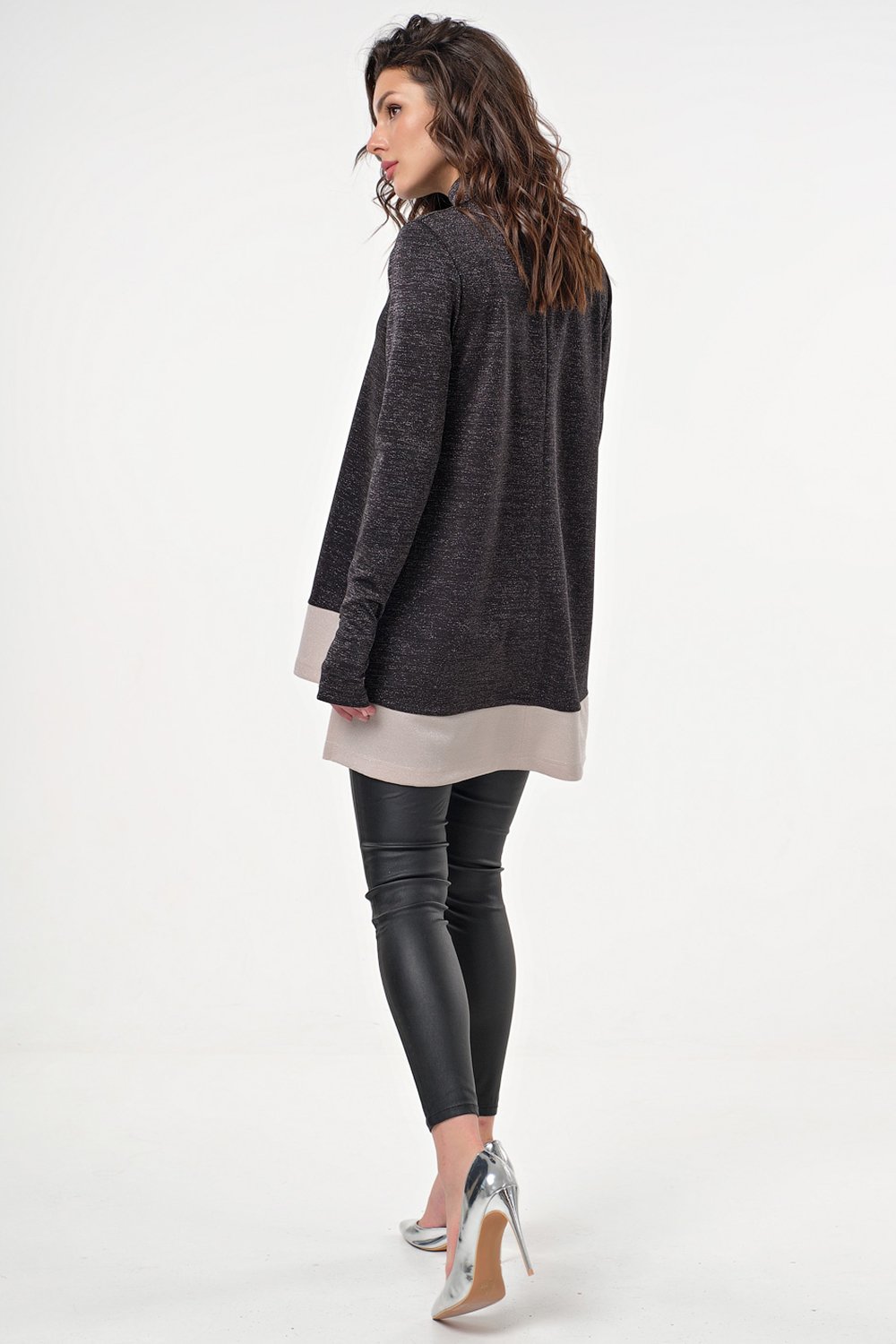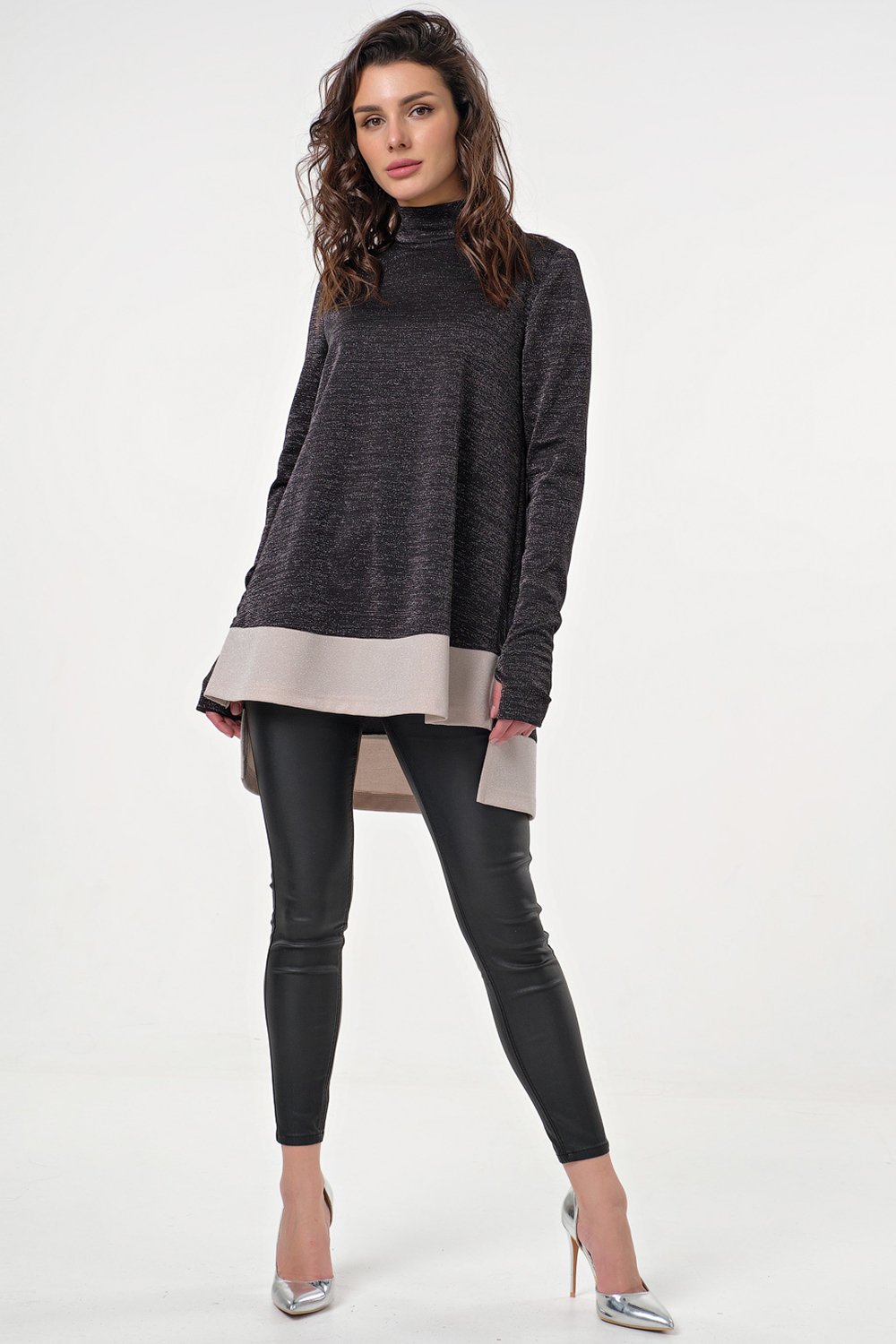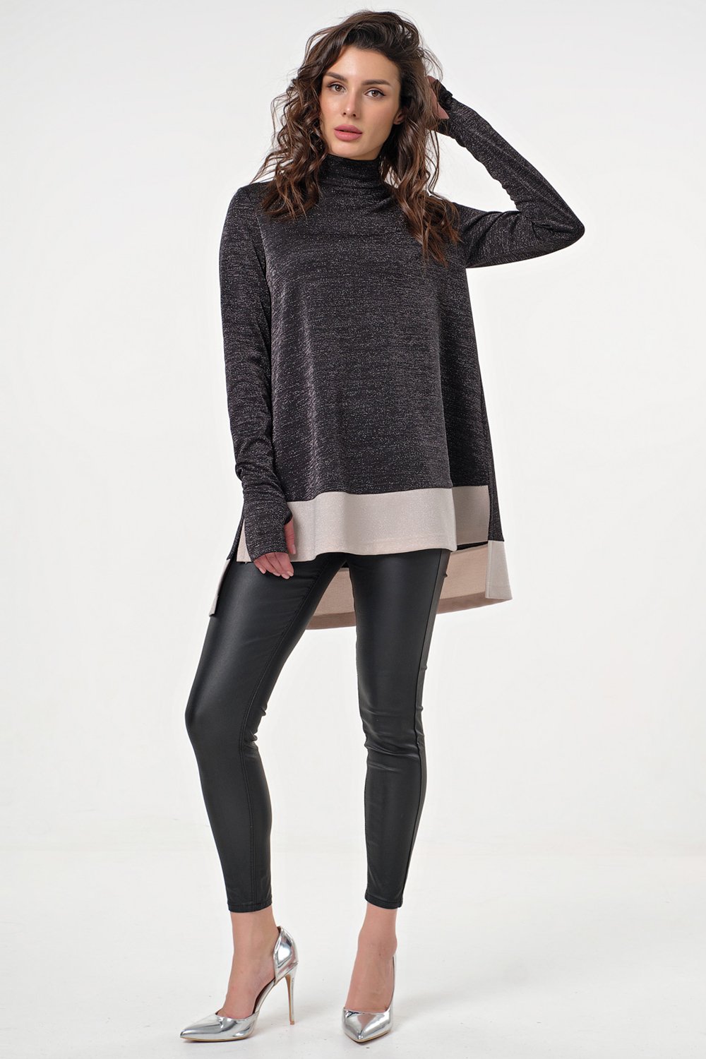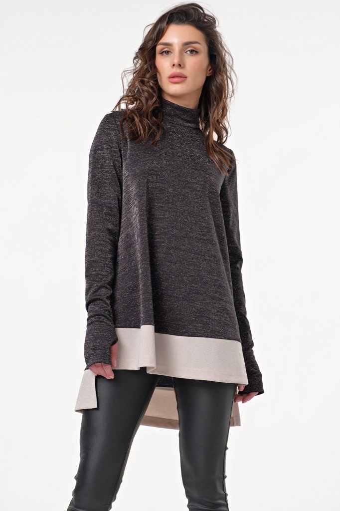 • Особенности: Туника свободного силуэта из трикотажа с люрексом. Детали: удлиненный зауженный рукав с отверстием для пальца, воротник-стойка, спинка удлинена относительно переда на 10 см, в боковых швах выполнены разрезы, по низу туники выполнена широкая полоса контрастного цвета. Застежка в среднем шве спинки на молнию.