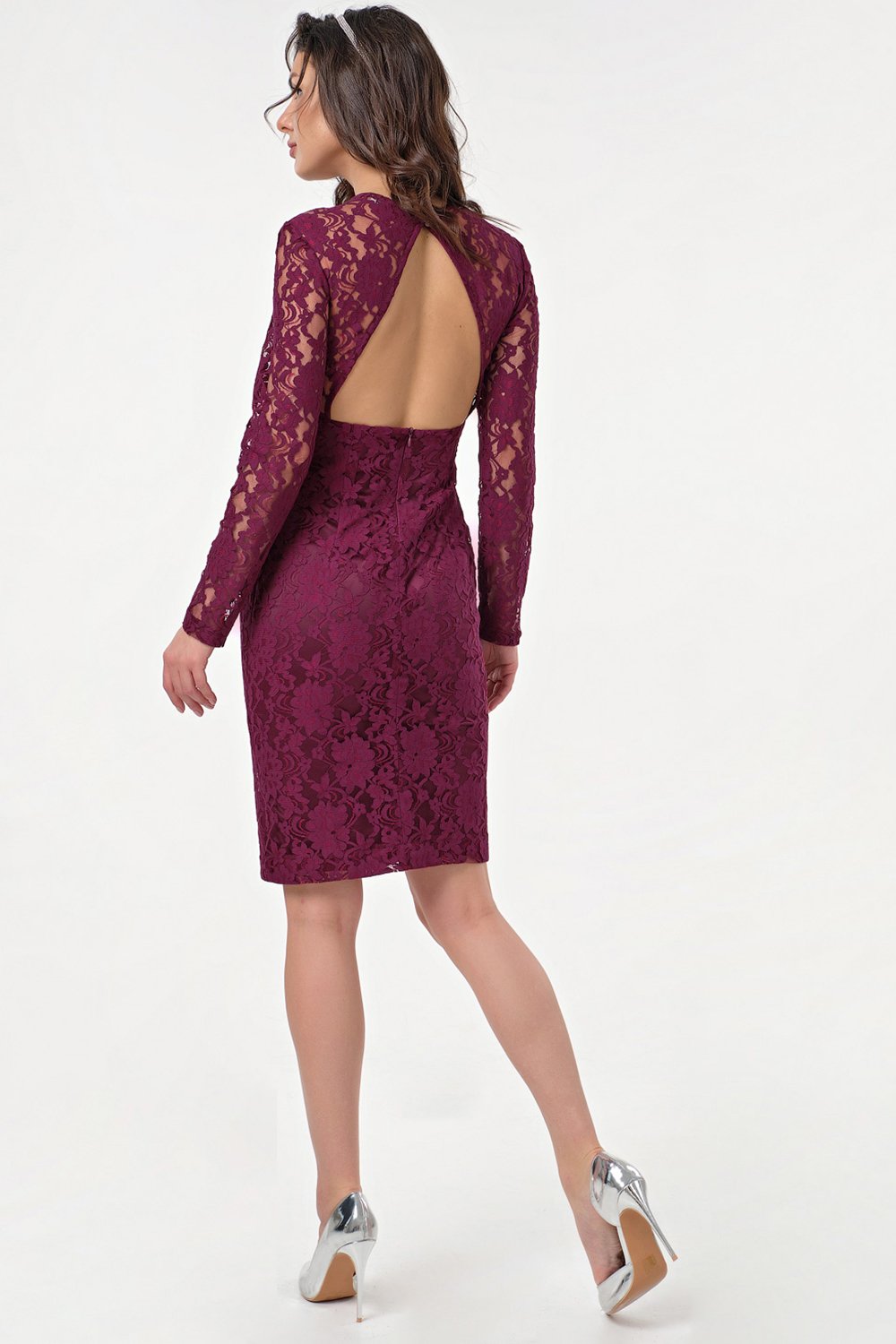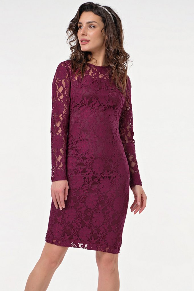 • Особенности: Платье прилегающего силуэта из кружева, частично на подкладке. Детали: по переду - фигурные вытачки, длинный втачной рукав; по спинке - фигурный вырез, застежка на петлю-пуговицу по горловине и на потайную молнию по юбке.
