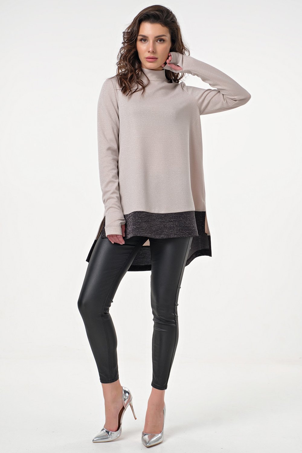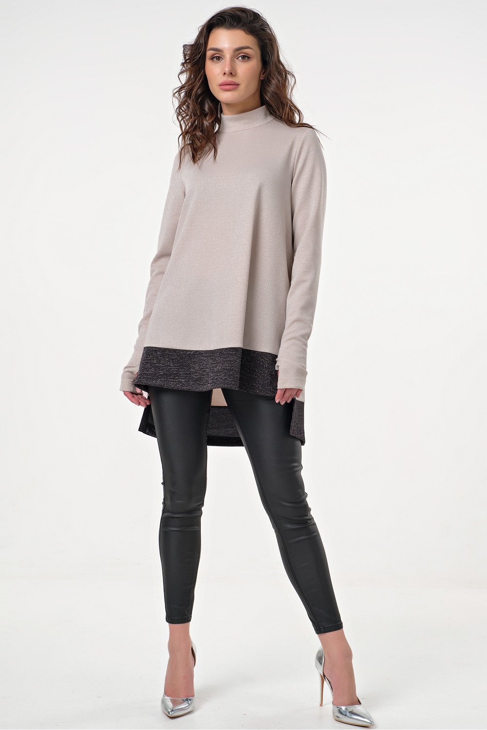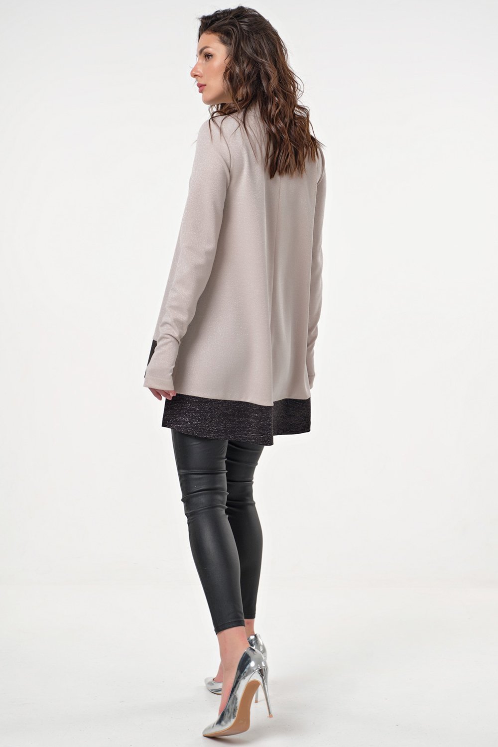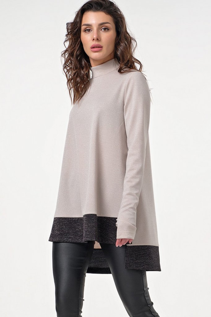 • Особенности: Туника свободного силуэта из трикотажа с люрексом. Детали: удлиненный зауженный рукав с отверстием для пальца, воротник-стойка, спинка удлинена относительно переда на 10 см, в боковых швах выполнены разрезы, по низу туники выполнена широкая полоса контрастного цвета. Застежка в среднем шве спинки на молнию.