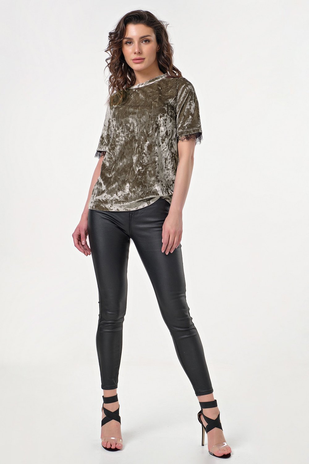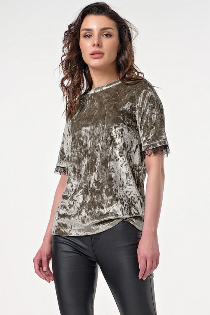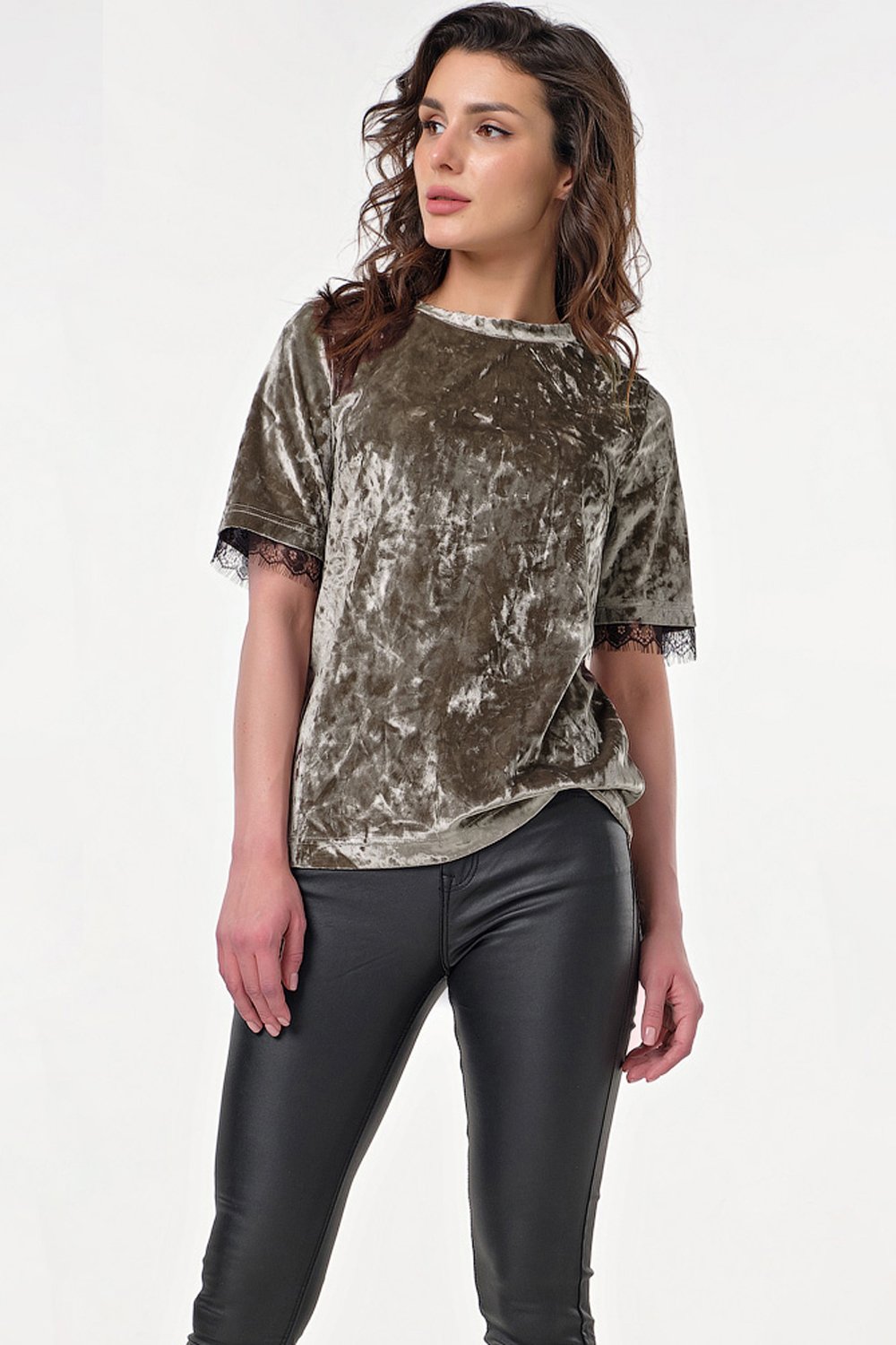 • Особенности: Футболка прямого силуэта из бархата. Детали: горловина обработана бейкой, рукав втачной с отделкой кружевом по низу.