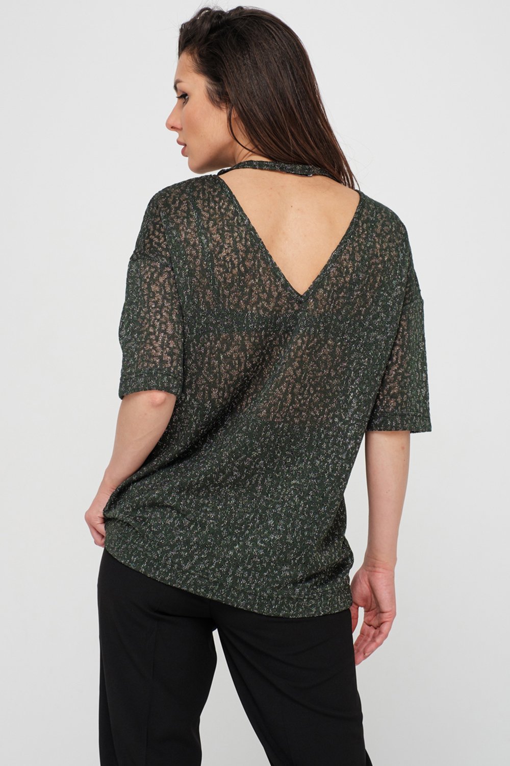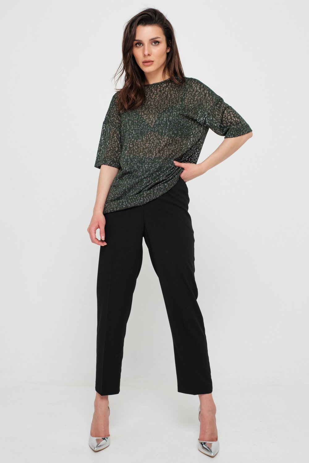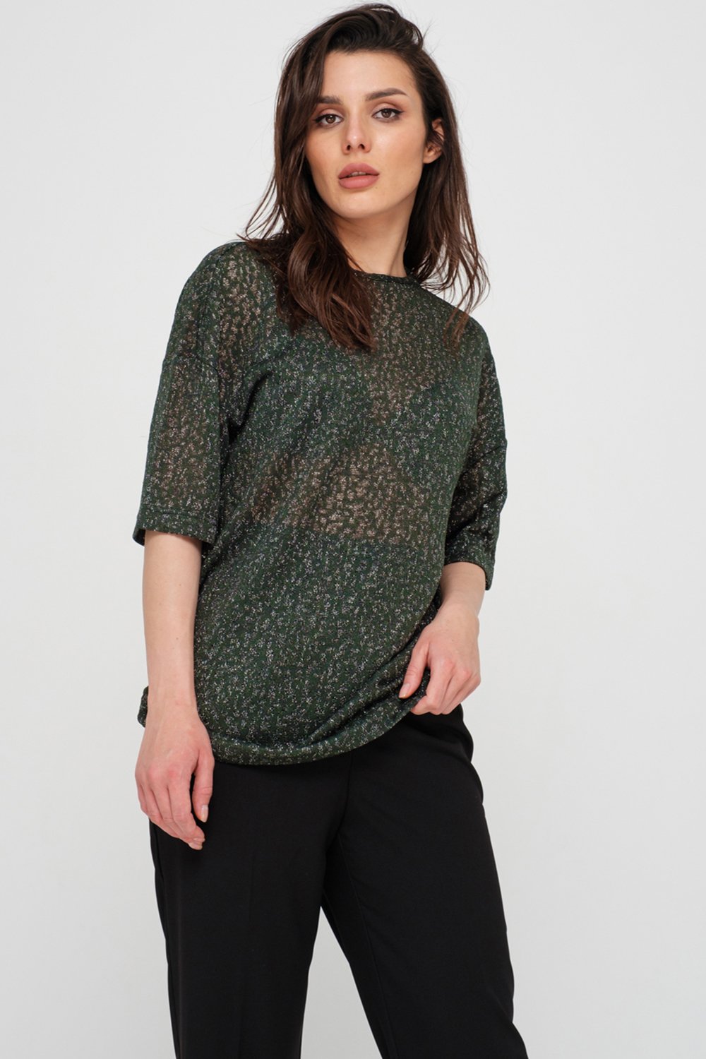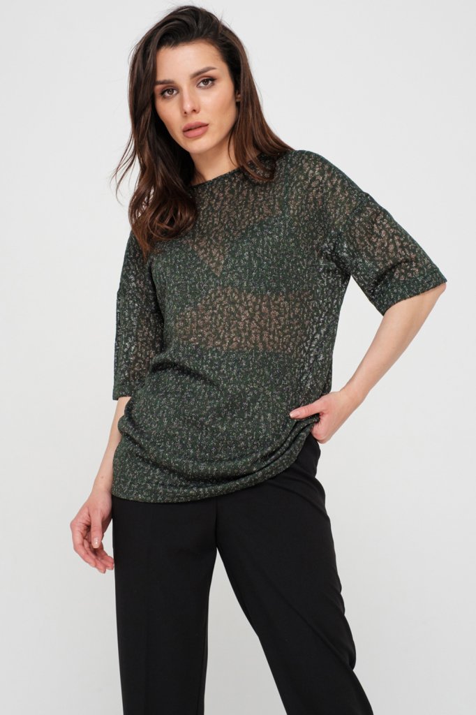 • Особенности: Туника из фактурного ажурного трикотажа с люрексом. Детали: горловина обработана окантовкой, рукав до локтя, по спинке - V-образный вырез и бейка.