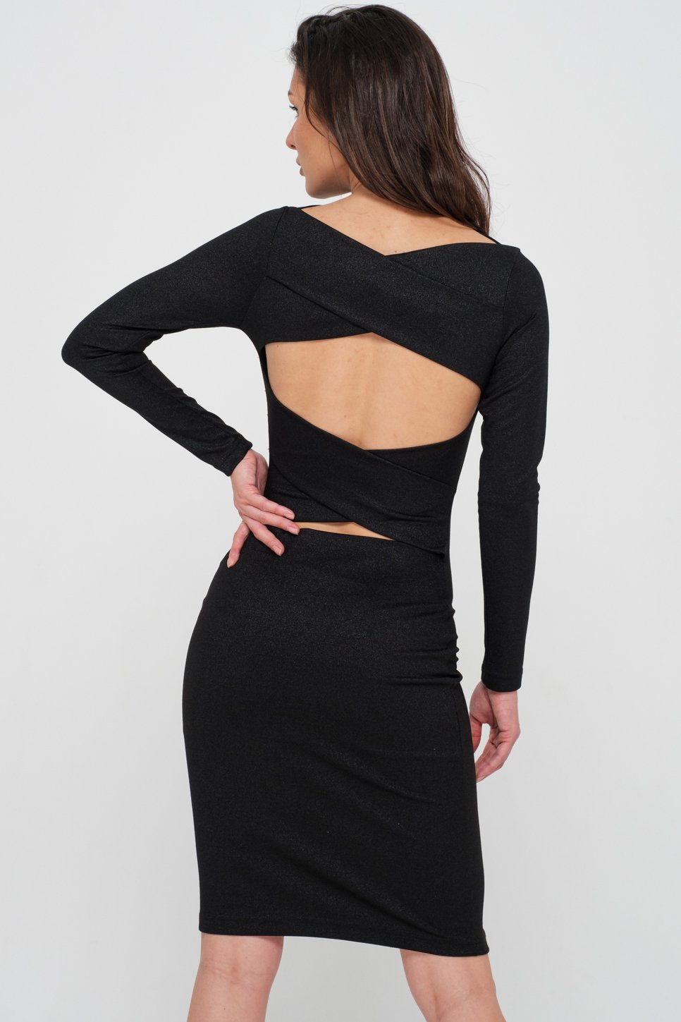 • Особенности: Платье выполнено из трикотажа с люрексом, силуэт приталенный, на спинке - вырез, оформленный двумя широкими крестообразными перехватами.