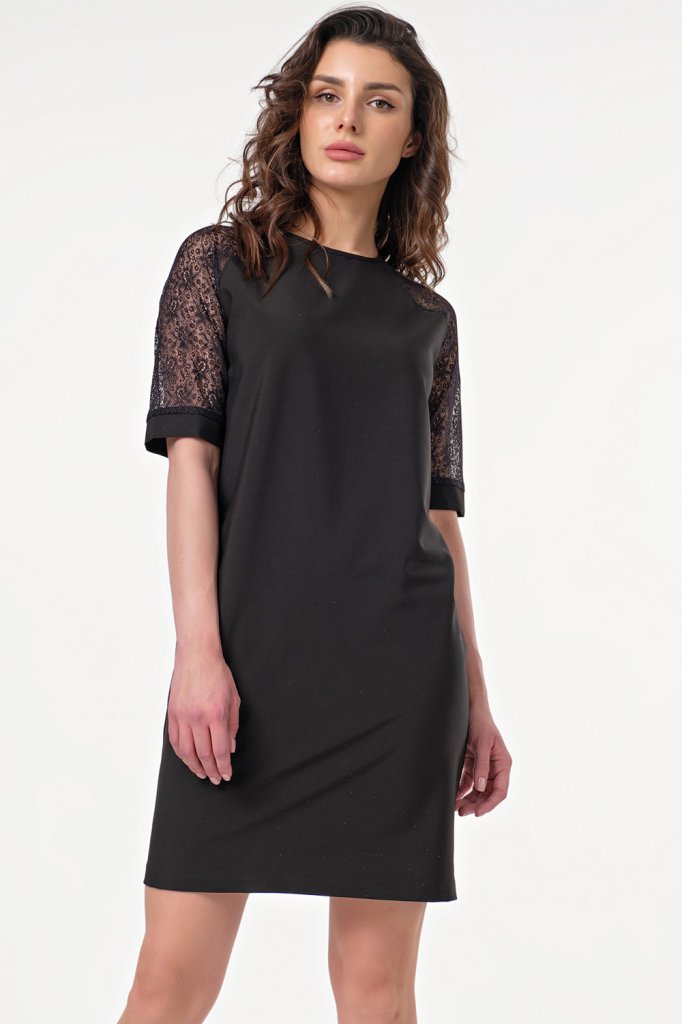 • Особенности: Платье прямого силуэта из костюмной ткани. Детали: рукав-реглан выполнен из кружева, притачные манжеты, горловина округлой формы, обработана бейкой.