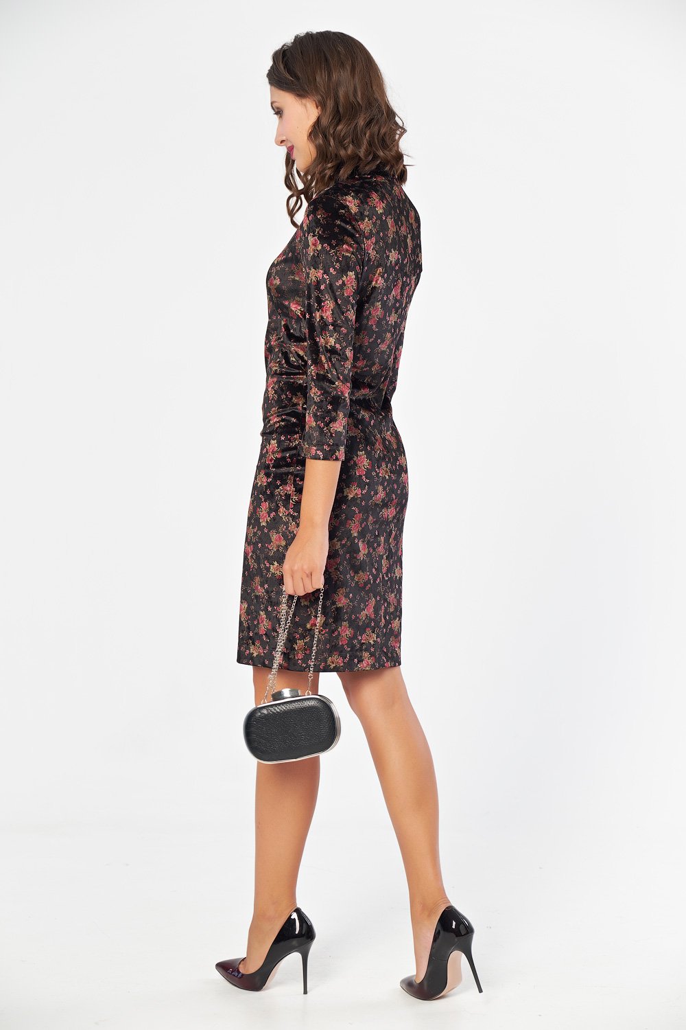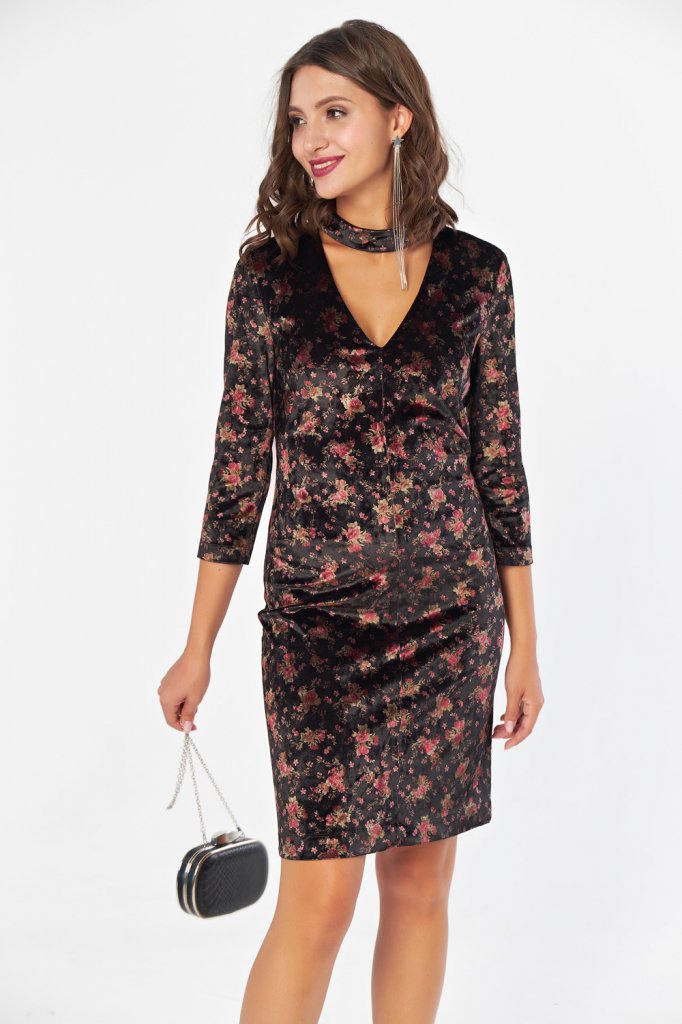 • Особенности: Платье из бархата полуприлегающего силуэта. Рукав втачной длиной 3/4. Детали:V-образный вырез, декоративный воротник-стойка, цветочный принт. Застежка по спинке на молнию.