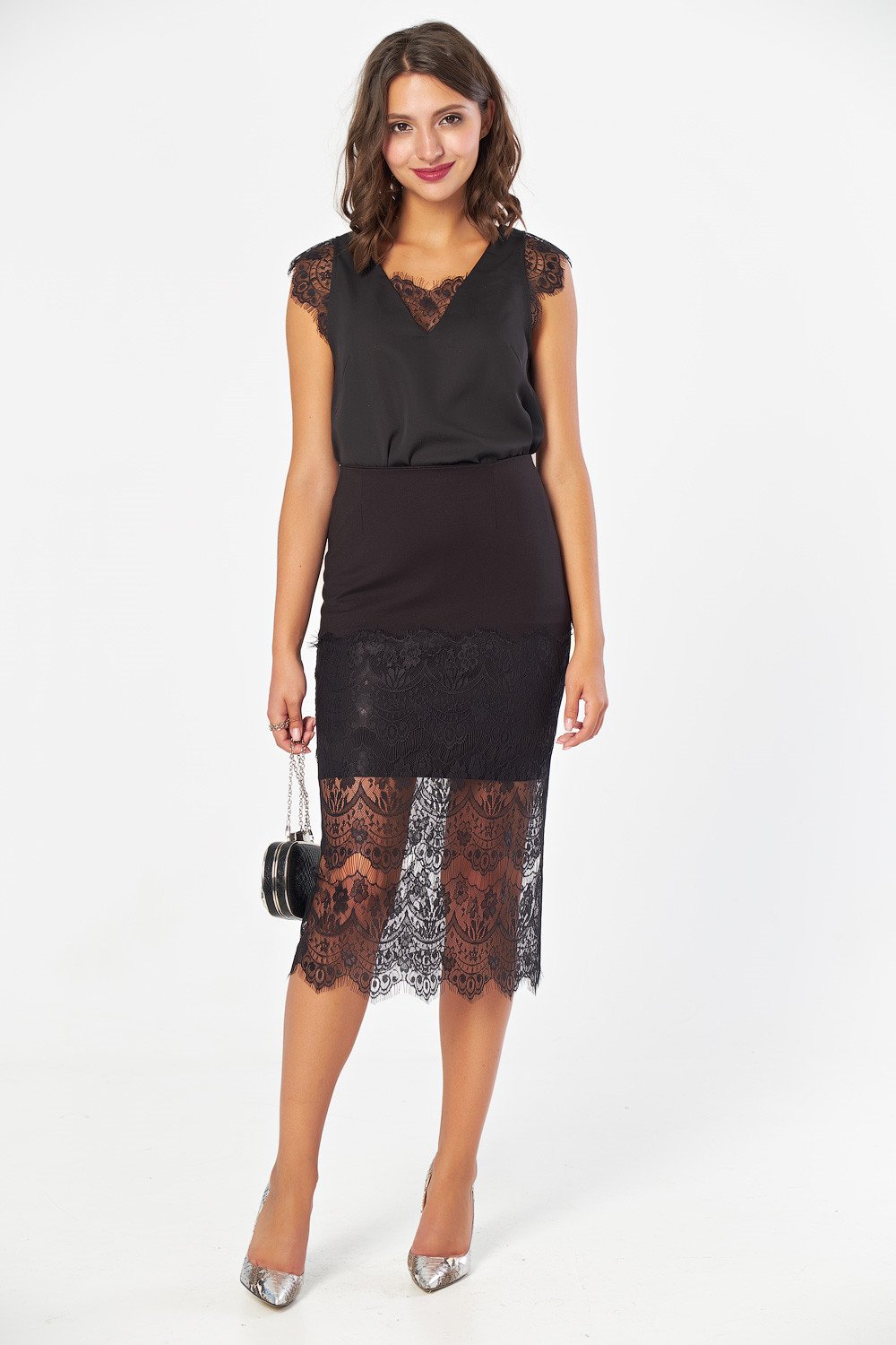 • Особенности: Юбка прилегающего силуэта из плотного трикотажа с кружевной отделкой. По верхнему краю юбки - вытачки, пояс-обтачка, застежка на потайную тесьму-молнию.