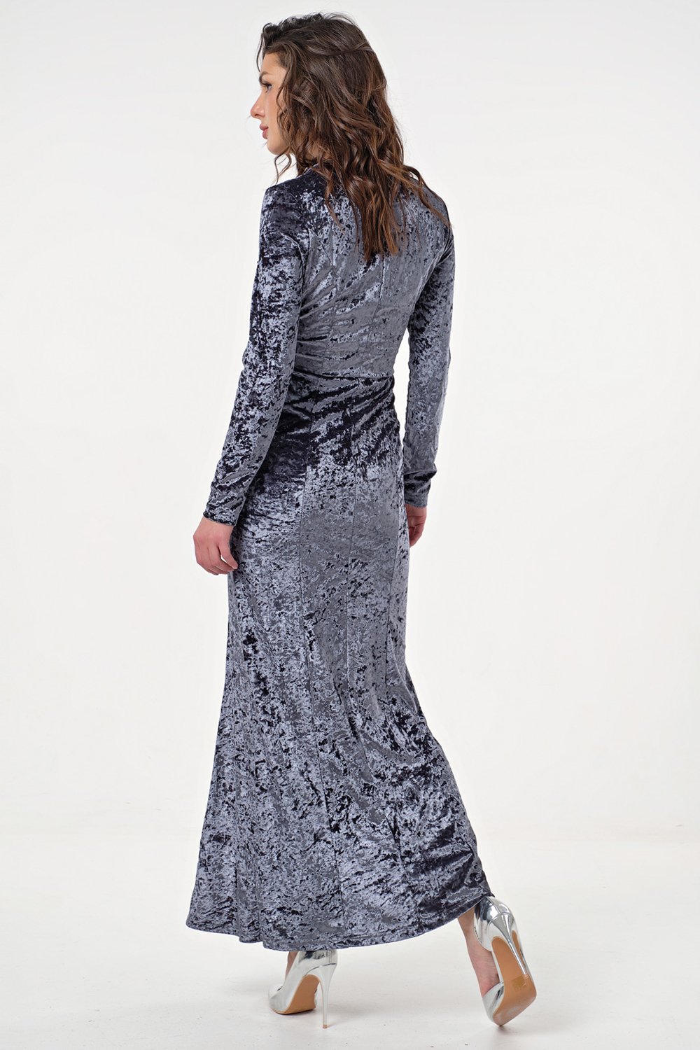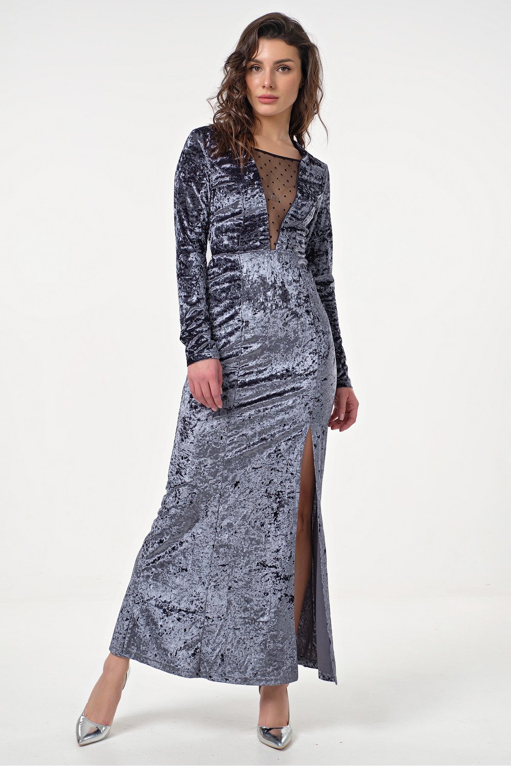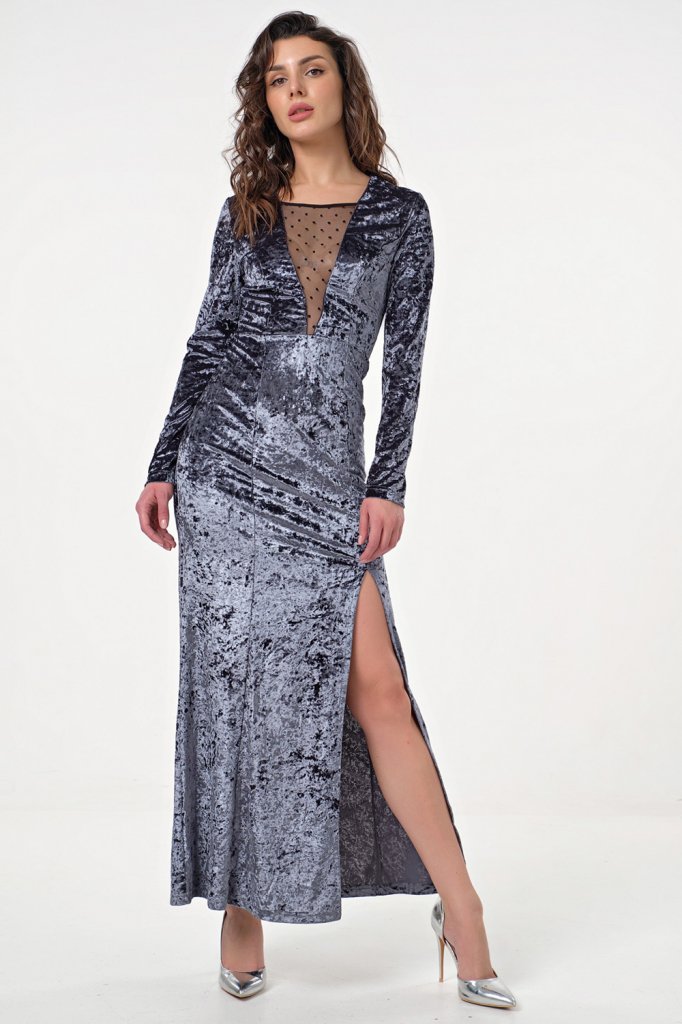 • Особенности: бархатное платье макси с сетчатой вставкой и высоким разрезом